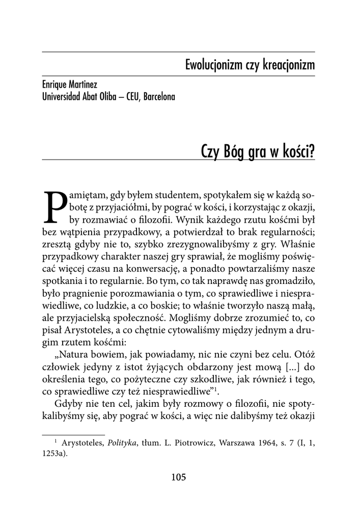 Ewolucjonizm czy kreacjonizm Enrique Martinez Universidad Abat Oliba – CEU, Barcelona Czy Bóg gra w kości? P amiętam, gdy byłem studentem, spotykałem się w każdą sobotę z przyjaciółmi, by pograć w kości, i korzystając z okazji, by rozmawiać o filozofii. Wynik każdego rzutu kośćmi był bez wątpienia przypadkowy, a potwierdzał to brak regularności; zresztą gdyby nie to, szybko zrezygnowalibyśmy z gry. Właśnie przypadkowy charakter naszej gry sprawiał, że mogliśmy poświęcać więcej czasu na konwersację, a ponadto powtarzaliśmy nasze spotkania i to regularnie. Bo tym, co tak naprawdę nas gromadziło, było pragnienie porozmawiania o tym, co sprawiedliwe i niesprawiedliwe, co ludzkie, a co boskie; to właśnie tworzyło naszą małą, ale przyjacielską społeczność. Mogliśmy dobrze zrozumieć to, co pisał Arystoteles, a co chętnie cytowaliśmy między jednym a drugim rzutem kośćmi: „Natura bowiem, jak powiadamy, nic nie czyni bez celu. Otóż człowiek jedyny z istot żyjących obdarzony jest mową [...] do określenia tego, co pożyteczne czy szkodliwe, jak również i tego, co sprawiedliwe czy też niesprawiedliwe”1. Gdyby nie ten cel, jakim były rozmowy o filozofii, nie spotykalibyśmy się, aby pograć w kości, a więc nie dalibyśmy też okazji 1 Arystoteles, Polityka, tłum. L. Piotrowicz, Warszawa 1964, s. 7 (I, 1, 1253a). 105 Enrique Martinez przypadkowi. Oczywiście, gra w kości może opierać się na przypadku, ale w kości nie gra się przypadkowo. Albert Einstein odwołał się do tej właśnie gry, aby zilustrować swój ogólny sposób rozumienia natury, stwierdzając, że „Bóg nie gra w kości”. Działo się to podczas V konferencji Solvay, która miała miejsce w Brukseli w październiku 1927, a która jest uważana za moment inaugurujący powstanie mechaniki kwantowej. Mechanika ta wyjaśniała naturę w świetle zasady nieoznaczoności, wychodząc z założenia, że nie można przewidzieć dokładnego momentu, w którym atom wyemituje kwant światła. Einstein nie mógł zgodzić się na taki stopień niepewności, dlatego że to było niezgodne ze spinozjańskim determinizmem, który podzielał, i dlatego wypowiedział to zdanie: „Bóg nie gra w kości”, co Niels Bohr zripostował: „Panie Einstein, niech Pan nie mówi Bogu, co ma robić”2. Nie sądzę, by Einstein i Bohr grali w kości podczas konferencji Solvay, ale bez wątpienia nie spotkali się tam przypadkowo. Faktycznie, zainteresowanie było tak duże, że wspomniane konferencje odbywały się przez wiele lat. I nie bez racji, bo oprócz zagadnień należących wyłącznie do nauk ścisłych, dochodziło do rozmów dotyczących porządku samego bytu, jak to już widzieliśmy. Chodzi o to, że problem przypadkowości i celowości rozgrywa się na wielu poziomach epistemologicznych. Warto je tu wyróżnić, gdyż ich pomieszanie prowadzić może do niespodziewanych wniosków, a co gorsza, błędnych. Najpierw należy wyróżnić poziom zdroworozsądkowy, którego nie wolno zlekceważyć. On nas prowadzi do podziwu, którego powodem jest obecna w świecie przyrody regularność połączona 2 Cfr. P. Marage, G. Wallenborn, “Les Conseils Solvay et la Phisique Moderne”, en R. Halleux, J. Vandersmissen, A. Despy-Mayer, G. Vanpaemel (ed.), Histoire des Sciences en Belqique. 1815-2000, La Renaissance du Livre, Bruxelles, 2001, vol. 2, s. 109-121. 106 Czy Bóg gra w kości? z celowością i traktująca to, co zdarzy się niespodziewanie, jako coś przypadkowego. Poznanie zdroworozsądkowe prowadzi nas także do uznania, że niejednokrotnie my sami podejmujemy działania, których rezultaty pozostawiamy przypadkowi, jakbyśmy starali się naśladować naturę; dobrym tego przykładem są owe partie gry w kości z moimi przyjaciółmi. Na drugim poziomie epistemologicznym podejmowane są badania, w jakich stałych warunkach doszło do określonego wyniku w rzucie kośćmi albo do określonego zjawiska przyrodniczego, jak trzęsienie ziemi czy mutacja genetyczna. To jest poziom właściwy dla nauk przyrodniczych, które chcą określić w sposób racjonalny, głównie za pomocą obliczeń, stałe korelacje między doświadczeniami. Trzeci poziom epistemologiczny należy już do porządku filozoficznego, który nie zadawalając się korelacjami ustalonymi w ramach nauk empirycznych i wyrażonymi w formie matematycznej, pyta o przyczyny tych zjawisk: co je spowodowało i dlaczego? I tak pojawia się najbardziej charakterystyczna kwestia należąca do filozofii przyrody: czy istnieje celowość, czy też wszystko dzieje się przypadkowo? Czwarty poziom to poziom metafizyczny, w którym, mając przyczyny odnalezione na poziomie wcześniejszym, szuka się odpowiedzi ostatecznej; pytamy o ostateczną przyczynę celowości lub przypadku w przyrodzie, co pozwala na odniesienie się do pierwszej przyczyny porządkującej świat, którą nazywamy Bogiem. Należy dodać jeszcze wyższy poziom epistemologiczny, jest to poziom teologiczny, który dochodzi do swych wniosków w oparciu o zasady objawione przez Boga. Teologia jest, według słów papieża Benedykta VI, „nauką, która pyta się o rację wiary”, a która „powinna znaleźć miejsce na uniwersytecie i w szerokim dialogu nauk”3. 3 “In diesem Sinn gehört Theologie nicht nur als historische und humanwissenschaftliche Disziplin, sondern als eigentliche Theologie, als Frage nach 107 Enrique Martinez Dyskusja, którą prowadził Einstein, Bohr i inni fizycy w r. 1927 wykroczyła zdecydowanie poza granice nauk empirycznych, ponieważ dotyczyła rozważań o przyczynie wyjaśniającej procesy zachodzące na poziomie zjawisk naturalnych. Co więcej, Einstein odniósł się do przyczyny ostatecznej, gdy stwierdził, że „Bóg nie gra w kości”. Ale czy zrobił to w sposób właściwy? 1. Selekcja naturalna, ślepy zegarmistrz Jedna z najbardziej ożywionych dyskusji ostatnich dekad to ta, która dotyczy kwest