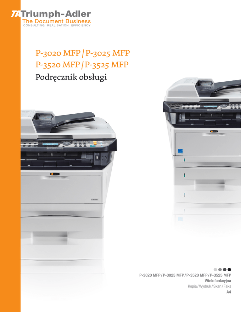 PL P-3020 MFP / P-3025 MFP P-3520 MFP / P-3525 MFP Podre˛cznik obsługi P-3020 MFP / P-3025 MFP / P-3520 MFP / P-3525 MFP Wielofunkcyjna Kopia / Wydruk / Skan / Faks A4 Wstęp Dziękujemy za zakup urządzenia P-3020 MFP/P-3025 MFP/P-3520 MFP/P-3525 MFP. Niniejszy podręcznik obsługi został opracowany, aby pomóc użytkownikowi prawidłowo korzystać z urządzenia, przeprowadzać rutynową konserwację i rozwiązywać podstawowe problemy, gdy zajdzie taka konieczność. W ten sposób można utrzymać urządzenie w dobrym stanie. Przez rozpoczęciem użytkowania urządzenia należy przeczytać niniejszy Podręcznik obsługi. Następnie należy przechowywać go w pobliżu urządzenia, aby zapewnić do niego łatwy dostęp. Zaleca się korzystanie z materiałów eksploatacyjnych naszej firmy. Firma nie ponosi odpowiedzialności za uszkodzenia spowodowane przez korzystanie z materiałów eksploatacyjnych innych producentów. W niniejszym podręczniku obsługi zawarto także wskazówki dotyczące użytkowania urządzeń P-3020 MFP/PN. W niniejszym podręczniku obsługi urządzenia P-3020 MFP/P-3025 MFP określa się jako modele o szybkości drukowania 30 str./min, a urządzenia P-3520 MFP/P-3525 MFP — jako modele o szybkości drukowania 35 str./min. Model o szybkości 30 str./min może nie być dostępny w niektórych regionach. Dostarczane podręczniki Wraz z urządzeniem dostarczone są niżej wymienione podręczniki. Zapoznaj się z nimi, gdy to konieczne. Quick Installation Guide Zawiera opisy często wykonywanych operacji, wygodnych operacji, rutynowej konserwacji i rozwiązywania problemów. Safety Guide Zawiera informacje dotyczące bezpieczeństwa i środków ostrożności podczas instalacji i użytkowania urządzenia. Należy przeczytać ten podręcznik przed rozpoczęciem korzystania z urządzenia. Safety Guide (P-3020 MFP/P-3025 MFP/P-3520 MFP/P-3525 MFP) Zawiera informacje dotyczące miejsca instalacji, etykiet ostrzegawczych i inne. Należy przeczytać ten podręcznik przed rozpoczęciem korzystania z urządzenia. DVD (Product Library) Podręcznik obsługi (ten podręcznik) Opisuje sposób wkładania papieru, wykonywania podstawowych operacji kopiowania, drukowania i skanowania oraz rozwiązywania problemów. Podręcznik obsługi faksu Zawiera opis obsługi faksu, sprawdzania wyników transmisji, drukowania raportów i korzystania z faksu sieciowego. Embedded Web Server RX User Guide Printing System Driver User Guide Network FAX Driver Operation Guide NETWORK PRINT MONITOR User Guide Network Tool for Direct Printing Operation Guide Konwencje dotyczące bezpieczeństwa użyte w tym Podręczniku Sekcje tego podręcznika oraz części urządzenia opatrzono symbolami stanowiącymi ostrzeżenia mające na celu ochronę użytkownika, innych osób oraz otoczenia, a także zapewnienie prawidłowego i bezpiecznego użytkowania urządzenia. Symbole i ich znaczenia są przedstawione poniżej. OSTRZEŻENIE: Oznacza, że nieuwaga lub niestosowanie się do podanych zaleceń może spowodować poważne obrażenia, a nawet śmierć. PRZESTROGA: Oznacza, że nieuwaga lub niestosowanie się do podanych zaleceń może spowodować obrażenia lub uszkodzenia mechaniczne. Symbole Symbol oznacza, że dana sekcja zawiera ostrzeżenia. Wewnątrz symbolu podany jest określony rodzaj uwagi. .... [Ostrzeżenie ogólne] .... [Ostrzeżenie o wysokiej temperaturze] Symbol wskazuje, że powiązana część zawiera informacje dotyczące zabronionych działań. Rodzaje zabronionych czynności są podane wewnątrz symbolu. .... [Ostrzeżenie przed zabronionymi czynnościami] .... [Demontaż zabroniony] Symbol oznacza, że dana sekcja zawiera informacje o czynnościach obowiązkowych. Rodzaje tych czynności są określone wewnątrz symbolu. .... [Alarm dotyczący czynności obowiązkowej] .... [Wyciągnij wtyczkę z gniazdka] .... [Zawsze podłączaj urządzenie do gniazdka sieciowego z uziemieniem] Prosimy o kontakt z pracownikiem serwisu, aby zamówić wymianę, jeśli ostrzeżenia w tym Podręczniku są nieczytelne lub jeżeli brakuje samego Podręcznika (usługa odpłatna). UWAGA: Dokument bardzo przypominający banknot może w pewnych rzadkich przypadkach nie zostać skopiowany prawidłowo, ponieważ urządzenie wyposażone jest w funkcję zapobiegania fałszerstwom. i Spis treści Spis treści Mapa menu . . . . . . . . . . . . . . . . . . . . . . . . . . . . . . . . . . . . . . . . . . . . . . . . . . . . . . . . . . . . . . . . . . iii Otoczenie . . . . . . . . . . . . . . . . . . . . . . . . . . . . . . . . . . . . . . . . . . . . . . . . . . . . . . . . . . . . . . . . . . . xii Ostrzeżenia dotyczące materiałów eksploatacyjnych . . . . . . . . . . . . . . . . . . . . . . . . . . . . . . . . . . xii Bezpieczeństwo laserowe (Europa) . . . . . . . . . . . . . . . . . . . . . . . . . . . . . . . . . . . . . . . . . . . . . . xiv Ograniczenia prawne dotyczące kopiowania/skanowania . . . . . . . . . . . . . . . . . . . . . . . . . . . . . xiv Informacje prawne i zasady bezpieczeństwa . . . . . . . . . . . . . . . . . . . . . . . . . . . . . . . . . . . . . . . . xv 1 Nazwy części Panel operacyjny. . . . . . . . . . . . . . . . . . . . . . . . . . . . . . . . . . . . . . . . . . . . . . . . . . . . . . . . . . . . . 1-2 Urządzenie . . . . . . . . . . . . . . . . . . . . . . . . . . . . . . . . . . . . . . . . . . . . . . . . . . . . . . . . . . . . . . . . . 1-4 Procesor dokumentów . . . . . . . . . . . . . . . . . . . . . . . . . . . . . . . . . . . . . . . . . . . . . . . . . . . . . . . . 1-6 2 Przygotowanie przed rozpoczęciem użytkowania Sprawdzanie dostarczonych elementów . . . . . . . . . . . . . . . . . . . . . . . . . . . . . . . . . . . . . . . . . . . 2-2 Określanie metody podłączenia i przygotowanie kabli . . . . . . . . . . . . . . . . . . . . . . . . . . . . . . . . 2-3 Podłączanie kabli . . . . . . . . . . . . . . . . . . . . . . . . . . . . . . . . . . . . . . . . . . . . . 