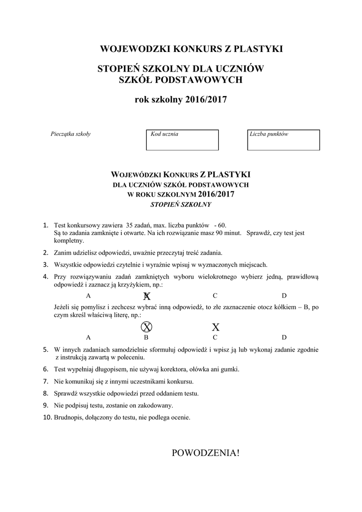 WOJEWODZKI KONKURS Z PLASTYKI STOPIEŃ SZKOLNY DLA UCZNIÓW SZKÓŁ PODSTAWOWYCH rok szkolny 2016/2017 Pieczątka szkoły Liczba punktów Kod ucznia WOJEWÓDZKI KONKURS Z PLASTYKI DLA UCZNIÓW SZKÓŁ PODSTAWOWYCH W ROKU SZKOLNYM 2016/2017 STOPIEŃ SZKOLNY 1. Test konkursowy zawiera 35 zadań, max. liczba punktów - 60. Są to zadania zamknięte i otwarte. Na ich rozwiązanie masz 90 minut. Sprawdź, czy test jest kompletny. 2. Zanim udzielisz odpowiedzi, uważnie przeczytaj treść zadania. 3. Wszystkie odpowiedzi czytelnie i wyraźnie wpisuj w wyznaczonych miejscach. 4. Przy rozwiązywaniu zadań zamkniętych wyboru wielokrotnego wybierz jedną, prawidłową odpowiedź i zaznacz ją krzyżykiem, np.: A B X C D Jeżeli się pomylisz i zechcesz wybrać inną odpowiedź, to złe zaznaczenie otocz kółkiem – B, po czym skreśl właściwą literę, np.: A X X B C D 5. W innych zadaniach samodzielnie sformułuj odpowiedź i wpisz ją lub wykonaj zadanie zgodnie z instrukcją zawartą w poleceniu. 6. Test wypełniaj długopisem, nie używaj korektora, ołówka ani gumki. 7. Nie komunikuj się z innymi uczestnikami konkursu. 8. Sprawdź wszystkie odpowiedzi przed oddaniem testu. 9. Nie podpisuj testu, zostanie on zakodowany. 10. Brudnopis, dołączony do testu, nie podlega ocenie. POWODZENIA! Zadanie 1. (1pkt) Sztuka abstrakcyjna, to: a. sztuka nieprzedstawiająca konkretnego świata przedmiotów, b. technika robienia filmów rysunkowych, c. wielka tablica reklamowa, d. praca plastyczna wykonana z różnych materiałów Zadanie 2. (1pkt) Jak nazywamy gatunek malarski polegający na ukazywaniu najczęściej nieożywionych przedmiotów, dobranych ze względów kompozycyjno-estetycznych lub symbolicznych. a. marina b. martwa natura c. rokoko d. pejzaż e. sztafaż Zadanie 3. (1pkt) Malarstwo ukazujące sceny z życia codziennego, to malarstwo: a. marynistyczne. b. rodzajowe. c. pejzażowe. d. religijne. Zadanie 4. (1pkt) Jak nazywamy linię określającą kształt przedmiotu? a. prostą b. łamaną c. konturową d. krzywą Zadanie 5. (1 pkt) Wymień trzy barwy zimne 1. …………………………………………………. 2. ………………………………………………….. 3. ………………………………………………….. 2 Zadanie 6. (3pkt) W poniższych rysunkach użyto różnych rodzajów kresek, punktów, linii. Podpisz wybierając właściwe: gęsto stawiane punkty; krótkie krzywe linie; krótkie ukośne linie 1……………………………. 2…………………………… 3……………………... Zadanie 7. (1pkt) Jak nazywa się technika plastyczna polegająca na pocieraniu kartki papieru miękkim ołówkiem, pod którą znajdują się przedmioty o zróżnicowanej fakturze? a. akwarela. b. pejzaż. c. frotaż. d. fresk. Zadanie 8. (1 pkt) Nazwa barw dopełniających pochodzi stąd, że: a. są to wszystkie barwy ciepłe. b. są to wszystkie barwy zimne. c. barwy wzajemnie dopełniają się do szarości. Zadanie 9. (2 pkt) Barwy dopełniające najsilniej ze sobą kontrastują. Wymień dwie pary kontrastujących ze sobą barw dopełniających. ……..……………………………. i…………………………………………………. ……………………………………i………………………………………………….. 3 Zadanie 10. (1 pkt) Zmieszanie barwy czerwonej z niebieską daje barwę: …………………………… Zadanie 11. (1 pkt) Jak nazywamy przeciwieństwo dwóch gam barwnych? a. walor b. kontrast c. światłocień d. perspektywa Zadanie 12. (7pkt) Wymień kolejno barwy tęczy, zaczynając od pojawiającej się na górze. 1........................................ 2........................................ 3........................................ 4........................................ 5........................................ 6........................................ 7........................................ Zadanie 13.(1 pkt) Barwna kompozycja, ułożona z kolorowych szkieł oprawiona w ramki ołowiane, umieszczona w otworze okiennym to: ………………………………………………………………………………………….. Zadanie 14. (1 pkt) Podaj nazwę opisanego efektu związanego ze światłem w malarstwie. W malarstwie jasność barwy, natężenie światła względnie cienia (ilość jasności i ciemności), jaka zawarta jest w tonie kolorystycznym. Wiąże się z poczuciem ciężaru koloru, ponieważ barwy i odcienie jasne są lekkie i ulotne, a ciemne sprawiają wrażenie ciężkości i masywności. To jest ……………………………………………………………………………. Zadanie 15. (2 pkt) Wyjaśnij pojęcie „sztuka ludowa” ………………………………………………………………………………………………… ………………………………………………………………………………………………… ………………………………………………………………………………………………… 4 Zadanie 16. (1 pkt) Układ elementów plastycznych sprawiających wrażenie równowagi i spokoju, to kompozycja: a. statyczna. b. otwarta. c. dynamiczna. d. zamknięta. Zadanie 17. (6 pkt) Wpisz po trzy cechy kompozycji: a. statycznej: 1……………………………………………………………………………….. 2……………………………………………………………………………….. 3……………………………………………………………………………….. b. dynamicznej: 1……………………………………………………………………………….. 2……………………………………………………………………………….. 3……………………………………………………………………………….. Zadanie 18. (3 pkt) Przyporządkuj definicje do następujących terminów: Perspektywa; Faktur