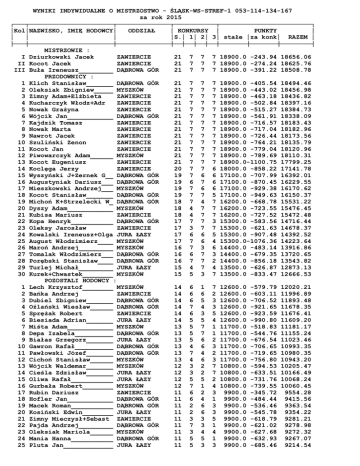 WYNIKI INDYWIDUALNE O MISTRZOSTWO - ŚLĄSK-WS-STREF-1 053-114-134-167 za rok 2015 ┌───┬──────────────────────┬──────────────┬───────────┬────────────────────────┐ │Kol│NAZWISKO, IMIĘ HODOWCY│ ODDZIAŁ │ KONKURSY │ PUNKTY │ │ │ │ │S.│ 1│ 2│ 3│ stałe │za konk│ RAZEM │ ├───┼──────────────────────┼──────────────┼──┼──┼──┼──┼───────┼───────┼────────┤ MISTRZOWIE : I Dziurkowski Jacek ZAWIERCIE 21 7 7 7 18900.0 -243.94 18656.06 II Kocot Jacek ZAWIERCIE 21 7 7 7 18900.0 -274.24 18625.76 III Buła Ireneusz_________ DĄBROWA GÓR 21 7 7 7 18900.0 -391.22 18508.78 PRZODOWNICY : 1 Klich Stanisław_______ DĄBROWA GÓR 21 7 7 7 18900.0 -405.54 18494.46 2 Oleksiak Zbigniew_____ MYSZKÓW 21 7 7 7 18900.0 -443.02 18456.98 3 Zimny Adam+Elżbieta ZAWIERCIE 21 7 7 7 18900.0 -463.18 18436.82 4 Kucharczyk Włodz+Adr ZAWIERCIE 21 7 7 7 18900.0 -502.84 18397.16 5 Nowak Grażyna ZAWIERCIE 21 7 7 7 18900.0 -515.27 18384.73 6 Wójcik Jan____________ DĄBROWA GÓR 21 7 7 7 18900.0 -561.91 18338.09 7 Kajdzik Tomasz ZAWIERCIE 21 7 7 7 18900.0 -716.57 18183.43 8 Nowak Marta ZAWIERCIE 21 7 7 7 18900.0 -717.04 18182.96 9 Nawrot Jacek ZAWIERCIE 21 7 7 7 18900.0 -726.44 18173.56 10 Szuliński Zenon ZAWIERCIE 21 7 7 7 18900.0 -764.21 18135.79 11 Kocot Jan ZAWIERCIE 21 7 7 7 18900.0 -779.04 18120.96 12 Piwowarczyk Adam______ MYSZKÓW 21 7 7 7 18900.0 -789.69 18110.31 13 Kocot Eugeniusz ZAWIERCIE 21 7 7 7 18900.0-1100.75 17799.25 14 Koclęga Jerzy ZAWIERCIE 20 7 7 6 18000.0 -858.22 17141.78 15 Wyszyński J+Zernek G__ DĄBROWA GÓR 19 7 6 6 17100.0 -707.99 16392.01 16 Augustyniak Dariusz___ DĄBROWA GÓR 19 6 7 6 17100.0 -870.45 16229.55 17 Mieszkowski Andrzej___ MYSZKÓW 19 7 6 6 17100.0 -929.38 16170.62 18 Kocot Stanisław_______ DĄBROWA GÓR 19 7 7 5 17100.0 -949.63 16150.37 19 Michoń K+Strzelecki W_ DĄBROWA GÓR 18 7 4 7 16200.0 -668.78 15531.22 20 Dyszy Adam____________ MYSZKÓW 18 4 7 7 16200.0 -723.55 15476.45 21 Kubisa Mariusz ZAWIERCIE 18 4 7 7 16200.0 -727.52 15472.48 22 Kopa Henryk___________ DĄBROWA GÓR 17 7 7 3 15300.0 -583.56 14716.44 23 Oleksy Jarosław ZAWIERCIE 17 3 7 7 15300.0 -621.63 14678.37 24 Kowalski Ireneusz+Olga JURA ŁAZY 17 6 6 5 15300.0 -907.48 14392.52 25 August Włodzimierz____ MYSZKÓW 17 7 6 4 15300.0-1076.36 14223.64 26 Maroń Andrzej_________ MYSZKÓW 16 7 3 6 14400.0 -483.14 13916.86 27 Tomalak Włodzimierz___ DĄBROWA GÓR 16 6 7 3 14400.0 -679.35 13720.65 28 Porębski Stanisław____ DĄBROWA GÓR 16 7 7 2 14400.0 -856.18 13543.82 29 Turlej Michał_________ JURA ŁAZY 15 4 7 4 13500.0 -626.87 12873.13 30 Kurek+Chwastek________ MYSZKÓW 15 5 3 7 13500.0 -833.47 12666.53 POZOSTALI HODOWCY : 1 Lech Krzysztof________ MYSZKÓW 14 6 1 7 12600.0 -579.79 12020.21 2 Bańka Andrzej ZAWIERCIE 14 6 6 2 12600.0 -603.11 11996.89 3 Dubiel Zbigniew_______ DĄBROWA GÓR 14 6 5 3 12600.0 -706.52 11893.48 4 Oźlański Wiesław______ DĄBROWA GÓR 14 7 4 3 12600.0 -921.65 11678.35 5 Sprężak Robert ZAWIERCIE 14 6 3 5 12600.0 -923.59 11676.41 6 Biesiada Adrian_______ JURA ŁAZY 14 5 5 4 12600.0 -990.80 11609.20 7 Miśta Adam____________ MYSZKÓW 13 5 7 1 11700.0 -518.83 11181.17 8 Depa Izabela__________ DĄBROWA GÓR 13 5 7 1 11700.0 -544.76 11155.24 9 Białas Grzegorz_______ JURA ŁAZY 13 5 6 2 11700.0 -676.54 11023.46 10 Gawron Rafał__________ DĄBROWA GÓR 13 4 6 3 11700.0 -706.65 10993.35 11 Pawłowski Józef_______ DĄBROWA GÓR 13 7 4 2 11700.0 -719.65 10980.35 12 Cichoń Stanisław______ MYSZKÓW 13 4 6 3 11700.0 -756.80 10943.20 13 Wójcik Waldemar_______ MYSZKÓW 12 3 2 7 10800.0 -594.53 10205.47 14 Cieśla Zdzisław_______ JURA ŁAZY 12 3 2 7 10800.0 -633.51 10166.49 15 Oliwa Rafał___________ JURA ŁAZY 12 5 5 2 10800.0 -731.76 10068.24 16 Gurbała Robert________ MYSZKÓW 12 7 1 4 10800.0 -739.55 10060.45 17 Rubin Dariusz ZAWIERCIE 11 6 2 3 9900.0 -345.72 9554.28 18 Hofler Jan____________ DĄBROWA GÓR 11 6 4 1 9900.0 -484.44 9415.56 19 Macek Roman___________ DĄBROWA GÓR 11 2 6 3 9900.0 -536.46 9363.54 20 Kosiński Edwin________ JURA ŁAZY 11 2 6 3 9900.0 -545.78 9354.22 21 Zimny Mieczysł+Sebast ZAWIERCIE 11 3 3 5 9900.0 -618.79 9281.21 22 Pajda Andrzej_________ DĄBROWA GÓR 11 7 3 1 9900.0 -621.02 9278.98 23 Oleksiak Mariola______ MYSZKÓW 11 3 4 4 9900.0 -627.68 9272.32 24 Mania Hanna___________ DĄBROWA GÓR 11 5 5 1 9900.0 -632.93 9267.07 25 Pluta Jan_____________ JURA ŁAZY 11 5 3 3 9900.0 -685.46 9214.54 26 Białas Roman__________ JURA ŁAZY 11 6 1 4 9900.0 -740.87 9159.13 27 Gajewski Zbigniew_____ MYSZKÓW 11 5 2 4 9900.0 -752.13 9147.87 28 Wójcik Zygmunt________ DĄBROWA GÓR 10 4 6 0 9000.0 -581.30 8418.70 29 Gocyła Sławomir_______ MYSZKÓW 10 4 2 4 9000.0 -623.76 8376.24 30 Marzec Stanisław______ DĄBROWA GÓR 10 6 4 0 9000.0 -638.85 8361.15 ┌───┬──────────────────────┬──────────────┬───────────┬────────────────────────┐ │Kol│NAZWISKO, IMIĘ HODOWCY│ ODDZIAŁ │ KONKURSY │ PUNKTY │ │ │ │ │S.│ 1│ 2│ 3│ stałe │za konk│ RAZEM │ ├───┼──────────────────────┼──────────────┼──┼──┼──┼──┼───────┼───────┼────────┤ 31 Olczyk Wojciech ZAWIERCIE 10 6 3 1 9000.0 -685.87 8314.13 32 Wnuk Tadeusz__________ MYSZKÓW 9 4 0 5 8100.0 -347.07 7752.93 33 Niedziela Rafał_______ JURA ŁAZY 9 2 4 3 8100.0 -392.99 7707.01 34 Basoń Zdzisław________ DĄBROWA GÓR 9 3 4 2 8100.0 -456.52 7643.48 35 Tokars