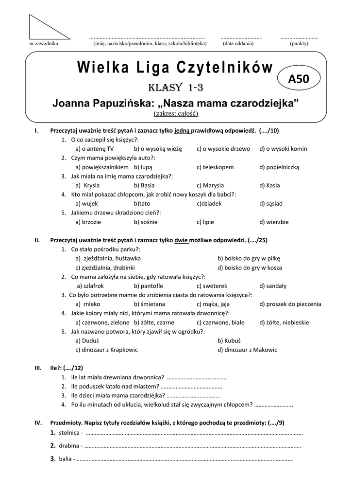 ………………………………………………………………….. nr zawodnika (imię, nazwisko/pseudonim, klasa, szkoła/biblioteka) ………………………. ……………………. (data oddania) (punkty) Wielka Liga Czytelników A50 KLASY 1-3 Joanna Papuzińska: „Nasza mama czarodziejka” (zakres: całość) I. Przeczytaj uważnie treść pytań i zaznacz tylko jedną prawidłową odpowiedź. 1. O co zaczepił się księżyc?: a) o antenę TV b) o wysoką wieżę c) o wysokie drzewo 2. Czym mama powiększyła auto?: a) powiększalnikiem b) lupą c) teleskopem 3. Jak miała na imię mama czarodziejka?: a) Krysia b) Basia c) Marysia 4. Kto miał pokazać chłopcom, jak zrobić nowy koszyk dla babci?: a) wujek b)tato c)dziadek 5. Jakiemu drzewu skradziono cień?: a) brzozie b) sośnie c) lipie (…./10) d) o wysoki komin d) popielniczką d) Kasia d) sąsiad d) wierzbie II. Przeczytaj uważnie treść pytań i zaznacz tylko dwie możliwe odpowiedzi. (…./25) 1. Co stało pośrodku parku?: a) zjeżdżalnia, huśtawka b) boisko do gry w piłkę c) zjeżdżalnia, drabinki d) boisko do gry w kosza 2. Co mama założyła na siebie, gdy ratowała księżyc?: a) szlafrok b) pantofle c) sweterek d) sandały 3. Co było potrzebne mamie do zrobienia ciasta do ratowania księżyca?: a) mleko b) śmietana c) mąka, jaja d) proszek do pieczenia 4. Jakie kolory miały nici, którymi mama ratowała dzwonnicę?: a) czerwone, zielone b) żółte, czarne c) czerwone, białe d) żółte, niebieskie 5. Jak nazwano potwora, który zjawił się w ogródku?: a) Duduś b) Kubuś c) dinozaur z Krapkowic d) dinozaur z Makowic III. Ile?: (…./12) 1. Ile lat miała drewniana dzwonnica? …………………………………. 2. Ile poduszek latało nad miastem? ………………………………….. 3. Ile dzieci miała mama czarodziejka? ……………………………… 4. Po ilu minutach od ukłucia, wielkolud stał się zwyczajnym chłopcem? …………………….. IV. Przedmioty. Napisz tytuły rozdziałów książki, z którego pochodzą te przedmioty: (…./9) 1. stolnica - ………………………………………………………………………………………………………………………………. 2. drabina - ………………………………………………………………………………………………………………………………. 3. balia - ………………………………………………………………………………………………………………………………. V. Rozwiąż krzyżówkę (…./14) 1. Miejsce, gdzie mama odczarowała wielkoluda. 2. Pora dnia, w której mama reperował księżyc. 3. Statek, którym płynęli po morzu. 4. Pohukuje nocą. 5. Miejsce, w którym schronił się dinozaur. 6. Z grzmotami i piorunami. 1. 2. 3. 4. Hasło: ………………………………………………….. 5. 6. VI. Korzystając ze słowników w wersji papierowej przetłumacz na język angielski oraz napisz tytuł książki, z której korzystałeś (źródło): (…/6) 1. dinozaur - …………………………………………………….. 2. kapitan - …………………………………………………….. Źródło: …………………………………………………………………………………………………….. VII. Korzystając ze słownika synonimów, słownika j. polskiego, w wersji papierowej podaj synonim podanych wyrazów oraz napisz tytuł książki, z której korzystałeś (źródło)(…./10) 1. poduszkowiec - …………………………………………………………………………………………………………….. 2. dzwonnica - ……………………………………………………………………………………………………………….. Źródło:…………………………………………………………………………………………………………….. VIII. Rozwiąż zadanie matematyczne: (…./6) Dinozaur zjadł z ogródka mamy sałatę z 6 grządek po 6 główek. Ile główek sałaty zjadł dinozaur? Działanie: ……………………………………………………………………………………………………………………………………………….. Odpowiedź: ……………………………………………………………………………………………………………………………………………. IX. Zadanie przyrodnicze. Podkreśl sześć nazw gadów: (…./6) żółw, żaba, zaskroniec, jaszczurka, żmija, traszka, salamandra, krokodyl, aligator X. Za co kochamy mamę? Odpowiedz pełnym zdaniem. (…./2) ………………………………………………………………………………………………………………………………………………………………… ………………………………………………………………………………………………………………………………………………………………… ………………………………………………………………………………………………………………………………………………………………… ………………………………………………………………………………………………………………………………………………………………… ZIARENKO MĄDROŚCI: „Ludzie to zawsze dzieci swoich matek. Bez matki nie ma poety, nie ma bohatera” M. Gorki WIELKA LIGA CZYTELNIKÓW—Kl. 1-3 www.Wielka-Liga.pl FORMULARZ NR A50 – wersja: 1.0, autor: Małgorzata Wilk Data oprac. wrzesień 2016r.