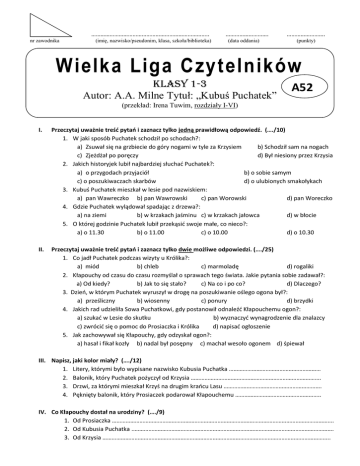 ………………………………………………………………….. nr zawodnika (imię, nazwisko/pseudonim, klasa, szkoła/biblioteka) ………………………. (data oddania) ……………………. (punkty) Wielka Liga Czytelników KLASY 1-3 Autor: A.A. Milne Tytuł: „Kubuś Puchatek” A52 (przekład: Irena Tuwim, rozdziały I-VI) I. Przeczytaj uważnie treść pytań i zaznacz tylko jedną prawidłową odpowiedź. (…./10) 1. W jaki sposób Puchatek schodził po schodach?: a) Zsuwał się na grzbiecie do góry nogami w tyle za Krzysiem b) Schodził sam na nogach c) Zjeżdżał po poręczy d) Był niesiony przez Krzysia 2. Jakich historyjek lubił najbardziej słuchać Puchatek?: a) o przygodach przyjaciół b) o sobie samym c) o poszukiwaczach skarbów d) o ulubionych smakołykach 3. Kubuś Puchatek mieszkał w lesie pod nazwiskiem: a) pan Wawreczko b) pan Wawrowski c) pan Worowski d) pan Woreczko 4. Gdzie Puchatek wylądował spadając z drzewa?: a) na ziemi b) w krzakach jaśminu c) w krzakach jałowca d) w błocie 5. O której godzinie Puchatek lubił przekąsić swoje małe, co nieco?: a) o 11.30 b) o 11.00 c) o 10.00 d) o 10.30 II. Przeczytaj uważnie treść pytań i zaznacz tylko dwie możliwe odpowiedzi. (…./25) 1. Co jadł Puchatek podczas wizyty u Królika?: a) miód b) chleb c) marmoladę d) rogaliki 2. Kłapouchy od czasu do czasu rozmyślał o sprawach tego świata. Jakie pytania sobie zadawał?: a) Od kiedy? b) Jak to się stało? c) Na co i po co? d) Dlaczego? 3. Dzień, w którym Puchatek wyruszył w drogę na poszukiwanie oślego ogona był?: a) prześliczny b) wiosenny c) ponury d) brzydki 4. Jakich rad udzieliła Sowa Puchatkowi, gdy postanowił odnaleźć Kłapouchemu ogon?: a) szukać w Lesie do skutku b) wyznaczyć wynagrodzenie dla znalazcy c) zwrócić się o pomoc do Prosiaczka i Królika d) napisać ogłoszenie 5. Jak zachowywał się Kłapouchy, gdy odzyskał ogon?: a) hasał i fikał kozły b) nadal był posępny c) machał wesoło ogonem d) śpiewał III. Napisz, jaki kolor miały? (…./12) 1. Litery, którymi było wypisane nazwisko Kubusia Puchatka …………………………………………………… 2. Balonik, który Puchatek pożyczył od Krzysia …………………………………………………………………………. 3. Drzwi, za którymi mieszkał Krzyś na drugim krańcu Lasu ………………………………………………………. 4. Pęknięty balonik, który Prosiaczek podarował Kłapouchemu ……………………………………………….. IV. Co Kłapouchy dostał na urodziny? (…./9) 1. Od Prosiaczka ………………………………………………………………………………………………………………………………. 2. Od Kubusia Puchatka ..…………………………………………………………………………………………………………………. 3. Od Krzysia ………………………………………………………………………………………………………………………………….. V. Uzupełnij fragment lektury odpowiednimi wyrazami: (…./14) To (1) …………………………………………………………. coś oznacza. Takie (2) ……………………………….…………………….. (3) …………………………………………………. nie (4)……………………………….…………………. bez powodu. Jeżeli słyszę (5)……………………………………….…………., to znaczy, że ktoś (6) ……………………………………….. , a jedyny powód (7) ………………………………………………….., jaki znam, to ten, że się jest pszczołą. VI. Korzystając ze słownika w wersji papierowej przetłumacz na język angielski oraz napisz tytuł książki, z której korzystałeś (źródło). (…/6) 1. Miś …………………………………………………………………. 2. Królik ……………………………………………………………… Źródło: …………………………………………………………………………………………………………………………………… VII. Korzystając z słownika synonimów, w wersji papierowej podaj wyraz bliskoznaczny oraz napisz tytuł książki, z której korzystałeś (źródło). (…./10) 1. Mądry ………………………………………………………………………………………………………………………………………. 2. Głupi …………………….………………………………………………………………………………………………………………….. Źródło:……………………………………………………………………………………………………………………………………………. VIII. Rozwiąż zadanie matematyczne: (…./6) Kubuś Puchatek z Prosiaczkiem szukali śladów łasicy przez 3 godziny. Oblicz, ile to minut? Działanie: ……………………………………………………………………………………………………………………………………………….. Odpowiedź: ……………………………………………………………………………………………………………………………………………. IX. Podkreśl 6 nazw drzew liściastych. (…./6) buk, dąb, rododendron, berberys, sosna, limba, brzoza, jodła, świerk, jałowiec, dereń, forsycja, klon, hortensja, cis, topola, tuja, kasztanowiec X. Którego z bohaterów książki polubiłeś najbardziej i dlaczego? Odpowiedz pełnym zdaniem. (…./2) ………………………………………………………………………………………………………………………………………………………………… ……………………………………………………………………………