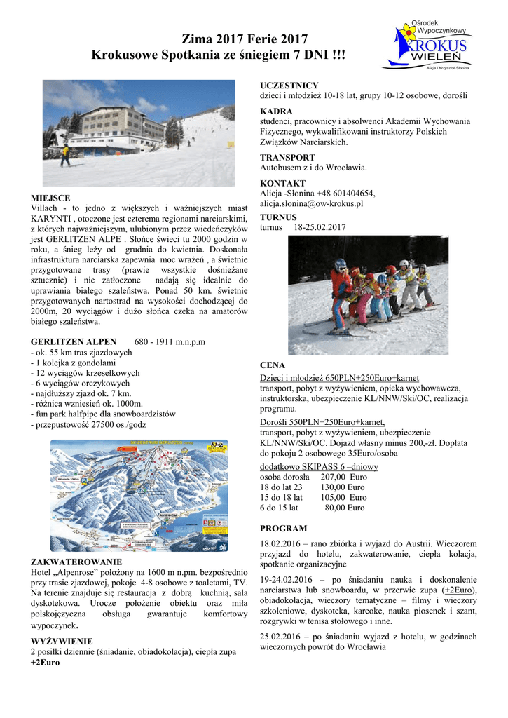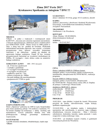 Zima 2017 Ferie 2017 Krokusowe Spotkania ze śniegiem 7 DNI !!!