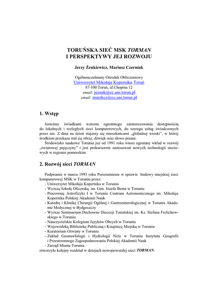 72586.$6,(û06.7250$1 ,3(563(.7<:<-(-52=:2-8 -HU]\)HQNLHZLF]0DULXV]&]HUQLDN 2JyOQRXF]HOQLDQ\2URGHN2EOLF]HQLRZ\ 8QLZHUV\WHW0LNRáDMD.RSHUQLND7RUX 7RUXXO&KRSLQD HPDLOMH]HQN#FFXQLWRUXQSO HPDLOPDUHNF]#FFXQLWRUXQSO :VW S -HVWHP\ ZLDGNDPL Z]URVWX RJURPQHJR ]DLQWHUHVRZDQLD GRVW SQRFL GR ORNDOQ\FK L UR]OHJá\FK VLHFL NRPSXWHURZ\FK GR V]HUHJX XVáXJ ZLDGF]RQ\FK SU]H] QLH = GQLD QD G]LH VWDMHP\ VL PLHV]NDFDPL ÄJOREDOQHM ZLRVNL´ Z NWyUHM URGNLHPSU]HND]XVWDáVL REUD]G(ZL NRUD]VáRZRSLVDQH URGRZLVNRQDXNRZH7RUXQLDMX* RGURNXZQRVLRJURPQ\ZNáDGZUR]ZyM ÄZLDWRZHM SDM F]\Q\´ L MHVW SUHNXUVRUHP ]DVWRVRZD QRZ\FK WHFKQRORJLL VLHFLR Z\FKZUHJLRQLHSRPRUVNLP 5R]ZyMVLHFL7250$1 3RGSLVDQLHZPDUFXURNX3RUR]XPLHQLHZVSUDZLHEXGRZ\PLHMVNLHMVLHFL NRPSXWHURZHM06.Z7RUXQLXSU]H] 8QLZHUV\WHW0LNRáDMD.RSHUQLNDZ7RUXQLX :\*V] 6]NRá 2ILFHUVN LP*HQ-y]HID%HPDZ7RUXQLX 3UDFRZQL $VWURIL]\NL , Z 7RUXQLX &HQWUXP $VWURQRPLF]QHJR LP 0LNRáDMD .RSHUQLND3ROVNLHM$NDGHPLL1DXN .DWHGU L.OLQLN &KLUXUJLL2JyOQHML*DVWURHQWHURORJLF]QHMZ7RUXQLX $NDGH PLL0HG\F]QHMZ%\GJRV]F]\ :\*V]H6HPLQDULXP'XFKRZQH'LHFH]ML7RUXVNLHMLP.V6WHIDQD)UHOLFKRZ VNLHJRZ7RUXQLX 1DXF]\FLHOVNLH.ROHJLXP- ]\NyZ2EF\FKZ7RUXQLX :RMHZyG]N %LEOLRWHN 3XEOLF]Q L.VL*QLF 0LHMVN Z7RUXQLX .XUDWRULXP2ZLDW\Z7RUXQLX =DNáDG *HRPRUIRORJLL L +\GURORJLL 1L*X Z 7RUXQLX ,QVW\WXWX *HRJUDILL L3U]HVWU]HQQHJR=DJRVSRGDURZDQLD3ROVNLHM$NDGHPLL1DXN =DU]G0LDVWD7RUXQLD RWZRU]\áRNROHMQ\UR]G]LDáZG]LHMDFKQRZRSRZVWDáHMVLHFL7250$1 8F]HVWQLF\ 3RUR]XPLHQLD RWU]\PDOL GRVW S GR SRF]W\ HOHNWURQLF]QHM IWS WHOQHW VHUZLVX ::: IRUXP G\VNXV\MQHJR ]D SRPRF /LVWVHUYD RUD] VHUZLVX 1(:6 ;V\VWHPX$/(;$UFKLH:+2,6 ']L ]XVáXJVLHFL7250$1LZVSyáSUDFXMFHJR]QL Z ]áD1$6.80. NRU]\ VWDRNRáRX*\WNRZQLNyZDLFKOLF]EDQLHXVWDQQLHZ]UDVWD'X*H]DLQWHUHVRZDQH VLHFL Z\ND]XM MHGQRVWNL QLH ]ZL]DQH ]H URGRZLVNLHP DNDGHPLFNRQDXNRZ\P 7RUXQLD V WR PLQ 8U]G :RMHZyG]NL 7HOHNRPXQLNDFMD 3ROVND 6$ Z 7RUXQLX RUD]OLF]QH]DNáDG\SU]HP\VáRZH :H ZVSyáSUDF\ ] .XUDWRULXP 2ZLDW\ SRZVWDáD LQLFMDW\ZD Ä,QWHUQHW GOD V]Nyá´ ZUDPDFKNWyUHMZLHOHV]NyáUHGQLFK]7RUXQLDDWDN*H]ZRMHZyG]WZWRUXVNLHJRL ZáRFáDZVNLHJRX]\VNDáDGRVW SGR]DVREyZVLHFLRZ\FK,QWHUQHWX 5HDOL]DFMDWHFKQLF]QDVLHFL7250$1 8V\WXRZDQLH JáyZQ\FK RELHNWyZ VLHFL 7250$1 SU]HGVWDZLRQR QD 5\V 2ELHNW\ R PQLHMV]\P UXFKX VLHFLRZ\PMHGQRVWNLDNDGHPLFNLH ]DNáDG\ SU]HP\VáR ZHV]NRá\UHGQLH]QDMGXMFHVL SR]DREU EHPPDJLVWUDOLZLDWáRZRGRZHMV GRá F]RQH GR VLHFL áF]DPL G]LHU*DZLRQ\PL SU]H] VHUZHU\ NRPXQLNDF\MQH 7250$180. 3RF]WNRZR VLHü 7250$1 Z URNX G]LDáDáD Z WHFKQRORJLL )'', : URNX UR]EXGRZDQRM ZJVWDQX]LOXVWURZDQHJRQD 5\V 5R]V]HU]RQRJáyZQ\SLHU FLH )'',L]UHDOL]RZDQR,HWDSPLJUDFMLVLHFLZNLHUXQNXVLHFLV]HURNRSDVPRZHMZ WHFKQRORJLL$70 )XQNFM JáyZQ\FK Z ]áyZ VLHFLRZ\FK VSHáQLDM URXWHU\ ILUP\ &,6&2 W\SX &&RUD]SU]HáF]QLFH$70W\SX/6 6HUZHUHPVLHFL7250$1MHVWNRPSXWHUILUP\68163$5&6HUYHU( 6WDQRZLVNR ]DU]G]DQLD VLHFL RSDUWR R NRPSXWHU 681 63$5& ZUD] ] RSUR JUDPRZDQLHP&,6&2:RUNVL6XQ1HW0DQDJHU:V]\VWNLHZ ]á\VLHFLRZHLVWDQR ZLVNR]DU]G]DQLD]RVWDá\Z\SRVD*RQHZ]DVLODF]H836ILUP\60$57 'REXGRZ\PDJLVWUDO ZLDWáRZRGRZ\FKZ\NRU]\VWDQR NDEOH ] IDEU\NLZ 2*DUR ZLHRPLHV]DQHMNRQILJXUDFMLRGGRZáyNLHQMHGQRLZLHORPRGRZ\FKàF]QLH ]DLQVWDORZDQR NP JáyZQ\FK PDJLVWUDO ZLDWáRZRGRZ\FK Z NWyU\FK PLHFL VL RNRáR NP ZLDWáRZRGRZ\FK ZáyNLHQ SU]HV\áRZ\FK =DSURMHNWRZDQD LORü Záy NLHQ]DEH]SLHF]DZSHáQLSRWU]HE\GODWHFKQRORJLL)'',RUD]$70 'RVLHFLZLDWáRZRGRZHMSRGáF]RQRSRGVLHFL/$1áF]QDLORüNRPSXWHUyZ PDMF\FKGRVW SGRVLHFL7250$11$6. Z\QRVLRNV]WXN 8*\WNRZQLF\PRJ ]GHF\GRZDüRZ\ERU]HMHGQHJR]HVSRVREyZGRVW SXGRVLHFL 7250$1 $70 )'', (WKHUQHW V]HUHJRZ\DV\QFKURQLF]Q\ V]HUHJRZ\V\QFKURQLF]Q\ 1DMLVWRWQLHMV] VSUDZ GRUHDOL]DFMLZURNXE G]LHXNRF]HQLHSHáQHMPLJUD FML Z NLHUXQNX VLHFL V]HURNRSDVPRZHM $70 RUD] ]DRIHURZDQLH SHáQHJR ]DNUHVX XVáXJPXOWLPHGLDOQ\FK ,QZHVW\FMD EXGRZ\ VLHFL 7250$1 MHVW NRQW\QXRZDQD Z ELH*F\P URNX L SR ZLQQDRVLJQüZNRFXURNXVWDQ]LOXVWURZDQ\QD5\V $QDOL]XMFSUREOHP\EH]SLHF]HVWZDGDQ\FKV]\ENRüG]LDáDQLDVLHFLRUD]SR WU]HE\ORNDOQ\FKX*\WNRZQLNyZSU]\MPXMHVL GDOV]\UR]ZyMLQIUDVWUXNWXU\VLHFLNR OHMQRZQDVW SXMF\FKNLHUXQNDFK WZRU]HQLD W]Z VLDWNL áF]\ ZLDWáRZRGRZ\FK GOD REVáXJL WHFKQRORJLL $70 L )'',EG( LQQ\FKSHUVSHNW\ZLF]Q\FKVWDQGDUGyZ Z\SRVD*HQLHZQDMEOL*V]HMSHUVSHNW\ZLHQRZ\FKZ ]áyZZJWHFKQRORJLL$70 SU]HVXZDQLH L WZRU]HQLH SLHUFLHQL )'', GOD ORNDOQ\FK W]Z NDPSXVRZ\FK L Z\G]LDáRZRLQVW\WXWRZ\FKORNDOL]DFML 'OD ]DSHZQLHQLD SHáQHM VSyMQRFL VLHFL XWU]\PDQR MHGQRURGQRü VSU] WX ILUP\ &,6&2G]LDáDMFHJRZJáyZQ\PSLHUFLHQLX)'',RUD]ZZ ]áDFK$701DWRPLDVW ZORNDOQ\FKSLHUFLHQLDFK]DVWRVRZDQRVSU] WLQQ\FKILUPZVSyáSUDFXMF\]URXWH UDPL&,6&2 'RPLQXMF SODWIRUP VSU] WRZ VHUZHUyZ VLHFL 7250$1 V NRPSXWHU\ 681 VHUZHU 7250$1 63$5&6HUYHU ( VHUZHU $/(; 63$5& VHUZHU %L EOLRWHNL*áyZQHM80.63$5&6HUYHUVHUZHU;681/; 6XNFHV\ZQLH GRáF]DQHGR VLHFL 7250$1 Uy*QRURGQH VWDFMH PXOWLPHGLDOQH V JáyZQLHW\SX6816LOLFRQ*UDSKLF 1LH]PLHUQLHZD*Q VSUDZ MHVW]DSHZQLHQLHGRMFLDGRVLHFL7250$1SU]H]á F]D ]HZQ WU]QH R RGSRZLHGQLHM SU]HSXVWRZRFL 'RW\FKF]DVRZH áF]H VDWHOLWDUQH R SU]HSXVWRZRFLNEVUHODFML7RUX :DUV]DZDQLHVSHáQLDMX* W\FKZ\PDJD 8WU]\PDQLHVLHFL7250$1 : GQLX OXWHJR URNX ZV]\VF\ XF]HVWQLF\ LQLFMDW\ZQHJR 3RUR]XPLHQLD SRGSLVDQHJRZURNXZ7RUXQLXV\JQRZDOLQRZH3RUR]XPLHQLHZVSUDZLHUR] ZRMXXWU]\PDQLDLHNVSORDWDFML06. 7250$1,QWHJUDOQ F] ü3RUR]XPLHQLDVWD QRZL QRZ\ 5HJXODPLQ 06. 7250$1 L QRZ\ 5HJXODPLQ 5DG\ 8*\WNRZQLNyZ 06.7250$1 2ED UHJXODPLQ\ RNUHODM ]DNUHV G]LDáDQLD RUJDQyZ 06. 7250$1 SUDZD L RERZL]NLX*\WNRZQLNyZRUD]DGPLQLVWUDWRUDVLHFL7250$1DWDN*HVNáDG]DGDQLD LWU\EIXQNFMRQRZDQLD5DG\8*\WNRZQLNyZ06.7250$1 -HGQRVWN :LRGF SR]RVWDMH 8QLZHUV\WHW0LNRáDMD.RSHUQLND NWyUHJR 5HNWRU MHVWRUJDQHP=DU]G]DMF\P 06.7250$1 2UJDQHP RSLQLRGDZF]RGRUDGF]\P MHVW WR RVRERZD URGRZLVNRZD 5DGD 8*\WNRZQLNyZ 'RNRRUG\QRZDQLDRUD]SURZDG]HQLDVSUDZEXGRZ\XWU]\PDQLDLUR]ZRMX06. 7250$1 ]RVWDá SRQRZQLH Z\]QDF]RQ\ 2JyOQRXF]HOQLDQ\ 2URGHN 2EOLF]HQLRZ\ 80.NWyUHJR'\UHNWRUSHáQLURO .RRUG\QDWRUD06.7250$1 1D MHGQRVWN RUJDQL]DF\MQ SURZDG]F VSUDZ\ ELH*FHM HNVSORDWDFML L DGPLQL VWURZDQLDVLHFL 06.7250$1SRZRáDQR/DERUDWRULXP(NVSORDWDFMLL=DU]G]D QLD6LHFL 7250$1 Z2JyOQRXF]HOQLDQ\P2UR