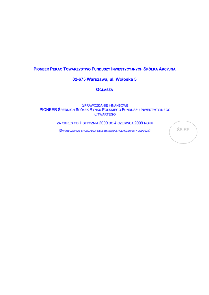 PIONEER PEKAO TOWARZYSTWO FUNDUSZY INWESTYCYJNYCH SPÓŁKA AKCYJNA 02-675 Warszawa, ul. Wołoska 5 OGŁASZA SPRAWOZDANIE FINANSOWE PIONEER ŚREDNICH SPÓŁEK RYNKU POLSKIEGO FUNDUSZU INWESTYCYJNEGO OTWARTEGO ZA OKRES OD 1 STYCZNIA 2009 DO 4 CZERWCA 2009 ROKU (SPRAWOZDANIE SPORZĄDZA SIĘ Z ZWIĄZKU Z POŁĄCZENIEM FUNDUSZY) ŚS RP PIONEER ŚREDNICH SPÓŁEK RYNKU POLSKIEGO FUNDUSZ INWESTYCYJNY OTWARTY Sprawozdanie Finansowe za okres od 1 stycznia 2009 do dnia 4 czerwca 2009 roku Sporządzane w związku połączeniem z funduszem Pioneer Małych i Średnich Spółek Rynku Polskiego FIO Spis treści Wprowadzenie A Fundusz Nazwa Funduszu, typ oraz konstrukcja Funduszu Podstawy prawne działania, informacje rejestrowe Funduszu, utworzenie Funduszu Opis celu inwestycyjnego, specjalizacji Funduszu Opis stosowanych ograniczeń inwestycyjnych Funduszu Informacja o założeniu kontynuowania działalności B Towarzystwo Funduszy Inwestycyjnych Firma Towarzystwa Funduszy Inwestycyjnych, siedziba i adres Dane rejestrowe Towarzystwa Funduszy Inwestycyjnych C Okres sprawozdawczy i dzień bilansowy D Biegły rewident funduszu E Jednostki Uczestnictwa Zestawienie lokat Bilans Rachunek wyniku z operacji Zestawienie zmian w aktywach netto Noty objaśniające Nota - 1 Polityka rachunkowości funduszu Przepisy prawne regulujące rachunkowość Funduszu Zasady ujawniania i prezentacji informacji w sprawozdaniu finansowym Ujmowanie operacji dotyczących Funduszu w księgach rachunkowych Wycena aktywów i pasywów Funduszu Ustalanie Wartości Aktywów Netto i wyniku z operacji Wprowadzone w okresie sprawozdawczym zmiany stosowanych zasad rachunkowości, metod wyceny oraz sposobu sporządzania sprawozdania finansowego Nota - 2 Należności Funduszu Nota - 3 Zobowiązania Funduszu Nota - 4 Środki pieniężne i ich ekwiwalenty Nota - 5 Ryzyka Nota - 6 Instrumenty pochodne Nota - 7 Transakcje przy zobowiązaniu się Funduszu lub drugiej strony do odkupu Nota - 8 Kredyty i pożyczki Nota - 9 Waluty i różnice kursowe Nota - 10 Dochody Funduszu i ich dystrybucja Nota - 11 Koszty Funduszu Nota - 12 Dane porównawcze o Jednostkach Uczestnictwa Informacje dodatkowe A Informacje o znaczących zdarzeniach, dotyczących lat ubiegłych, ujętych w sprawozdaniu finansowym B Informacje o znaczących zdarzeniach po dniu bilansowym C Wstrzymanie przyjmowania wpłat na Jednostki Uczestnictwa D Dokonane korekty błędów podstawowych E Inne informacje Połączenie Funduszy • Przebieg łączenia • Przydział jednostek w funduszu przejmującym • Wykreślenie funduszu przejmowanego z rejestru funduszy • Przekazanie majątku funduszu przejmowanego • Sprawozdania okresowe Opodatkowanie Funduszu w roku 2009 – do dnia bilansowego Podatek dochodowy od dochodu z tytułu odkupienia Jednostek Uczestnictwa Instytucje obsługujące Fundusz • Towarzystwo Funduszy Inwestycyjnych i zarządzający portfelem Funduszu • Agent Obsługujący Uczestników Funduszu • Depozytariusz Metryka Funduszu Metryka Funduszu przejmującego PIONEER ŚREDNICH SPÓŁEK RYNKU POLSKIEGO FUNDUSZ INWESTYCYJNY OTWARTY Sprawozdanie Finansowe za okres od 1 stycznia 2009 do dnia 4 czerwca 2009 roku Sporządzane w związku połączeniem z funduszem Pioneer Małych i Średnich Spółek Rynku Polskiego FIO Wprowadzenie A Fundusz Nazwa Funduszu, typ oraz konstrukcja Funduszu Pioneer Średnich Spółek Rynku Polskiego Fundusz Inwestycyjny Otwarty Fundusz jest funduszem inwestycyjnym otwartym. Fundusz zbywa jednostki uczestnictwa różnych kategorii. Podstawy prawne działania, informacje rejestrowe Funduszu, utworzenie Funduszu Podstawy prawne działania Funduszu określone są w Ustawie z dnia 27 maja 2004 roku o funduszach inwestycyjnych (Dz. U. nr 146, poz. 1546 z późniejszymi zmianami), zwanej dalej Ustawą. Zgodnie z Ustawą nadzór nad rynkiem sprawuje Komisja Nadzoru Finansowego (dalej: ‘Komisja’) – wcześniej Komisja Papierów Wartościowych i Giełd. Fundusz prowadzi działalność zgodnie z prawem wspólnotowym regulującym zasady zbiorowego inwestowania w papiery wartościowe. Statut Pioneer Średnich Spółek Rynku Polskiego Funduszu Inwestycyjnego Otwartego zatwierdzony został decyzją Komisji Papierów Wartościowych i Giełd DFI/W/4032-12/23-1-4180/06 z dnia 14 września 2006 roku o udzieleniu zezwolenia na utworzenie funduszu oraz zatwierdzeniu Statutu Funduszu i wyborze depozytariusza. Fundusz został wpisany do rejestru funduszy inwestycyjnych prowadzonego przez Sąd Okręgowy w Warszawie, VII Wydział Cywilny i Rejestrowy pod numerem RFi 256 w dniu 9 października 2006 roku. Fundusz został utworzony w drodze zapisów polegających na dokonaniu wpłaty kwoty 4 milionów złotych przez Pioneer Pekao Towarzystwo Funduszy Inwestycyjnych S.A. Cena nabycia Jednostki uczestnictwa w ramach zapisów wynosiła 10.00 zł. Data rozpoczęcia zbywania Jednostek Uczestnictwa: 24 października 2006 roku. Zgodnie ze Statutem Fundusz został utworzony na czas nieograniczony. Informacja o połączeniu Funduszu i wykreśleniu z rejestru funduszy inwestycyjnych zawarta jest w podrozdziale Połączenie Funduszy w Informacjach Dodatkowych do Sprawozdania [pkt E Inne Informacje]. Opis celu inwestycyjnego, specjalizacji Funduszu W roku 2009 Statut Funduszu uległ zmianom wynikającym m.in. z dostosowania do zmian w przepisach Ustawy. Celem inwestycyjnym Funduszu jest wzrost wartości aktywów funduszu w wyniku wzrostu wartości lokat. Fundusz nie gwarantuje osiągnięcia powyższego celu. Fundusz jest funduszem akcji. Aktywa Funduszu są lokowane przede wszystkim w dopuszczone do obrotu regulowanego lub będące w ofercie publicznej na terytorium Rzeczypospolitej Polskiej akcje spółek średniej wielkości. Za spółki o średniej wielkości będą uznane te spółki, które nie wchodzą w skład indeksu WIG 20, których kapitalizacja rynkowa: * nie jest większa od kapitalizacji rynkowej spółki wchodzącej w skład indeksu mWIG40 publikowanego przez G