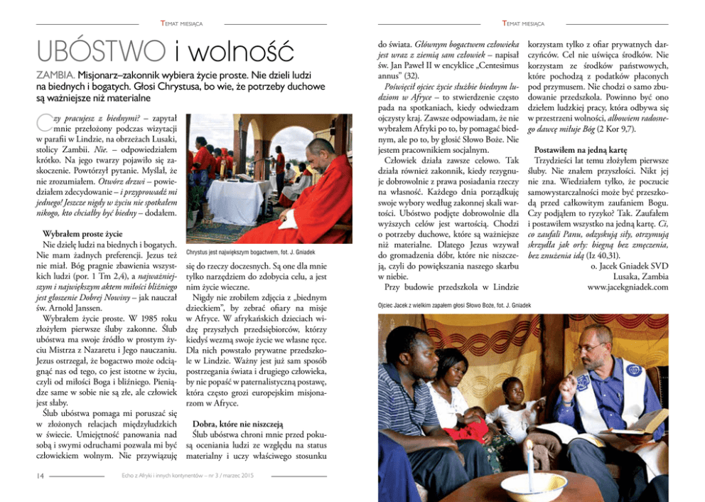 Temat miesiąca UBÓSTWO i wolność ZAMBIA. Misjonarz—zakonnik wybiera życie proste. Nie dzieli ludzi na biednych i bogatych. Głosi Chrystusa, bo wie, że potrzeby duchowe są ważniejsze niż materialne C zy pracujesz z biednymi? – zapytał mnie przełożony podczas wizytacji w parafii w Lindzie, na obrzeżach Lusaki, stolicy Zambii. Nie. – odpowiedziałem krótko. Na jego twarzy pojawiło się zaskoczenie. Powtórzył pytanie. Myślał, że nie zrozumiałem. Otwórz drzwi – powiedziałem zdecydowanie – i przyprowadź mi jednego! Jeszcze nigdy w życiu nie spotkałem nikogo, kto chciałby być biedny – dodałem. Wybrałem proste życie Nie dzielę ludzi na biednych i bogatych. Nie mam żadnych preferencji. Jezus też nie miał. Bóg pragnie zbawienia wszystkich ludzi (por. 1 Tm 2,4), a najważniejszym i największym aktem miłości bliźniego jest głoszenie Dobrej Nowiny – jak nauczał św. Arnold Janssen. Wybrałem życie proste. W 1985 roku złożyłem pierwsze śluby zakonne. Ślub ubóstwa ma swoje źródło w prostym życiu Mistrza z Nazaretu i Jego nauczaniu. Jezus ostrzegał, że bogactwo może odciągnąć nas od tego, co jest istotne w życiu, czyli od miłości Boga i bliźniego. Pieniądze same w sobie nie są złe, ale człowiek jest słaby. Ślub ubóstwa pomaga mi poruszać się w złożonych relacjach międzyludzkich w świecie. Umiejętność panowania nad sobą i swymi odruchami pozwala mi być człowiekiem wolnym. Nie przywiązuję 14 Chrystus jest największym bogactwem, fot. J. Gniadek się do rzeczy doczesnych. Są one dla mnie tylko narzędziem do zdobycia celu, a jest nim życie wieczne. Nigdy nie zrobiłem zdjęcia z „biednym dzieckiem”, by zebrać ofiary na misje w Afryce. W afrykańskich dzieciach widzę przyszłych przedsiębiorców, którzy kiedyś wezmą swoje życie we własne ręce. Dla nich powstało prywatne przedszkole w Lindzie. Ważny jest już sam sposób postrzegania świata i drugiego człowieka, by nie popaść w paternalistyczną postawę, która często grozi europejskim misjonarzom w Afryce. Temat miesiąca do świata. Głównym bogactwem człowieka jest wraz z ziemią sam człowiek – napisał św. Jan Paweł II w encyklice „Centesimus annus” (32). Poświęcił ojciec życie służbie biednym ludziom w Afryce – to stwierdzenie często pada na spotkaniach, kiedy odwiedzam ojczysty kraj. Zawsze odpowiadam, że nie wybrałem Afryki po to, by pomagać biednym, ale po to, by głosić Słowo Boże. Nie jestem pracownikiem socjalnym. Człowiek działa zawsze celowo. Tak działa również zakonnik, kiedy rezygnuje dobrowolnie z prawa posiadania rzeczy na własność. Każdego dnia porządkuję swoje wybory według zakonnej skali wartości. Ubóstwo podjęte dobrowolnie dla wyższych celów jest wartością. Chodzi o potrzeby duchowe, które są ważniejsze niż materialne. Dlatego Jezus wzywał do gromadzenia dóbr, które nie niszczeją, czyli do powiększania naszego skarbu w niebie. Przy budowie przedszkola w Lindzie korzystam tylko z ofiar prywatnych darczyńców. Cel nie uświęca środków. Nie korzystam ze środków państwowych, które pochodzą z podatków płaconych pod przymusem. Nie chodzi o samo zbudowanie przedszkola. Powinno być ono dziełem ludzkiej pracy, która odbywa się w przestrzeni wolności, albowiem radosnego dawcę miłuje Bóg (2 Kor 9,7). Postawiłem na jedną kartę Trzydzieści lat temu złożyłem pierwsze śluby. Nie znałem przyszłości. Nikt jej nie zna. Wiedziałem tylko, że poczucie samowystarczalności może być przeszkodą przed całkowitym zaufaniem Bogu. Czy podjąłem to ryzyko? Tak. Zaufałem i postawiłem wszystko na jedną kartę. Ci, co zaufali Panu, odzyskują siły, otrzymują skrzydła jak orły: biegną bez zmęczenia, bez znużenia idą (Iz 40,31). o. Jacek Gniadek SVD Lusaka, Zambia www.jacekgniadek.com Ojciec Jacek z wielkim zapałem głosi Słowo Boże, fot. J. Gniadek Dobra, które nie niszczeją Ślub ubóstwa chroni mnie przed pokusą oceniania ludzi ze względu na status materialny i uczy właściwego stosunku Echo z Afryki i innych kontynentów – nr 3 / marzec 2015 Echo z Afryki i innych kontynentów – nr 3 / marzec 2015 15