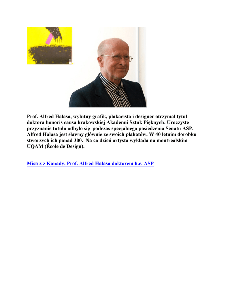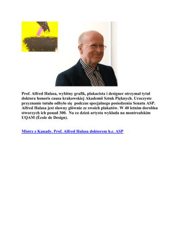 Prof. Alfred Halasa, wybitny grafik, plakacista i designer otrzymał tytuł doktora honoris causa krakowskiej Akademii Sztuk Pięknych. Uroczyste przyznanie tutułu odbyło się podczas specjalnego posiedzenia Senatu ASP. Alfred Halasa jest sławny głównie ze swoich plakatów. W 40 letnim dorobku stworzych ich ponad 300. Na co dzień artysta wykłada na montrealskim UQAM (École de Design). Mistrz z Kanady. Prof. Alfred Hałasa doktorem h.c. ASP