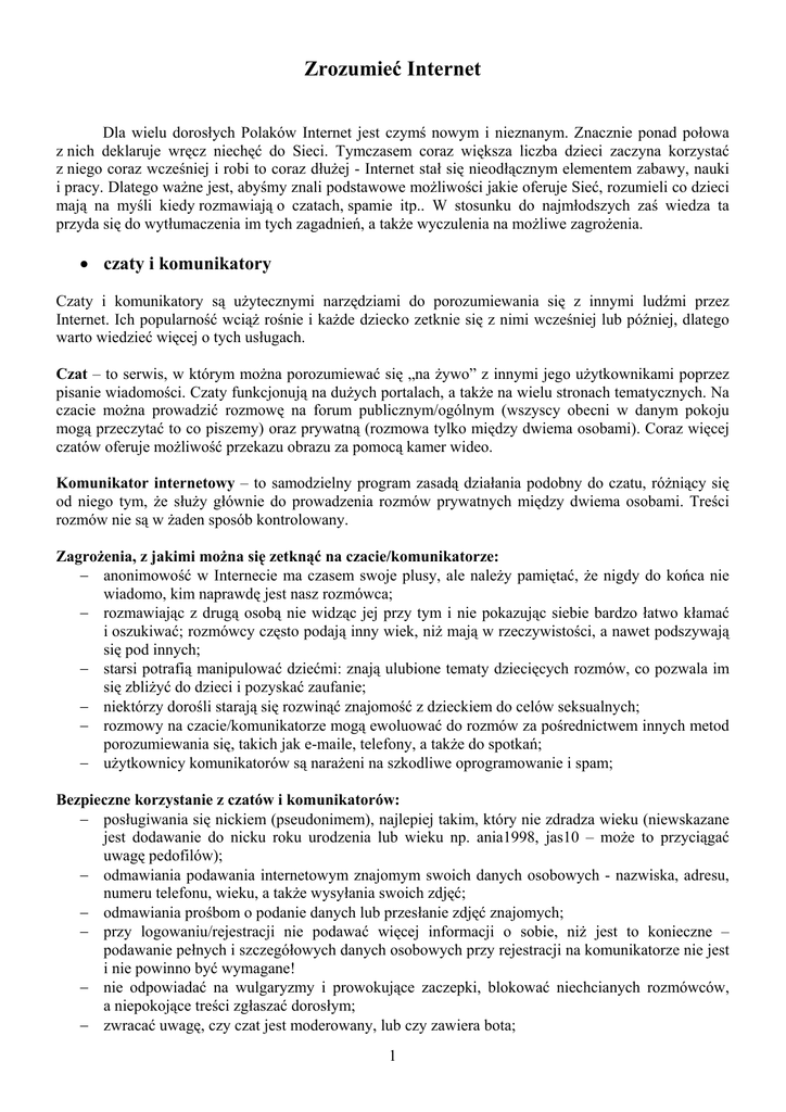 Zrozumieć Internet Dla wielu dorosłych Polaków Internet jest czymś nowym i nieznanym. Znacznie ponad połowa z nich deklaruje wręcz niechęć do Sieci. Tymczasem coraz większa liczba dzieci zaczyna korzystać z niego coraz wcześniej i robi to coraz dłużej - Internet stał się nieodłącznym elementem zabawy, nauki i pracy. Dlatego ważne jest, abyśmy znali podstawowe możliwości jakie oferuje Sieć, rozumieli co dzieci mają na myśli kiedy rozmawiają o czatach, spamie itp.. W stosunku do najmłodszych zaś wiedza ta przyda się do wytłumaczenia im tych zagadnień, a także wyczulenia na możliwe zagrożenia. • czaty i komunikatory Czaty i komunikatory są użytecznymi narzędziami do porozumiewania się z innymi ludźmi przez Internet. Ich popularność wciąż rośnie i każde dziecko zetknie się z nimi wcześniej lub później, dlatego warto wiedzieć więcej o tych usługach. Czat – to serwis, w którym można porozumiewać się „na żywo” z innymi jego użytkownikami poprzez pisanie wiadomości. Czaty funkcjonują na dużych portalach, a także na wielu stronach tematycznych. Na czacie można prowadzić rozmowę na forum publicznym/ogólnym (wszyscy obecni w danym pokoju mogą przeczytać to co piszemy) oraz prywatną (rozmowa tylko między dwiema osobami). Coraz więcej czatów oferuje możliwość przekazu obrazu za pomocą kamer wideo. Komunikator internetowy – to samodzielny program zasadą działania podobny do czatu, różniący się od niego tym, że służy głównie do prowadzenia rozmów prywatnych między dwiema osobami. Treści rozmów nie są w żaden sposób kontrolowany. Zagrożenia, z jakimi można się zetknąć na czacie/komunikatorze: − anonimowość w Internecie ma czasem swoje plusy, ale należy pamiętać, że nigdy do końca nie wiadomo, kim naprawdę jest nasz rozmówca; − rozmawiając z drugą osobą nie widząc jej przy tym i nie pokazując siebie bardzo łatwo kłamać i oszukiwać; rozmówcy często podają inny wiek, niż mają w rzeczywistości, a nawet podszywają się pod innych; − starsi potrafią manipulować dziećmi: znają ulubione tematy dziecięcych rozmów, co pozwala im się zbliżyć do dzieci i pozyskać zaufanie; − niektórzy dorośli starają się rozwinąć znajomość z dzieckiem do celów seksualnych; − rozmowy na czacie/komunikatorze mogą ewoluować do rozmów za pośrednictwem innych metod porozumiewania się, takich jak e-maile, telefony, a także do spotkań; − użytkownicy komunikatorów są narażeni na szkodliwe oprogramowanie i spam; Bezpieczne korzystanie z czatów i komunikatorów: − posługiwania się nickiem (pseudonimem), najlepiej takim, który nie zdradza wieku (niewskazane jest dodawanie do nicku roku urodzenia lub wieku np. ania1998, jas10 – może to przyciągać uwagę pedofilów); − odmawiania podawania internetowym znajomym swoich danych osobowych - nazwiska, adresu, numeru telefonu, wieku, a także wysyłania swoich zdjęć; − odmawiania prośbom o podanie danych lub przesłanie zdjęć znajomych; − przy logowaniu/rejestracji nie podawać więcej informacji o sobie, niż jest to konieczne – podawanie pełnych i szczegółowych danych osobowych przy rejestracji na komunikatorze nie jest i nie powinno być wymagane! − nie odpowiadać na wulgaryzmy i prowokujące zaczepki, blokować niechcianych rozmówców, a niepokojące treści zgłaszać dorosłym; − zwracać uwagę, czy czat jest moderowany, lub czy zawiera bota; 1 − jeśli dziecko chce się spotkać z osobą poznaną przez Internet, powinno Cię o tym poinformować, a na spotkanie udać się tylko w towarzystwie rodzica bądź innej zaufanej osoby dorosłej; • grooming, czyli uwodzenie dzieci w Internecie Grooming to szczególna kategoria relacji tworzona w Internecie między osobami dorosłymi a dziećmi w celu ich uwiedzenia i wykorzystania seksualnego. Seksuolodzy określają takie zachowania dorosłych jako typowe dla osób o skłonnościach pedofilijnych. Zdaniem terapeutów, dla dzieci konsekwencjami groomingu są typowe objawy urazu psychicznego powstałe na skutek wykorzystywania seksualnego. Czynniki ryzyka Dzieci zachowują się w Internecie tak, jak w świecie realnym - są ufne, nie przewidują konsekwencji, są sugestywne. Bardziej narażone na stanie się ofiarami nadużyć w Internecie są dzieci, które: − nie mają zaspokojonych emocjonalnych potrzeb – nie mają silnych i właściwych relacji zarówno z dorosłymi jak i z rówieśnikami; − są ciche – zdolne do trzymania w tajemnicy tego, co im się przydarzyło; − potrzebujące uwagi – dlatego łatwo uwieść je poświęcając im uwagę; − młodsze – nie rozumieją, co się dzieje, nie dziwią się, ufają; − odrzucone przez inne dzieci - dlatego potrzebujące przyjaciół; − mające niskie poczucie własnej wartości – bardziej podatne na skuteczne oddziaływanie pedofila; − ufne – nie zauważają niebezpieczeństwa; − uległe – podatne na manipulacje; − wychowujące się w rodzinie rozbitej – potrzebują uwagi; Co zrobić, aby dziecko nie padło ofiarą groomingu? − porozmawiaj z dzieckiem o tym, jakie kontakty wolno mu nawiązywać za pomocą Internetu, określ, które są niebezpieczne; − zapewnij, że warto żebyś Ty lub inne dorosłe osoby wiedziały o każdej osobie, z którą nawiązuje ono kontakt przez Internet; − powiedz, że cokolwiek zdarzy się niebezpiecznego w Internecie najważniejsze jest, aby dziecko Ci o tym opowiedziało; • szkodliwe treści Obawy rodziców, których dzieci korzystają z Internetu, związane są przede wszystkim z możliwością kontaktu z pornografią. Jednak w Internecie znajduje się też wiele innych treści, które mogą być dla dzieci szkodliwe, a z którymi można zetknąć się zupełnie przypadkowo. Jakie treści mogą być dla dzieci szkodliwe? − zawierające przemoc, pornografię, wulgaryzmy; − propagujące rasizm i ksenofobię; − nawołuj