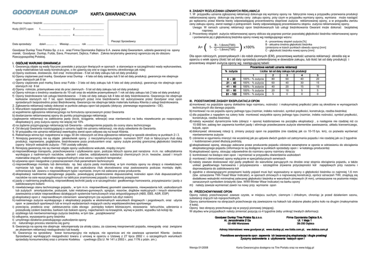 KARTA GWARA GWARANCYJNA Rozmiar /nazwa / bieżnik: ……………………………….……………………………………………………………………….. Kody (DOT) opon: 1.……………….…………………...……….… 2.……………….………..………………….… 3.……………….…………………...……….… 4.……………….………..………………….… II. ZASADY ROZLICZANIA UZNANYCH REKLAMACJI 1. W przypadku uznania zgłoszonej reklamacji dokonuje się wymiany opony na fabrycznie nową a przypadku przerwania produkcji reklamowanej opony dokonuje się zwrotu ceny zakupu opony, przy czym w przypadku wymiany opony, wymiana może nastąpić po wpłaceniu przez klienta kwoty odpowiadającej procentowemu stopniowi zużycia reklamowanej opony, a w przypadku zwrotu ceny zakupu opony, zwrot nastąpi z potrąceniem kwoty odpowiadającej procentowemu stopniu zużycia reklamowanej opony. Uwaga: W ramach uznanej reklamacji opon bieżnikowanych lub usługi bieżnikowania Gwarant może dokonać bezpłatnej naprawy. 2. Procentowy stopień zużycia reklamowanej opony oblicza się poprzez pomiar pozostałej głębokości bieżnika reklamowanej opony i porównanie jej z głębokością bieżnika opony nowej wg następującego wzoru: Pieczęć Sprzedawcy Data sprzedaży: dzień …………… …. Miesiąc..………………. rok ...……………………….. Goodyear Dunlop Tires Polska Sp. z o.o. oraz Firma Oponiarska Dębica S.A. zwane dalej Gwarantem, udziela gwarancji na opony marek; Goodyear, Dunlop, Fulda, Sava, Pneumant, Dębica, Falken. Zakres terytorialny gwarancji ogranicza się do obszaru Rzeczypospolitej Polskiej. I. OGÓLNE WARUNKI GWARANCJI 1. Gwarancją objęte są wady fizyczne powstałe z przyczyn tkwiących w oponach a stanowiące w szczególności wady wykonawstwa, wady materiałowe lub wady konstrukcyjne, o ile ujawnią się one w ciągu terminu określonego jak niżej: a) Opony osobowe, dostawcze, 4x4 oraz motocyklowe - 5 lat od daty zakupu lub od daty produkcji b) Opony ciężarowe pod marką Goodyear oraz Dunlop - 4 lata od daty zakupu lub 5 lat od daty produkcji, gwarancja nie obejmuje opon starszych jak 8 lat c) Opony ciężarowe pod marką Sava oraz Fulda - 3 lata od daty zakupu lub 4 lata od daty produkcji, gwarancja nie obejmuje opon starszych niż 8 lat d) Opony rolnicze, przemysłowe oraz do prac ziemnych - 5 lat od daty zakupu lub od daty produkcji e) Opony rolnicze o średnicy osadzenia do 10 cali oraz do wózków przemysłowych 1 rok od daty zakupu lub 2 lata od daty produkcji f) Opony bieżnikowane lub usługa bieżnikowania - 3 lata od daty zakupu lub 4 lata od daty bieżnikowania. Gwarancja nie obejmuje karkasów starszych niż 7 lat, opon bieżnikowanych przez inne bieżnikownie niż autoryzowane przez Goodyear oraz opon sprzedanych bezpośrednio przez Bieżnikownię. Gwarancja nie obejmuje także materiału karkasu Klienta z usługi bieżnikowania. 2. Zgłoszenia reklamacji należy dokonać w punkcie zakupu opon lub pojazdu (dotyczy pierwszego wyposażenia - OE). 3. Warunkiem rozpatrzenia reklamacji jest: a) wypełnienie zgłoszenia reklamacyjnego na formularzu opracowanym przez Gwaranta b) dostarczenie reklamowanej opony do punktu przyjmującego reklamację c) zgłoszenie reklamacji na zakłócenia jazdy (bicie, ściąganie, wibracje) oraz nierówności na boku niezwłocznie po rozpoczęciu eksploatacji tj. przy zużyciu opony nie więcej niż 10% d) na żądanie przyjmującego reklamację lub Gwaranta - udostępnienie pojazdu do oceny stanu technicznego 4. Od decyzji Gwaranta rozstrzygającej o uznaniu bądź nie uznaniu reklamacji, nie służy odwołanie do Gwaranta. 5. W przypadku nie uznania reklamacji ewentualny zwrot opon odbywa się na koszt Klienta. 6. Reklamacja winna być rozpatrzona w ciągu 30 dni roboczych od dnia zgłoszenia reklamacji w sposób określony w punktach 2 i 3. 7. Niniejszą gwarancją nie są objęte jakiekolwiek opony z nieczytelnym/usuniętym numerem DOT i/lub nr fabrycznym i/lub datą produkcji, naprawiane, pogłębiane, bieżnikowane poza producentem oraz opony zużyte poniżej granicznej głębokości bieżnika (opony których wskaźniki zużycia - TWI zostały odkryte). 8. Niniejszą gwarancją nie są również objęte opony uszkodzone wskutek, między innymi: a) nieprawidłowego transportu, przechowywania i użytkowania opon, podczas których opona jest narażona m.in. na: odkształcenia wynikające z nadmiernych nacisków, uderzeń i udarów, oddziaływania substancji chemicznych (m.in. kwasów, zasad i innych materiałów żrących, materiałów ropopochodnych oraz ozonu i wysokich temperatur; b) używania opon niezgodnie z przeznaczeniem i/lub parametrami technicznymi c) nieprawidłowego montażu lub demontażu np. bez użycia pasty monterskiej, w tym montażu opony na obręcz o niewłaściwym rozmiarze lub typie, lub na obręcz, która jest uszkodzona i/lub skorodowana oraz zastosowania podczas montażu dętki, ochraniacza lub zaworu o nieprawidłowym typie i wymiarze, innym niż zalecane przez producenta. d) eksploatacji nadmiernie obciążonego pojazdu, powodującej przekroczenie dopuszczalnej nośności opon i/lub dopuszczalnych nacisków na osie wyszczególnionych na tabliczce znamionowej pojazdu i dozwolonej przepisami e) jazdy z nadmierną prędkością, nieprawidłowej techniki jazdy a w szczególności gwałtownego hamowania, przyspieszania i jazdy z zablokowanymi kołami f) niewłaściwego stanu technicznego pojazdu , w tym m.in. nieprawidłowej geometrii zawieszenia, niewyważenia kół, uszkodzonych lub zużytych amortyzatorów, poduszek, tulei metalowo-gumowych, sprężyn, resorów, drążków reakcyjnych i innych elementów zawieszenia a także nieprawidłowo działających systemów hamulcowych oraz antypoślizgowych (ABS, EBS, ASR, ESP) g) eksploatacji opon z nieprawidłowym ciśnieniem wewnętrznym (za wysokim lub zbyt niskim) h) nadmierneg
