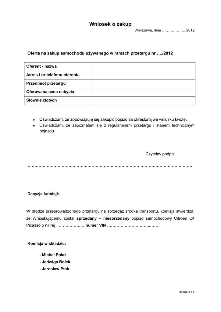 Wniosek o zakup Warszawa, dnia ………………..2012 Oferta na zakup samochodu używanego w ramach przetargu nr …./2012 Oferent - nazwa Adres i nr telefonu oferenta Przedmiot przetargu Oferowana cena nabycia Słownie złotych Oświadczam, że zobowiązuję się zakupić pojazd za określoną we wniosku kwotę. Oświadczam, że zapoznałem się z regulaminem przetargu i stanem technicznym pojazdu Czytelny podpis …………………………………………………………………………………………………………… Decyzja komisji: W drodze przeprowadzonego przetargu na sprzedaż środka transportu, komisja stwierdza, że Wnioskującemu został sprzedany – niesprzedany pojazd samochodowy Citroen C4 Picasso o nr rej.: …………….… numer VIN …………………………..…… Komisja w składzie: - Michał Polak - Jadwiga Bolek - Jarosław Ptak Strona 1 z 1