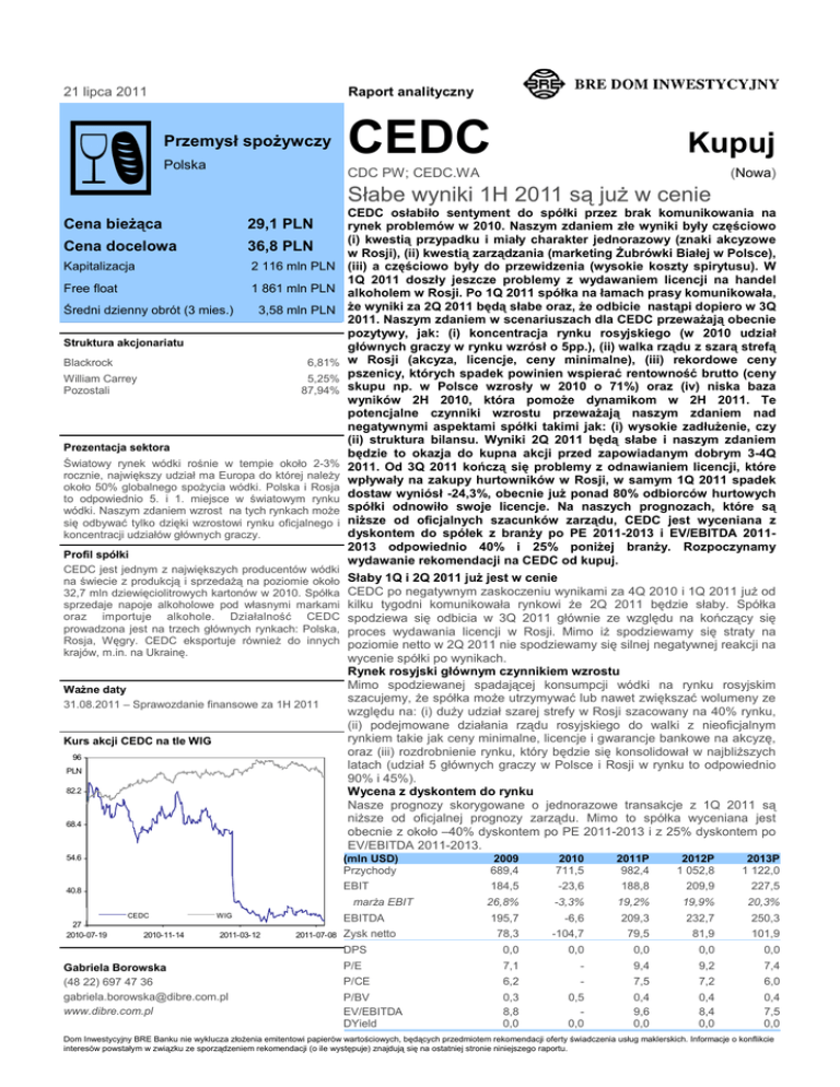 Nazwa BRE Bank Securities BRE Bank Securities 21 lipca 2011 Raport analityczny Przemysł spoŜywczy Polska CEDC Kupuj CDC PW; CEDC.WA (Nowa) Słabe wyniki 1H 2011 są juŜ w cenie Cena bieŜąca 29,1 PLN Cena docelowa 36,8 PLN Kapitalizacja 2 116 mln PLN Free float 1 861 mln PLN Średni dzienny obrót (3 mies.) 3,58 mln PLN Struktura akcjonariatu Blackrock 6,81% William Carrey Pozostali 5,25% 87,94% Prezentacja sektora Światowy rynek wódki rośnie w tempie około 2-3% rocznie, największy udział ma Europa do której naleŜy około 50% globalnego spoŜycia wódki. Polska i Rosja to odpowiednio 5. i 1. miejsce w światowym rynku wódki. Naszym zdaniem wzrost na tych rynkach moŜe się odbywać tylko dzięki wzrostowi rynku oficjalnego i koncentracji udziałów głównych graczy. Profil spółki CEDC jest jednym z największych producentów wódki na świecie z produkcją i sprzedaŜą na poziomie około 32,7 mln dziewięciolitrowych kartonów w 2010. Spółka sprzedaje napoje alkoholowe pod własnymi markami oraz importuje alkohole. Działalność CEDC prowadzona jest na trzech głównych rynkach: Polska, Rosja, Węgry. CEDC eksportuje równieŜ do innych krajów, m.in. na Ukrainę. WaŜne daty 31.08.2011 – Sprawozdanie finansowe za 1H 2011 Kurs akcji CEDC na tle WIG 96 PLN 82.2 68.4 CEDC osłabiło sentyment do spółki przez brak komunikowania na rynek problemów w 2010. Naszym zdaniem złe wyniki były częściowo (i) kwestią przypadku i miały charakter jednorazowy (znaki akcyzowe w Rosji), (ii) kwestią zarządzania (marketing śubrówki Białej w Polsce), (iii) a częściowo były do przewidzenia (wysokie koszty spirytusu). W 1Q 2011 doszły jeszcze problemy z wydawaniem licencji na handel alkoholem w Rosji. Po 1Q 2011 spółka na łamach prasy komunikowała, Ŝe wyniki za 2Q 2011 będą słabe oraz, Ŝe odbicie nastąpi dopiero w 3Q 2011. Naszym zdaniem w scenariuszach dla CEDC przewaŜają obecnie pozytywy, jak: (i) koncentracja rynku rosyjskiego (w 2010 udział głównych graczy w rynku wzrósł o 5pp.), (ii) walka rządu z szarą strefą w Rosji (akcyza, licencje, ceny minimalne), (iii) rekordowe ceny pszenicy, których spadek powinien wspierać rentowność brutto (ceny skupu np. w Polsce wzrosły w 2010 o 71%) oraz (iv) niska baza wyników 2H 2010, która pomoŜe dynamikom w 2H 2011. Te potencjalne czynniki wzrostu przewaŜają naszym zdaniem nad negatywnymi aspektami spółki takimi jak: (i) wysokie zadłuŜenie, czy (ii) struktura bilansu. Wyniki 2Q 2011 będą słabe i naszym zdaniem będzie to okazja do kupna akcji przed zapowiadanym dobrym 3-4Q 2011. Od 3Q 2011 kończą się problemy z odnawianiem licencji, które wpływały na zakupy hurtowników w Rosji, w samym 1Q 2011 spadek dostaw wyniósł -24,3%, obecnie juŜ ponad 80% odbiorców hurtowych spółki odnowiło swoje licencje. Na naszych prognozach, które są niŜsze od oficjalnych szacunków zarządu, CEDC jest wyceniana z dyskontem do spółek z branŜy po PE 2011-2013 i EV/EBITDA 20112013 odpowiednio 40% i 25% poniŜej branŜy. Rozpoczynamy wydawanie rekomendacji na CEDC od kupuj. Słaby 1Q i 2Q 2011 juŜ jest w cenie CEDC po negatywnym zaskoczeniu wynikami za 4Q 2010 i 1Q 2011 juŜ od kilku tygodni komunikowała rynkowi Ŝe 2Q 2011 będzie słaby. Spółka spodziewa się odbicia w 3Q 2011 głównie ze względu na kończący się proces wydawania licencji w Rosji. Mimo iŜ spodziewamy się straty na poziomie netto w 2Q 2011 nie spodziewamy się silnej negatywnej reakcji na wycenie spółki po wynikach. Rynek rosyjski głównym czynnikiem wzrostu Mimo spodziewanej spadającej konsumpcji wódki na rynku rosyjskim szacujemy, Ŝe spółka moŜe utrzymywać lub nawet zwiększać wolumeny ze względu na: (i) duŜy udział szarej strefy w Rosji szacowany na 40% rynku, (ii) podejmowane działania rządu rosyjskiego do walki z nieoficjalnym rynkiem takie jak ceny minimalne, licencje i gwarancje bankowe na akcyzę, oraz (iii) rozdrobnienie rynku, który będzie się konsolidował w najbliŜszych latach (udział 5 głównych graczy w Polsce i Rosji w rynku to odpowiednio 90% i 45%). Wycena z dyskontem do rynku Nasze prognozy skorygowane o jednorazowe transakcje z 1Q 2011 są niŜsze od oficjalnej prognozy zarządu. Mimo to spółka wyceniana jest obecnie z około –40% dyskontem po PE 2011-2013 i z 25% dyskontem po EV/EBITDA 2011-2013. (mln USD) Przychody 54.6 EBIT 40.8 CEDC 2010-11-14 WIG 2011-03-12 Gabriela Borowska (48 22) 697 47 36 [email protected] www.dibre.com.pl 2011-07-08 2010 711,5 2011P 982,4 2012P 1 052,8 2013P 1 122,0 184,5 -23,6 188,8 209,9 227,5 26,8% -3,3% 19,2% 19,9% 20,3% 195,7 78,3 -6,6 -104,7 209,3 79,5 232,7 81,9 250,3 101,9 DPS 0,0 0,0 0,0 0,0 0,0 P/E 7,1 - 9,4 9,2 7,4 P/CE 6,2 - 7,5 7,2 6,0 P/BV EV/EBITDA DYield 0,3 8,8 0,0 0,5 0,0 0,4 9,6 0,0 0,4 8,4 0,0 0,4 7,5 0,0 marŜa EBIT 27 2010-07-19 2009 689,4 EBITDA Zysk netto Dom Inwestycyjny 21 lipca 2011 BRE Banku nie wyklucza złoŜenia emitentowi papierów wartościowych, będących przedmiotem rekomendacji oferty świadczenia usług maklerskich. Informacje o konflikcie interesów powstałym w związku ze sporządzeniem rekomendacji (o ile występuje) znajdują się na ostatniej stronie niniejszego raportu. CEDC Podsumowanie Potencjał w konsolidacji rynku rosyjskiego… Rosyjski rynek wódki jest obecnie rozdrobniony. Według szacunków spółki w 2010 pięciu głównych producentów wódki w Rosji posiadało łączny udział w rynku na poziomie około 50% (26% w 2006). W miarę dalszej konsolidacji ten udział moŜe wzrosnąć w ciągu następnych pięciu lat do 70–80%. CEDC jako największy podmiot na tamtym rynku powinno brać udział w konsolidacji sektora. Zakładamy, Ŝe spółka będzie utrzymywała w długim terminie udział 32% wśród pierwszych pięciu graczy na tamtejszym rynku (około 34% w 2010). …oraz w legalizacji rynku rosyjskiego… Rynek nieoficjalny wódki w Rosji jest szacowany na poziomie około 40%. Rynek nieoficjalny w