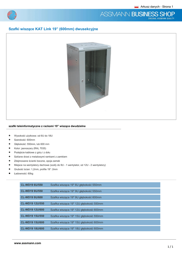 Arkusz danych - Strona 1 Szafki wiszące KAT Link 19” (600mm) dwusekcyjne szafki teleinformatyczne z rackami 19” wiszące dwudzielne Wysokość użytkowa: od 6U do 18U Szerokość: 600mm Głębokość: 550mm, lub 600 mm Kolor: jasnoszary (RAL 7035) Podejście kablowe z góry i z dołu Szklane drzwi z metalowymi ramkami z zamkiem Zdejmowane ścianki boczne, opcja zamek Miejsce na wentylatory dachowe (szafy do 9U - 1 wentylator, od 12U - 2 wentylatory) Grubość ścian: 1,2mm, profile 19”: 2mm Ładowność: 60kg CL-WD19 6U/550 Szafka wisząca 19" 6U głębokość 550mm CL-WD19 9U/550 Szafka wisząca 19" 9U głębokość 550mm CL-WD19 9U/600 Szafka wisząca 19" 9U głębokość 600mm CL-WD19 12U/550 Szafka wisząca 19" 12U głębokość 550mm CL-WD19 12U/600 Szafka wisząca 19" 12U głębokość 600mm CL-WD19 15U/550 Szafka wisząca 19" 15U głębokość 550mm CL-WD19 15U/600 Szafka wisząca 19" 15U głębokość 600mm CL-WD19 18U/600 Szafka wisząca 19" 18U głębokość 600mm www.assmann.com 1/1