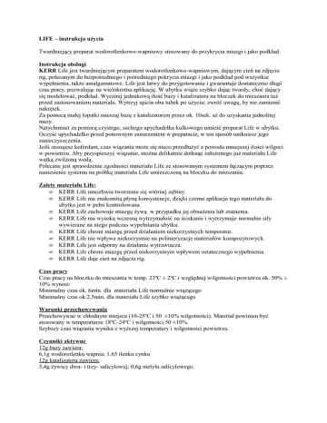 LIFE – instrukcja użycia Twardniejący preparat wodorotlenkowo-wapniowy stosowany do przykrycia miazgi i jako podkład. Instrukcja obsługi KERR Life jest twardniejącym preparatem wodorotlenkowo-wapniowym, dającym cień na zdjęciu rtg, polecanym do bezpośredniego i pośredniego pokrycia miazgi i jako podkład pod wszystkie wypełnienia, także amalgamatowe. Life jest łatwy do przygotowania i gwarantuje dostatecznie długi czas pracy, pozwalając na wielokrotna aplikację. W ubytku wiąże szybko dając twardy, choć dający się modelować, podkład. Wyciśnij jednakową ilość bazy i katalizatora na bloczek do mieszania tuż przed zastosowaniem materiału. Wytrzyj ujścia obu tubek po użyciu; zwróć uwagę, by nie zamienić nakrętek. Za pomocą małej łopatki mieszaj bazę z katalizatorem przez ok. 10sek. aż do uzyskania jednolitej masy. Natychmiast za pomocą czystego, suchego upychadełka kulkowego umieść preparat Life w ubytku. Oczyść upychadełko przed ponownym zanurzeniem w preparacie, w ten sposób unikniesz jego zanieczyszczenia. Jeśli stosujesz koferdam, czas wiązania może się nieco przedłużyć z powodu mniejszej ilości wilgoci w powietrzu. Aby przyspieszyć wiązanie, można delikatnie dotknąć założonego już materiału Life watką zwilżoną wodą. Polecane jest sprawdzenie zgodności materiału Life ze stosowanym systemem łączącym poprzez naniesienie systemu na próbkę materiału Life umieszczoną na bloczku do mieszania. Zalety materiału Life: • KERR Life umożliwia tworzenie się wtórnej zębiny. • KERR Life ma znakomitą płyną konsystencje, dzięki czemu aplikacja tego materiału do ubytku jest w pełni kontrolowana. • KERR Life zachowuje miazgę żywą w przypadku jej obnażenia lub zranienia. • KERR Life ma wysoką wczesną wytrzymałość na ściskanie i wytrzymuje normalne siły wywierane na niego podczas wypełniania ubytku. • KERR Life chroni miazgę przed działaniem niekorzystnych temperatur. • KERR Life nie wpływa niekorzystnie na polimeryzacje materiałów kompozytowych. • KERR Life jest odporny na działanie wytrawiacza. • KERR Life chroni miazgę przed niekorzystnym wpływem ostatecznego wypełnienia. • KERR Life daje cień na zdjęciu rtg. Czas pracy Czas pracy na bloczku do mieszania w temp. 23ºC ± 2ºC i względnej wilgotności powietrza ok. 50% ± 10% wynosi: Minimalny czas ok. 6min. dla materiału Life normalnie wiążącego Minimalny czas ok.2,5min. dla materiału Life szybko wiążącego Warunki przechowywania Przechowywać w chłodnym miejscu (10-25ºC i 50 ±10% wilgotności). Materiał powinien być stosowany w temperaturze 18ºC-24ºC i wilgotności 50 ±10%. Szybszy czas wiązania wynika z wyższej temperatury i wilgotności powietrza. Czynniki aktywne 12g bazy zawiera: 6,1g wodorotlenku wapnia; 1,65 tlenku cynku 12g katalizatora zawiera: 5,4g żywicy dwu- i trzy- salicylowej; 0,6g metylu salicylowego. Uwaga Skład chemiczny niektórych materiałów kompozytowych może powodować przejściowe, różowe zabarwienie materiału Life. Dzieje się tak na skutek reakcji pomiędzy żywicą materiału Life i nadtlenku benzoilu, który jest stosowany w niektórych materiałach kompozytowych.. To różowe zabarwienie pojawia się i znika w ciągu dwóch godzin i nie wpływa na własności fizyczne kompozytu. OGRANICZONA GWARANCJA – OGRANICZENIEM ODPOWIEDZIALNOŚCI FIRMY KERR. Techniczne doradztwo firmy Kerr, zarówno ustne jak i pisemne, ma za zadanie wspomóc stomatologów stosujących produkty tej firmy. Jednak doradztwo takie nie powoduje rozszerzenia ograniczonej gwarancji, jaką daje firma Kerr, ani nie zwalnia samych lekarzy dentystów od sprawdzenia, czy produkty firmy Kerr nadają się do zaplanowanych przez nich zastosowań. Lekarze stomatolodzy ponoszą odpowiedzialność za nieprawidłowe użycie materiałów firmy Kerr. W przypadku wady materiału lub złego wykonawstwa, odpowiedzialność firmy Kerr jest ograniczona do wymiany uszkodzonego produktu. Aby skorzystać z ograniczonej gwarancji firmy Kerr, wadliwy produkt musi być zwrócony firmie. Firma Kerr w żadnym razie nie ponosi odpowiedzialności za jakiekolwiek pośrednie przypadkowe lub celowe zniszczenia. POZA WYMIENIONYMI WYŻEJ PRZYPADKAMI, FIRMA KERR NIE UDZIELA ŻADNYCH GWARANCJI JAWNYCH LUB DAJĄCYCH SIĘ WYWNIOSKOWAĆ, WŁĄCZAJĄC W TO GWARANCJE ZWIĄZANE ZE STOSOWANIEM SIĘ DO INSTRUKCJI, Z JAKOŚCIĄ MATERIAŁU, LUB JEGO WŁAŚCIWYM ZASTOSOWANIEM.