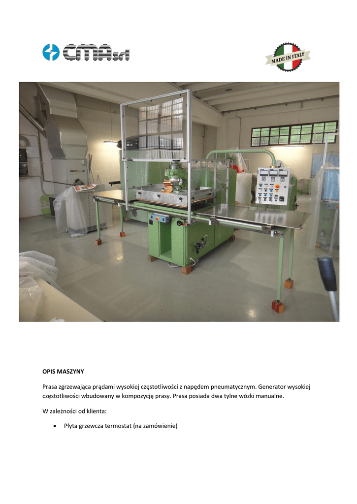 OPIS MASZYNY Prasa zgrzewająca prądami wysokiej częstotliwości z napędem pneumatycznym. Generator wysokiej częstotliwości wbudowany w kompozycję prasy. Prasa posiada dwa tylne wózki manualne. W zależności od klienta: Płyta grzewcza termostat (na zamówienie) Schemat techniczny: Siła maksymalnego zamknięcia prasy Rozmiar górnej powierzchni prasy Wymiary powierzchni z wózkami Moc generatora Częstotliwośd pracy Napięcie zasilacza Ciśnienie sprężonego powietrza Artykuły produkowane Wydajnośd 900 kg 650x920 mm 800x1200 mm 10 kW 27,12 Mhz 400 V - 3F+T – 50/60 Hz 0,6 MPa Dziecięce, pakowania, blister, paramedyczne i wiele innych W zależności od tempa zgrzewania i możliwości operatora