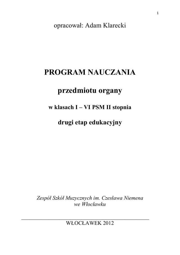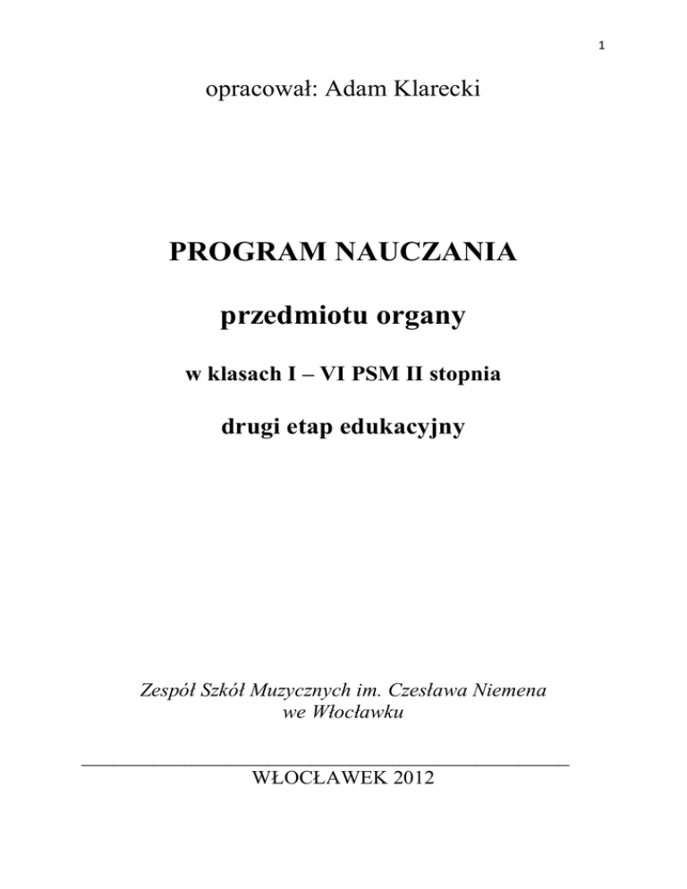 1 opracował: Adam Klarecki PROGRAM NAUCZANIA przedmiotu organy w klasach I – VI PSM II stopnia drugi etap edukacyjny Zespół Szkół Muzycznych im. Czesława Niemena we Włocławku _______________________________________________ WŁOCŁAWEK 2012 2 spis treści 1. wstęp -str. 3 2. cele nauczania -str. 3 3. materiał nauczania obejmujący: a) treści nauczania - zgodne z treściami zawartymi w podstawie programowej b) formy sprawdzania osiągnięć ucznia c) osiągnięcia nauczania – opis osiągnięć ucznia na zakończenie etapu edukacyjnego -str. 4 -str. 4 -str. 5 4. realizacja programu nauczania: a) rozkład materiału b) propozycje literatury muzycznej c) kryteria oceniania -str. 7 -str. 11 -str. 19 5. komentarz do realizacji programu -str. 20 3 I. WSTĘP: Program nauczania (II etap edukacyjny) Organy przeznaczony do realizacji w Zespole Szkół Muzycznych im. Czesława Niemena we Włocławku, został stworzony zgodnie z: Rozporządzeniem Ministra Kultury i Dziedzictwa Narodowego z dnia 9 grudnia 2010 r. w sprawie podstaw programowych kształcenia w zawodach szkolnictwa artystycznego w publicznych szkołach artystycznych, oraz: rozporządzeniem Ministra Kultury i Dziedzictwa Narodowego z dnia 25 lutego 2011 r. w sprawie dopuszczania do uŜytku w szkołach artystycznych programów nauczania oraz dopuszczania do uŜytku szkolnego podręczników dla szkół artystycznych. Czas trwania lekcji przedmiotu jest następujący: 2 lekcje po 45 minut tygodniowo w klasach od 1 do 5 3 lekcje po 45 minut tygodniowo w klasie 6 II. CELE NAUCZANIA: 1. Rozbudzanie zamiłowania do muzyki. 2. Rozwijanie uzdolnień muzycznych ucznia w sposób dostosowany do jego wieku i predyspozycji. 3. Zapewnienie harmonijnego rozwoju ucznia. 4. Opanowanie podstawowych zasad gry na organach. 6. Rozwijanie techniki instrumentalnej, pamięci odtwórczej. 7. Kształtowanie wyobraźni muzycznej i wraŜliwości na środki wyrazu muzycznego a zwłaszcza na prawidłową registrację. 8. Integracja wiedzy teoretycznej z umiejętnościami praktycznymi (korelacja z innymi przedmiotami). 9. Rozwijanie umiejętności gry a vista. 10. Kształcenie umiejętności samodzielnej pracy nad utworem oraz samokontroli. 11. Poznanie bogatej literatury organowej, róŜnych form i stylów. Rozwijanie naturalnej potrzeby ekspresji twórczej ucznia i kształcenie wyobraźni artystycznej. 12. Kształcenie opanowania estradowego. 13. Zachęcanie do aktywnego uczestnictwa w Ŝyciu muzycznym. 4 III. MATERIAŁ NAUCZANIA: Obejmuje: A. Treści nauczania - zgodne z treściami zawartymi w podstawie programowej B. Formy sprawdzania osiągnięć ucznia - niezbędne do realizacji programu nauczania C. Osiągnięcia nauczania – opis osiągnięć ucznia na zakończenie etapu edukacyjnego A. TREŚCI NAUCZANIA: 1. Podstawowa wiedza w zakresie historii instrumentu, budowy instrumentu i jego części, obsługi oraz konserwacji. 2. Prawidłowy aparat gry umoŜliwiający swobodę i biegłość techniczną. 3. Technika gry z uwzględnieniem wszystkich sposobów artykulacji. 4. Wiedza w zakresie interpretacji muzycznej z uwzględnieniem znajomości kanonów stylu i formy muzycznej. 5. Czytanie a vista utworów o róŜnym stopniu trudności. 6. Samodzielna praca nad utworem w zakresie: • opracowania pod względem techniczno-wykonawczym, • samodzielnego pokonywania trudnych miejsc, • świadomego ćwiczenia i korygowania błędów. 7. Praktyka estradowa z uwzględnieniem: • obycia estradowego, • technik koncentracji, • technik pokonywania tremy, • krytycznej oceny wykonywanego utworu. 8. Muzykowanie zespołowe z uwzględnieniem róŜnorodnych form muzyki kameralnej. 9. Literatura muzyczna dla danego instrumentu, dobrana przez nauczyciela w zaleŜności od moŜliwości ucznia z uwzględnieniem jego preferencji. 10.Program na zakończenie etapu edukacyjnego. B. FORMY SPRAWDZANIA OSIĄGNIĘĆ UCZNIA – NIEZBĘDNE DO REALIZACJI PROGRAMU NAUCZANIA 1. Formułowanie przez nauczyciela wymogów edukacyjnych, niezbędnych do uzyskania ocen śródrocznych i końcowo rocznych 5 • Informowanie ucznia o jego poziomie osiągnięć edukacyjnych (technicznych i muzycznych). • Pomoc uczniowi w nauce samodzielnego opanowania utworów. • Pomoc uczniowi w planowaniu własnego rozwoju. • Motywowanie ucznia do dalszej pracy. • Dostarczanie informacji rodzicom i nauczycielom przedmiotów ogólnomuzycznych o uzdolnieniach ucznia oraz o ewentualnych trudnościach w uczeniu się. 2. Przeprowadzanie przesłuchań śródrocznych i egzaminów promocyjnych (końcowo rocznych). 3. Elementy brane pod uwagę przy ocenach: • przesłuchania semestralne (półroczne), • przesłuchania promocyjne (końcoworoczne), • popisy klasowe, szkolne i inne występy, • czytanie a’vista, • umiejętność samodzielnego przygotowania utworów, • aktywność ucznia: frekwencja, stopień przygotowania do lekcji, udział w koncertach szkolnych, pozaszkolnych oraz lekcjach otwartych. Wszystkie komisyjne przesłuchania (egzaminy) oceniane są w skali od 0 – 25 punktów. 25 pkt – stopień celujący 21 – 24 pkt – stopień bardzo dobry 16 – 20 pkt – stopień dobry 13 – 15 pkt – stopień dostateczny 11 – 12 pkt – stopień dopuszczający (z przedmiotu głównego ocena dopuszczająca jest oceną niepromującą) do 10 pkt – stopień niedostateczny (j.w.) C. OSIĄGNIĘCIA NAUCZANIA – OPIS OSIĄGNIĘĆ UCZNIA NA ZAKOŃCZENIE ETAPU EDUKACYJNEGO 1. Umiejętność przygotowania organów do gry. Opanowanie podstawowych wiadomości na temat budowy organów, poznanie podstawowych części i ich funkcji, umiejętność ich poprawnego nazwania. Poznanie zasad działania róŜnych traktur organów, rozróŜnianie głosów poszczególnych rejestrów, umiejętność posługiwania się urządzeniami stołu gry. Znajomość podstawowych wiadomości z historii instrumentu. 2. Opanowanie swobodnego posługiwania się aparatem gry poprzez prawidłową korelację lewej i prawej rę