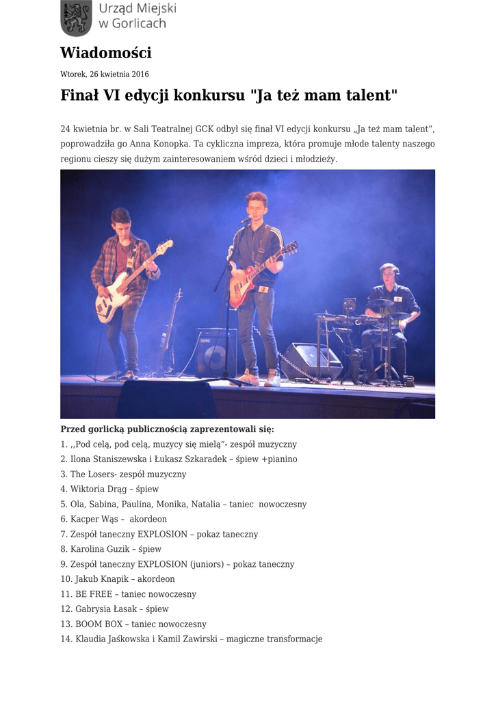 Wiadomości Wtorek, 26 kwietnia 2016 Finał VI edycji konkursu "Ja też mam talent" 24 kwietnia br. w Sali Teatralnej GCK odbył się finał VI edycji konkursu „Ja też mam talent”, poprowadziła go Anna Konopka. Ta cykliczna impreza, która promuje młode talenty naszego regionu cieszy się dużym zainteresowaniem wśród dzieci i młodzieży. Przed gorlicką publicznością zaprezentowali się: 1. ,,Pod celą, pod celą, muzycy się mielą”- zespół muzyczny 2. Ilona Staniszewska i Łukasz Szkaradek – śpiew +pianino 3. The Losers- zespół muzyczny 4. Wiktoria Drąg – śpiew 5. Ola, Sabina, Paulina, Monika, Natalia – taniec nowoczesny 6. Kacper Wąs – akordeon 7. Zespół taneczny EXPLOSION – pokaz taneczny 8. Karolina Guzik – śpiew 9. Zespół taneczny EXPLOSION (juniors) – pokaz taneczny 10. Jakub Knapik – akordeon 11. BE FREE – taniec nowoczesny 12. Gabrysia Łasak – śpiew 13. BOOM BOX – taniec nowoczesny 14. Klaudia Jaśkowska i Kamil Zawirski – magiczne transformacje Występy oceniało jury złożone z przedstawicieli lokalnych mediów. Obradom jury przewodził Piotr Nowak. Jury w składzie: Piotr Nowak – przewodniczący, Yvetta Walecka – RTVG, Lech Klimek – Gazeta Krakowska, Marek Podraza – Gorlice.tv, Iwona Warzycka – portal haloGorlice.info, Fabian Grądalski – portal gorlice24.pl, Piotr Popielarz – portal terazgorlice.pl, Piotr Krygowski – portal abcgorlice.pl po wysłuchaniu i obejrzeniu 14 prezentacji postanowiło przyznać: – I miejsce i 500 zł dla Kacpra Wąsa. Kacper Wąs – ma 10 lat, chodzi do klasy 4 Szkoły Podstawowej w Krygu i klasy 3 Państwowej Szkoły Muzycznej I stopnia w Gorlicach. Jego nauczycielem gry na akordeonie jest pan Aleksander Cetnarowski. Chłopiec ma na swoim koncie kilka sukcesów. W grudniu 2014 roku Kacper otrzymał wyróżnienie na Międzynarodowym Festiwalu Muzyki Akordeonowej w Przemyślu. W 2015 roku zajął II miejsce na XVI Gorlickich Konfrontacjach Akordeonowych, oraz 23.04.2016 roku zdobył wyróżnienie na XIX Spotkaniach Akordeonowych w Sanoku. Zdobył również wyróżnienie w V edycji konkursu „Ja też mam talent”. W styczniu tego roku zajął II miejsce w Festiwalu Sądeckie Młode Talenty, a w marcu br. zdobył wyróżnienie na XI Ogólnopolskim Konkursie Młodych Instrumentalistów w Jaśle. – II miejsce i 300 zł dla Karoliny Guzik. – III miejsce i 200 zł dla zespołu tanecznego „BOOM BOX”. Nagrodę publiczności (tablet oraz 200 zł) jury przyznało zespołowi tanecznemu „Explosion” (juniors). Nagrodę specjalną – nagranie audio w Regnat Studio w Woli Cieklińskiej przyznano zespołowi „The Losers”. W trakcie obrad jury, podczas przerwy zagrał Zespół ElendeS, polsko-belgijski duet z Krakowa w skład, którego wchodzą multiinstrumentaliści: Stein Goddere i Łukasz Chrzanowski (gorliczanin). Akustyczne brzmienie zespołu i ładnie ze sobą brzmiące głosy muzyków stworzyły przyjemną atmosferę dla koncertu, który spotkał się z dobrym przyjęciem publiczności i był przyjemnym zwieńczeniem wieczoru. Foto. Bartosz Knapik Fotorelacja na stronie www.gck.gorlice.pl