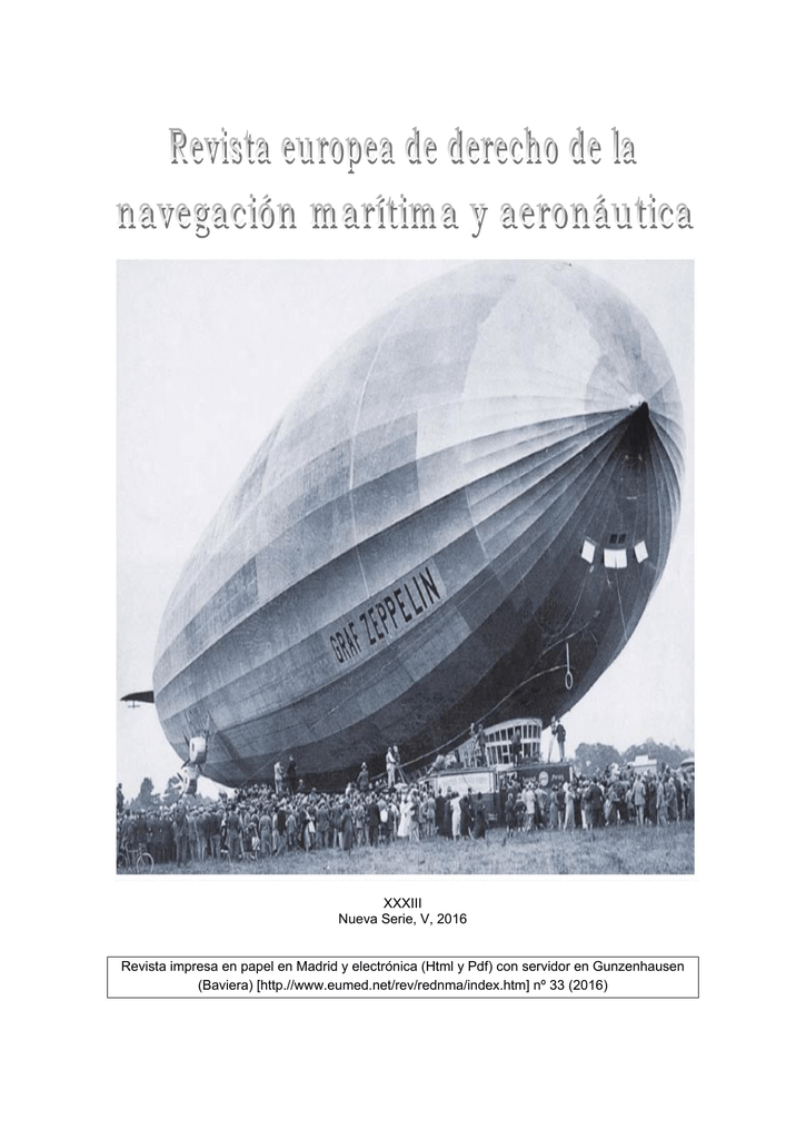 XXXIII Nueva Serie, V, 2016 Revista impresa en papel en Madrid y electrónica (Html y Pdf) con servidor en Gunzenhausen (Baviera) [http.//www.eumed.net/rev/rednma/index.htm] nº 33 (2016) La «Revista Europea de Derecho de la Navegación Marítima y Aeronáutica» es una publicación electrónica de periodicidad anual, que incorpora el sistema de referees por pares para la edición de los artículos. Dicho criterio no se aplica a la sección de recensiones y notas, bajo el control del director y de la directora adjunta de la redacción. Las lenguas de publicación son el español, francés, inglés, italiano, alemán, polaco, portugués, holandés, catalán, húngaro, croata, búlgaro y sueco. Asimismo, se acompañarán resúmenes y palabras clave en dos lenguas de las anteriormente indicadas. Esperamos que la cuarta etapa de esta revista sea el inicio de una larga cadena de encuentros con ustedes amigos lectores y que, a la postre, la información que difundamos se convierta en una aportación en bien de la comunidad científica en los ámbitos del Derecho marítimo, Derecho aeronáutico, Historia del derecho de la navegación, Economía y Derecho del Turismo e Historia de las relaciones internacionales y de los tratados. Los trabajos, recensiones o artículos, que se presenten para la publicación, deben ser originales e inéditos, es decir, que no hayan sido remitidos o estén publicados en alguna otra revista. Tiene reconocidos 33 criterios Latindex. Está indexada en la MacroBase RePec, en Dialnet, en Socionet.ru (Moscú). Según lo establecido por la Agenzia Nazionale di Valutazione del Sistema Universitario e della Ricerca, esta publicación periódica en las dos mediciones últimas de 2011 y 2015 tiene clasificación A, dentro de las revistas jurídicas. El CARHUS (Generalitat de Catalunya), en su última medición de revistas, 2014, la integra dentro del Grupo A. CÓMO PUBLICAR EN LA «REVISTA EUROPEA DE DERECHO DE LA NAVEGACIÓN MARÍTIMA Y AERONÁUTICA» Los autores interesados deben enviar sus textos en formato .RTF o .DOC a: [email protected] acompañado de un resumen de su curriculum vitae. Para el envío de las recensiones, pueden dirigirse a [email protected]. Para recensiones pueden remitirse los libros y revistas a Manuel J. Peláez, [email protected] o a Miriam Seghiri, [email protected], a la dirección postal que habitualmente se viene haciendo. II REVISTA EUROPEA DE DERECHO DE LA NAVEGACIÓN MARÍTIMA Y AERONÁUTICA XXXIII NUEVA SERIE, V [2016] GUNZENHAUSEN — MADRID —ZARAGOZA La Revista europea de derecho de la navegación marítima y aeronáutica es una revista académica, electrónica y en versión impresa, editada y mantenida desde el nº 28, 2011 (IIIª etapa), por el Grupo eumed●net que dejó en setiembre de 2013 de depender de la Universidad de Málaga. El servidor se encuentra en Gunzenhausen, distrito de Weissenburg-Gunzenhausen, Baviera (República Federal de Alemania). La impresión impresa en papel aparece en Madrid. EQUIPO TÉCNICO DE EDICIÓN DIRECTOR Manuel J. Peláez DIRECTORA ADJUNTA Miriam Seghiri SECRETARIA DE REDACCIÓN María Encarnación Gómez Rojo MAQUETACIÓN EDICIÓN ELECTRÓNICA Miriam Seghiri ISSN (versión electrónica): 2386-8902 ISSN (versión impresa): 1130-2127 Depósito legal: Z-3235-99 © Los autores de los artículos y las recensiones son los responsables de los contenidos expresados en los mismos. La redaccion de la revista, por la amplitud de procedencias geográficas, diversidad de temáticas cultivadas y diferencias lingüísticas de sus miembros, no se identifica con los juicios puestos de manifiesto por los colaboradores de la misma. © eumed.net © Maquetación y responsable de edición: Miriam Seghiri IV CONSEJO CIENTÍFICO Y DE REDACCIÓN LEONARD ŁUKASZUK, catedrático de Derecho internacional público de la Universidad de Varsovia. Fue Vicepresidente del Tribunal Constitucional de la República de Polonia. Presidente del consejo de redacción de la revista. Varsovia (Polonia). LEOPOLDO TULLIO, catedrático de Derecho de la navegación de la Universidad de Roma La Sapienza. Roma (Italia). TADEUSZ WASIŁEWSKI, catedrático de Derecho internacional público de la Universidad Nicolás Copérnico de Toruń. Toruń (Polonia). GIORGI PENCHEV, catedratico de Derecho del medio ambiente de la Universidad de Plodvid. Plodvid y Sofia (Bulgaria). THOMAS GERGEN, catedrático de Derecho civil, Derecho mercantil internacional y comparado Derecho de propiedad intelectual, ISEC Université Luxembourg (Luxemburgo). DIANA MARINOVA, profesora de Derecho internacional privado de la Universidad de Economía nacional y mundial de Sofia. Sofia (Bulgaria). BJARNE MELKEVIK, catedrático de Filosofía y Teoría del Derecho de la Universidad Laval en Québec. Québec (Québec). KAZIMIERZ LANKOSZ, catedrático y director del Departamento de Derecho internacional público de la Facultad de Derecho y Administración de la Universidad Jagellónica de Cracovia. Cracovia (Polonia). MACIEJ BARCZEWSKI, catedrático de Derecho internacional público de la Universidad de Gdańsk. Gdańsk/Dantzig (Polonia). V STAMATIOS TZITZIS, director de investigaciones del Centre National de la Recherche Scientifique. Universidad PanthéonAssas. París (Francia). MANUEL J. PELÁEZ, catedrático de Historia del derecho y de las instituciones de la Universidad de Málaga. Director de la revista. Málaga (España). MARÍA ENCARNACIÓN GÓMEZ ROJO, profesora titular de Historia del derecho y de las instituciones de la Universidad de Málaga. Secretaria de redacción de la revista. Málaga (España). MIRIAM SEGHIRI, profesora titular de Traducción e interpretación de la Universidad de Málaga. Directora adjunta de la revista. Málaga (España). La redacción de la Revista Europea de Derecho de la Navegación Marítima y Aeronáutica lamenta profundamente el fallecimiento de Gérard D. Guyon, miembro de su consejo de redacción, catedrático que fue de la Universidad Mont