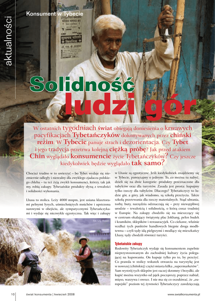 aktualności Konsument w Tybecie Solidność ludzi gór W ostatnich tygodniach świat obiegają doniesienia o krwawych pacyfikacjach Tybetańczyków dokonywanych przez chiński reżim. W Tybecie panuje strach i dezorientacja. Czy Tybet i jego tradycja przetrwa kolejną ciężką próbę? Jak przed atakiem Chin wyglądało konsumencie życie Tybetańczyków? Czy jeszcze kiedykolwiek będzie wyglądało tak samo ? Chociaż trudno w to uwierzyć – bo Tybet wydaje się niezmiernie odległy i nierealny dla zwykłego zjadacza polskiego chleba – tu też żyją zwykli konsumenci, którzy, tak jak my, robią zakupy. Tybetańskie produkty słyną z trwałości i solidności wykonania. Lhasa to stolica. Leży 4000 mnpm, jest usiana klasztorami pełnymi łysych, uśmiechniętych mnichów i upstrzona surowymi w obejściu, ale sympatycznymi Tybetańczykami i wydaje się niezwykle egzotyczna. Tak więc i zakupy fot. Lily Rosen w Lhasie są egzotyczne. Jeśli kiedykolwiek znajdziemy się w Tybecie, pamiętajmy o jednym: To, co można tu nabyć, dzieli się na dwie kategorie: produkty przeznaczone dla tubylców oraz dla turystów. Zasada jest prosta: kupujmy tylko rzeczy dla tubylców. Dlaczego? Tybetańczycy to ludzie gór, a góry, jak wiadomo, są szkołą przeżycia. Także szkołą przetrwania dla rzeczy materialnych. Stąd ubrania, torby, buty, narzędzia odznaczają się – przy niewątpliwej urodzie – trwałością i solidnością, o którą coraz trudniej w Europie. Na zakupy chodziło się na mieszczący się w centrum okalający świątynię plac Jokhang, pełen budek i kramików, sklepików i restauracyjek. Co ciekawe, właśnie wzdłuż tych punktów handlowych biegnie droga modlitewna – czyli tędy idą pielgrzymi i modlący się mieszkańcy Lhasy, tędy chodzili również turyści. Tybetańskie zakupy Rodowity Tybetańczyk wydaje się konsumentem zupełnie nieprzystosowanym do zachodniej kultury życia polegającej na kupowaniu. On kupuje tylko po to, by przeżyć. Co prawda w stolicy wskutek otwarcia na turystykę jest w nowszej (chińskiej) części miasta kilka „supermarketów”. Sam wystrój tych sklepów jest raczej skromny i brzydki, ale kupić można wszystko od jajek począwszy, poprzez nabiał, mięso, warzywa i owoce. I nie ma się co oszukiwać, że „europejski” poziom tej żywności Tybetańczycy zawdzięczają 10 świat konsumenta | kwiecień 2008 www.swiatkonsumenta.pl aktualności chińskiemu patronatowi. Niemniej jednak właśnie Chińczycy (ewentualnie turyści) są klientami takich przybytków. Dużych sklepów podobnych naszym (naszym kilkanaście lat temu) z ubraniami i sprzętem gospodarstwa domowego nie ma, ale kupić te rzeczy można w małych, paskudnych budkach chińskich. Handlowy szlak uzupełniają jeszcze bazary i restauracyjki oraz budki z jedzeniem takim jak pierożki, ryż z mięsem czy różnego rodzaju zupy. O dużych restauracjach, fast foodach, magazynach mody, piętrowych sklepach, firmowych przybytkach rozkoszy handlowej można zapomnieć. Tybetańczycy to lud bardzo wierzący, taki, który na modlitwie spędza sporą część dnia i sporo dni w tygodniu. A zatem priorytetem tych ludzi nie jest konsumpcja. Stąd typowy Tybetańczyk nie ma pojęcia o markach, firmach, modzie. i sporo dni w tygodniu. A zatem priorytetem tych ludzi nie jest konsumpcja. Stąd typowy Tybetańczyk nie ma pojęcia o markach, firmach, modzie. Kobiety mają swój narodowy, ludowy strój i ani kroju ani kolorów nie zmieniają przez całe życie. Mężczyźni podobnie. Ma on być praktyczny, mocny, ciepły, bo klimat i warunki życia są ciężkie. Wyrabiają je sami i sprzedają między sobą lub na małych kramikach na wiejskich lub miejskich bazarach. Jedzenie również nie jest wymyślne, ale za to pożywne i zawsze gotowane w domach. Stąd w sklepach spożywczych największy popyt jest na herbatę i cukier, masło i mąkę, mleko oraz mięso. No i oczywiście ryż. Ale garnki, w których gotują to po prostu garnki; mydło, którym się myją to mydło; a pasta do www.swiatkonsumenta.pl Kobiety mają swój narodowy, ludowy strój i ani kroju ani kolorów nie zmieniają przez całe życie. zębów i szczoteczka też nie są opatrzone żadnym znanym znakiem firmowym. Wszystko, co kupowane, jest albo produkcji chińskiej, albo Tybetańczyk wyrabia to sam. Prawa konsumenckie w Tybecie? Są one bardzo proste: jeżeli Tybetańczyk sprzedaje jakiś produkt, to wiadomo, że będzie on na 100% najwyższej jakości i solidności. Tybetańczycy nie wiedzą, co to produkcja masowa, nie robią byle więcej, nie kombinują, jak tu zrobić coś taniej, czyli – jak oszukać. Produkują wiedząc, że sąsiad, który to kupi, fot. Chris Webster Tyle Lhasa. W innych miejscowościach są dobrze zaopatrzone sklepy spożywcze i takie, gdzie można dostać „szwarc, mydło i powidło”. Ale tylko podstawowe produkty. Wsie nie mają nawet tego. Handlarz europejski tu nie powojuje. Po pierwsze mieszkańcy Tybetu są pilnie strzeżeni przez Chiny. Nawet przed wydarzeniami ostatnich tygodni trudno tu było wjechać obcokrajowcowi, a wyjazd dla tubylca graniczył z cudem. Tym bardziej teraz – Tybet jest odcięty od świata. Nie ma tu zachodnich pism, nie ma telewizji, w których reklamodawcy walczyliby o czas antenowy. Po drugie poziom zamożności mieszkańców jest raczej niski. To też skutek polityki państwowej, która nie pozwala im wykonywać innych prac, jak te mało znaczące, a co za tym idzie mało płatne. Po trzecie wreszcie, Tybetańczycy to lud bardzo wierzący, taki, który na modlitwie spędza sporą część dnia fot. Lily Rosen Lud uciemiężony Lhasa jest usłana klasztorami pełnymi łysych, uśmiechniętych mnichów świat konsumenta | kwiecień 2008 11 aktualności będzie później spędzał całe dni wysoko w górach, przemierzał kilometry, zmagał się z klimatem i pogodą. Dlatego ubrania, buty i torby ze skóry i wełny jaka są nie do zdarcia. Meble 