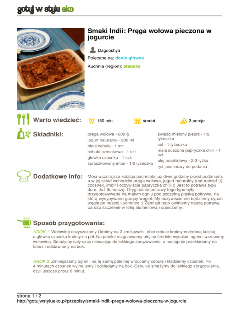 Smaki Indii: Pręga wołowa pieczona w jogurcie Dagooshya Polecane na: danie główne Kuchnia (region): arabska Warto wiedzieć: 150 min. średni 3 porcje Składniki: pręga wołowa - 600 g jogurt naturalny - 200 ml biała cebula - 1 szt. cebula czosnkowa - 1 szt. główka czosnku - 1 szt. sproszkowany imbir - 1/2 łyżeczka Dodatkowe info: Moja wczorajsza kolacja pachniała już dwie godziny przed podaniem, a w jej skład wchodziła pręga wołowa, jogurt naturalny (naturalnie! ;)), czosnek, imbir i oczywiście papryczka chilli ;) Jest to potrawa typu dum. Już tłumaczę: Oryginalnie potrawy tego typu były przygotowywane na małym ogniu pod szczelną płaską pokrywą, na którą wysypywano gorący węgiel. My oczywiście nie będziemy sypać węgla po naszej kuchence :) Zamiast tego owiniemy naszą potrawę bardzo szczelnie w folię aluminiową i upieczemy. świeżo mielony pieprz - 1/2 łyżeczka sól - 1 łyżeczka mała suszona papryczka chilli - 1 szt. olej arachidowy - 2-3 łyżka ryż jaśminowy do podania - Sposób przygotowania: KROK 1: Wołowinę oczyszczamy i kroimy na 2 cm kawałki, obie cebule kroimy w drobną kostkę, a główkę czosnku kroimy na pół. Na patelni rozgrzewamy olej na średnio-wysokim ogniu i wrzucamy wołowinę. Smażymy cały czas mieszając do lekkiego zbrązowienia, a następnie przekładamy na talerz i odstawiamy na bok. KROK 2: Zmniejszamy ogień i na tę samą patelnię wrzucamy cebulę i kładziemy czosnek. Po 4 minutach czosnek wyjmujemy i odkładamy na bok. Cebulkę smażymy do lekkiego zbrązowienia, czyli jeszcze przez 6 minut. strona 1 / 2 http://gotujwstylueko.pl/przepisy/smaki-indii:-prega-wolowa-pieczona-w-jogurcie KROK 3: Do cebuli dodajemy wołowinę wraz z sokami, które się wytworzyły, doprawiamy pieprzem, imbirem i solą, kruszymy papryczkę chilli. Przesmażamy przez około minutę. Po tym czasie dodajemy jogurt naturalny, dokładnie mieszamy i doprowadzamy do wrzenia. Zdejmujemy z ognia. KROK 4: Piekarnik rozgrzewamy do 180 stopni. Mięso wraz z cebulą i jogurtową zalewą przekładamy do żaroodpornego naczynia, a na wierzch układamy czosnek. Całość owijamy szczelnie folią aluminiową (ja zawinęłam na dwa razy) i wkładamy do piekarnika na 100 minut. Następnie piekarnik wyłączamy, a mięso zostawiamy w nim jeszcze na 30 minut. Podajemy z ryżem jaśminowym. Smacznego! :) strona 2 / 2 http://gotujwstylueko.pl/przepisy/smaki-indii:-prega-wolowa-pieczona-w-jogurcie Powered by TCPDF (www.tcpdf.org)