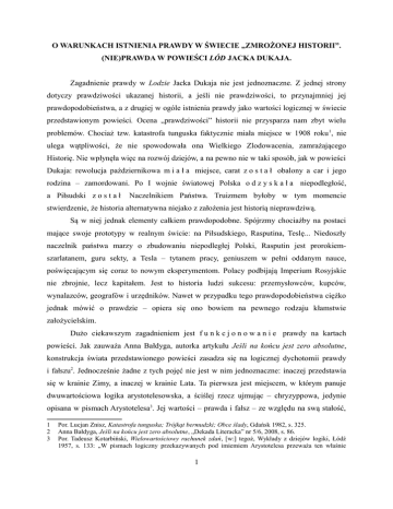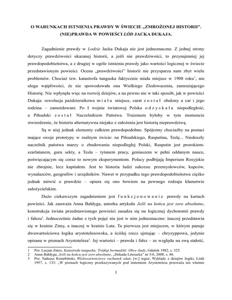 O WARUNKACH ISTNIENIA PRAWDY W ŚWIECIE „ZMROŻONEJ HISTORII”. (NIE)PRAWDA W POWIEŚCI LÓD JACKA DUKAJA. Zagadnienie prawdy w Lodzie Jacka Dukaja nie jest jednoznaczne. Z jednej strony dotyczy prawdziwości ukazanej historii, a jeśli nie prawdziwości, to przynajmniej jej prawdopodobieństwa, a z drugiej w ogóle istnienia prawdy jako wartości logicznej w świecie przedstawionym powieści. Ocena „prawdziwości” historii nie przysparza nam zbyt wielu problemów. Chociaż tzw. katastrofa tunguska faktycznie miała miejsce w 1908 roku 1, nie ulega wątpliwości, że nie spowodowała ona Wielkiego Zlodowacenia, zamrażającego Historię. Nie wpłynęła więc na rozwój dziejów, a na pewno nie w taki sposób, jak w powieści Dukaja: rewolucja październikowa m i a ł a miejsce, carat z o s t a ł obalony a car i jego rodzina – zamordowani. Po I wojnie światowej Polska o d z y s k a ł a niepodległość, a Piłsudski z o s t a ł Naczelnikiem Państwa. Truizmem byłoby w tym momencie stwierdzenie, że historia alternatywna niejako z założenia jest historią nieprawdziwą. Są w niej jednak elementy całkiem prawdopodobne. Spójrzmy chociażby na postaci mające swoje prototypy w realnym świcie: na Piłsudskiego, Rasputina, Teslę... Niedoszły naczelnik państwa marzy o zbudowaniu niepodległej Polski, Rasputin jest prorokiemszarlatanem, guru sekty, a Tesla – tytanem pracy, geniuszem w pełni oddanym nauce, poświęcającym się coraz to nowym eksperymentom. Polacy podbijają Imperium Rosyjskie nie zbrojnie, lecz kapitałem. Jest to historia ludzi sukcesu: przemysłowców, kupców, wynalazców, geografów i urzędników. Nawet w przypadku tego prawdopodobieństwa ciężko jednak mówić o prawdzie – opiera się ono bowiem na pewnego rodzaju kłamstwie założycielskim. Dużo ciekawszym zagadnieniem jest f u n k c j o n o w a n i e prawdy na kartach powieści. Jak zauważa Anna Bałdyga, autorka artykułu Jeśli na końcu jest zero absolutne, konstrukcja świata przedstawionego powieści zasadza się na logicznej dychotomii prawdy i fałszu2. Jednocześnie żadne z tych pojęć nie jest w nim jednoznaczne: inaczej przedstawia się w krainie Zimy, a inaczej w krainie Lata. Ta pierwsza jest miejscem, w którym panuje dwuwartościowa logika arystotelesowska, a ściślej rzecz ujmując – chryzyppowa, jedynie opisana w pismach Arystotelesa3. Jej wartości – prawda i fałsz – ze względu na swą stałość, 1 2 3 Por. Lucjan Znisz, Katastrofa tunguska; Trójkąt bermudzki; Obce ślady, Gdańsk 1982, s. 325. Anna Bałdyga, Jeśli na końcu jest zero absolutne, „Dekada Literacka” nr 5/6, 2008, s. 86. Por. Tadeusz Kotarbiński, Wielowartościowy rachunek zdań, [w:] tegoż, Wykłady z dziejów logiki, Łódź 1957, s. 133: „W pismach logiczny przekazywanych pod imiemiem Arystotelesa przeważa ten właśnie 1 czy też b e z w y j ą t k o w o ś ć , stanowią strukturę rzeczywistości. Jak zauważa Gierosławski, bohater powieści: Pomiędzy prawdą i fałszem nie pozostało im miejsce nawet na rzut monetą4. W Kraju Lodu nie ma i nie może być żadnych wartości pośrednich. Niezmienność wartości logicznych warunkuje w nim niezmienność świata w ogóle. Na skutek katastrofy tunguskiej i rozprzestrzeniania się Lodu wszystkie prawa materii na obszarze zlodowacenia stały się bliższe prawom idei, w tym prawa rządzące człowiekiem 5. Tym samym wartości logiczne prawdy i fałszu wykraczają poza obszary logiki, obejmując swoją dwuwartościowością historię, religię, etykę, a także ludzkie typy i charaktery. W przypadku historii sprowadza się to do prostego stwierdzenia: „Historia zamarzła”. Skoro bowiem zamarzła, utrwaliła się w określonym kształcie – jest niezmienna, a wszelkie przekłamania są w niej niemożliwe. Nie podlega też weryfikacji ze względu na odmienne jej wersje zachowane we wspomnieniach. Człowiek (…) wdrożony w logikę lutych , tak-tak, nienie, pod arystotelesowskim nożem prawdy (...) powinien bowiem pamiętać przeszłość jasno i wyraźnie, bez żadnych wątpliwości.6 Historia nie zależy zatem od perspektywy podmiotu mówiącego – jest jedna prawda, a wszystko inne jest kłamstwem. Podobnie rzecz ma się w przypadku etyki: dobro jest dobrem, a zło – złem (czyli zaprzeczeniem dobra), pomiędzy nimi nie ma natomiast żadnych wartości, a to, co raz zostanie uznane za dobre, nie może później być uznane za złe. Dwuwartościowość logiki dotyczy także innych, bardziej „przyziemnych” aspektów – na przykład pogody: Przeważnie pochmurno, od czasu do czasu opady, mierne wiatry, stan niezmieniony, pewny.7; a także ludzkich charakterów: Przyjeżdżający z Irkucka łajdak nie może już wyszlachetnieć, człowiek zaś prawy nie dopuści się zbrodni w żadnych okolicznościach8. Postaci żyjące w świecie Zimy istnieją w sposób bezwzględny: funkcjonują jako „zamrożone” figury o stałych charakterach, przekonaniach i niezmiennym „zestawie” zachowań. Dodatkowa zależność porządkująca świat Zimy sprowadza się do twierdzenia: 4 5 6 7 8 pogląd klasyczny, ale są tam miejsca świadczące przynajmniej o wahaniach w przypadku, gdy się ma do czynienia z prognozami w zastosowaniu do wyników działań przyszłych. (…) Sprawa stanęła na ostrzu noża w kontrowersji między zwolennikami Chryzyppa (szkoła stoicka) a zwolennikami Epikura. Chryzypp był heroldem logiki bezwyjątkowo dwuwartościowej, co się łączyło ze stanowczym determinizmem. Epikur, przeciwnik powszechnego determinizmu, sądził (…) że bywa tak, iż wprawdzie będzie tak a tak lub nie będzie, jednak żaden z członów dwuczłonowej alternatywy nie jest ani prawdziwy ani fałszywy.” Jacek Dukaj, Lód, Kraków 1007, s. 450. Ibidem, s. 969. Ibidem, s. 166. Ibidem, s. 498. Maciej Pabisek, Posąg i jego syn, FA-art, nr 1, 2008, s. 69. 2 Im zimniej, tym niższa entropja9. Entropię, za Fryderykiem Reifem, autorem 