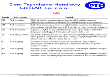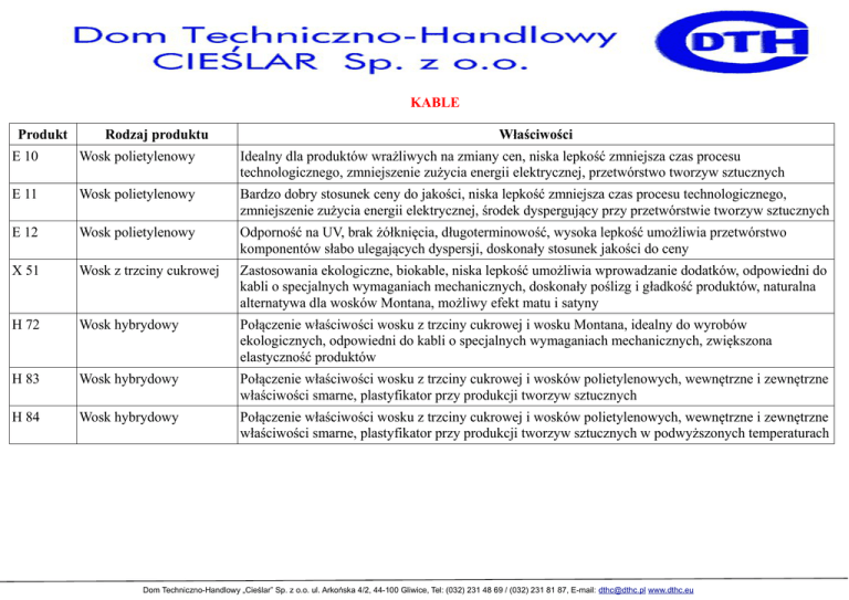 KABLE Produkt Rodzaj produktu Właściwości E 10 Wosk polietylenowy Idealny dla produktów wrażliwych na zmiany cen, niska lepkość zmniejsza czas procesu technologicznego, zmniejszenie zużycia energii elektrycznej, przetwórstwo tworzyw sztucznych E 11 Wosk polietylenowy Bardzo dobry stosunek ceny do jakości, niska lepkość zmniejsza czas procesu technologicznego, zmniejszenie zużycia energii elektrycznej, środek dyspergujący przy przetwórstwie tworzyw sztucznych E 12 Wosk polietylenowy Odporność na UV, brak żółknięcia, długoterminowość, wysoka lepkość umożliwia przetwórstwo komponentów słabo ulegających dyspersji, doskonały stosunek jakości do ceny X 51 Wosk z trzciny cukrowej Zastosowania ekologiczne, biokable, niska lepkość umożliwia wprowadzanie dodatków, odpowiedni do kabli o specjalnych wymaganiach mechanicznych, doskonały poślizg i gładkość produktów, naturalna alternatywa dla wosków Montana, możliwy efekt matu i satyny H 72 Wosk hybrydowy Połączenie właściwości wosku z trzciny cukrowej i wosku Montana, idealny do wyrobów ekologicznych, odpowiedni do kabli o specjalnych wymaganiach mechanicznych, zwiększona elastyczność produktów H 83 Wosk hybrydowy Połączenie właściwości wosku z trzciny cukrowej i wosków polietylenowych, wewnętrzne i zewnętrzne właściwości smarne, plastyfikator przy produkcji tworzyw sztucznych H 84 Wosk hybrydowy Połączenie właściwości wosku z trzciny cukrowej i wosków polietylenowych, wewnętrzne i zewnętrzne właściwości smarne, plastyfikator przy produkcji tworzyw sztucznych w podwyższonych temperaturach Dom Techniczno-Handlowy „Cieślar” Sp. z o.o. ul. Arkońska 4/2, 44-100 Gliwice, Tel: (032) 231 48 69 / (032) 231 81 87, E-mail: [email protected] www.dthc.eu