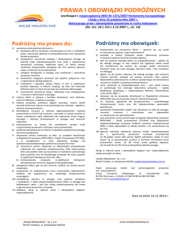 PRAWA I OBOWIĄZKI PODRÓŻNYCH wynikające z rozporządzenia (WE) Nr 1371/2007 Parlamentu Europejskiego i Rady z dnia 23 października 2007 r. dotyczącego praw i obowiązków pasażerów w ruchu kolejowym (Dz. Urz. UE L 315 z 3.12.2007 r., str. 14) Podróżny ma prawo do: 1) uzyskania przed podróżą informacji o: a) dostępnej ofercie taryfowej i przewozowej (w tym o rozkładach jazdy, najniższych opłatach za przejazd/przewóz oraz najszybszej drodze przejazdu), b) dostępności, warunkach dostępu i dostosowaniu pociągu do potrzeb osób niepełnosprawnych oraz osób o ograniczonej sprawności ruchowej; najbliższej stacji, na której istnieje możliwość bezpośrednio dostępnej dla nich pomocy (dotyczy stacji, na których nie ma personelu), c) usługach dostępnych w pociągu oraz możliwości i warunkach przewozu rowerów, d) działaniach mogących przerwać lub opóźnić połączenie oraz o zaprzestaniu obsługi połączeń, e) możliwości i sposobie zakupu biletu, w tym o najbliższym punkcie odprawy, w którym znajdują się kasy lub automaty biletowe (jeśli na stacji nie ma kasy ani automatu biletowego), f) procedurach wnoszenia skarg i reklamacji oraz postępowania z rzeczami znalezionymi w pociągu; 2) nabycia biletu w jednym z kanałów dystrybucji: kasa biletowa, automat biletowy, u obsługi w pociągu; 3) odbycia przejazdu, przewozu bagażu ręcznego, roweru (jeżeli warunki techniczne taboru na to pozwalają) oraz zwierząt – zgodnie z zawartą umową przewozu; 4) dochodzenia roszczeń w zakresie odpowiedzialności cywilnej przewoźnika za śmierć lub zranienie, a ponadto za szkody wynikłe na skutek uszkodzenia bądź całkowitej lub częściowej utraty bagażu ręcznego i zwierząt przewożonych w pociągu pod własnym nadzorem; 5) odszkodowania za utratę lub uszkodzenie sprzętu osób o ograniczonej sprawności ruchowej z winy przewoźnika; 6) uzyskania poświadczenia na bilecie o odwołaniu (opóźnieniu) pociągu lub utracie połączenia; 7) otrzymania zwrotu należności za bilet, na zasadach określonych w Regulaminie przewozu (RPO-KMŁ) i Taryfie Przewozowej (TP-KMŁ), a w szczególności: w razie odwołania pociągu lub opóźnienia/przewidywanego opóźnienia powyżej 60 minut: a) otrzymania zwrotu należności za odpowiednio poświadczony całkowicie lub częściowo niewykorzystany i/lub wykorzystany bilet jeśli podróż stała się bezcelowa w kontekście pierwotnego planu podróży oraz do bezpłatnego przejazdu do stacji wyjazdu w najbliższym dostępnym terminie, albo b) kontynuowania przejazdu w najbliższym dostępnym lub późniejszym terminie, dogodnym dla podróżnego; 8) odstąpienia biletu, gdy nie jest imienny i podróż nie została jeszcze rozpoczęta; 9) oczekiwania na podejmowanie przez przewoźnika odpowiednich środków dla zapewnienia mu osobistego bezpieczeństwa w pociągach; 10) nieodpłatnej pomocy w pociągu oraz podczas wsiadania i wysiadania, a także zakupu/zalegalizowania biletu w pociągu bez dodatkowych opłat – jeśli jest osobą niepełnosprawną lub osobą o ograniczonej sprawności ruchowej; 11) składania skarg w zakresie praw i obowiązków objętych rozporządzeniem. Podróżny ma obowiązek: 1) bezpośrednio po otrzymaniu biletu – upewnić się, czy został on wystawiony zgodnie z jego wskazówkami; 2) posiadać w trakcie przejazdu ważne dokumenty przewozu i wręczać je podczas kontroli na każde żądanie; 3) jeśli nie posiada ważnego biletu na przejazd/przewóz – zgłosić się do obsługi pociągu w celu nabycia lub legalizacji biletu przed lub niezwłocznie po wejściu do pociągu (wejść pierwszymi drzwiami licząc od czoła pociągu/ kierunku jazdy i tam oczekiwać na obsługę); 4) zgłosić się do punktu odprawy lub obsługi pociągu, jeśli zamierza zmienić warunki, odstąpić od umowy przewozu albo uzyskać odpowiednie poświadczenie na bilecie uprawniające do dochodzenia roszczeń w związku z zawartą umową przewozu; 5) uiścić należność za przejazd/przewóz oraz – jeśli został uznany za podróżnego bez ważnego dokumentu przewozu – opłatę dodatkową wynikającą z rozporządzenia Ministra Infrastruktury z dnia 20.01.2005 r.; 6) stosować się do przepisów określonych w Regulaminie przewozu (RPO-KMŁ) oraz do przepisów celnych i administracyjnych; 7) nie stwarzać zagrożenia dla bezpieczeństwa i prawidłowego funkcjonowania ruchu oraz dla bezpieczeństwa pozostałych podróżnych; 8) sprawować bezpośredni nadzór nad zabranymi ze sobą do pociągu: rzeczami, rowerem i zwierzętami oraz odpowiadać za szkody przez nie spowodowane; 9) przy przewozie rzeczy przestrzegać przepisów Regulaminu przewozu (RPO-KMŁ) i Taryfy przewozowej (TP-KMŁ) oraz Regulaminu międzynarodowego przewozu kolejami towarów niebezpiecznych (RID), a także odpowiadać za szkody wynikłe z nie zastosowania się do nich; 10) zgłaszać potrzebę udzielenia pomocy osobie niepełnosprawnej lub o ograniczonej sprawności ruchowej przynajmniej na 48 godzin zanim taka pomoc będzie potrzebna; osoba ta musi stawić się w wyznaczonym punkcie w terminie określonym przez przewoźnika (maks. do 60 minut przed godziną odjazdu), ale nie później niż 30 minut przed godziną odjazdu pociągu. Skargi w zakresie praw i obowiązków objętych ww. rozporządzeniem należy przesyłać na adres: „Koleje Małopolskie” sp. z o.o. 30-017 Kraków, ul. Racławicka 56/416, [email protected] Organ sprawujący nadzór nad przestrzeganiem przepisów ww. rozporządzenia: Urząd Transportu Kolejowego, al. Jerozolimskie 134, 02-305 Warszawa, nr infolinii 22 460 40 80 lub 801 044 080, adres e-mail: [email protected] Stan na dzień 14.12.2014 r. „Koleje Małopolskie” sp. z o.o. 30-017 Kraków, ul. Racławicka 56/416 www.malopolskiekoleje.pl