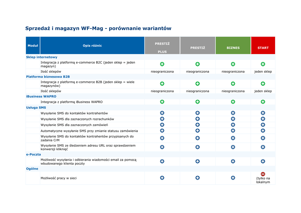 Sprzedaż i magazyn WF-Mag - porównanie wariantów Moduł Opis różnic PRESTIŻ PRESTIŻ BIZNES START nieograniczona nieograniczona nieograniczona jeden sklep nieograniczona nieograniczona nieograniczona jeden sklep PLUS Sklep internetowy Integracja z platformą e-commerce B2C (jeden sklep = jeden magazyn) Ilość sklepów Platforma biznesowa B2B Integracja z platformą e-commerce B2B (jeden sklep = wiele magazynów) Ilość sklepów iBusiness WAPRO Integracja z platformą iBusiness WAPRO Usługa SMS Wysyłanie SMS do kontaktów kontrahentów Wysyłanie SMS dla zaznaczonych rozrachunków Wysyłanie SMS dla zaznaczonych zamówień Automatyczne wysyłanie SMS przy zmianie statusu zamówienia Wysyłanie SMS do kontaktów kontrahentów przypisanych do zadania CrM Wysyłanie SMS ze śledzeniem adresu URL oraz sprawdzeniem konwersji kliknięć e-Poczta Możliwość wysyłania i odbierania wiadomości email za pomocą wbudowanego klienta poczty Ogólne Możliwość pracy w sieci (tylko na lokalnym serwerze jedna baza danych) Elektroniczna wymiana danych w programie Biuro Rachunkowe Online Konfiguracja czcionek na listach dokumentów dla użytkownika Optymalizacja pracy terminalowej poprzez wyłączanie grafik w programie Możliwość automatycznego zapisywania załączników w wersji elektronicznej w module e-Dokumenty Możliwość zapisywania filtrów użytkownika Automatyczne pobieranie kursów walut z NBP Automatyczne pobieranie kursów walut z ECB Listy szczegółów na oknach dokumentów i kartotekach Możliwość blokowania kolumn na listach pozycji podczas przewijania Zapisywanie logo do wydruków w bazie programu Magazyny Liczba magazynów i oddziałów Możliwość prowadzenia wielu oddziałów w programie Możliwość przypisania domyślnego rachunku bankowego do magazynu Możliwość przypisania domyślnego rachunku bankowego do waluty Sprawdzenie stanów magazynowych w innych magazynach indywidualnie dla asortymentu Możliwość przeglądania całej kartoteki asortymentowej bez zmiany magazynu Przesunięcie międzymagazynowe Dokumenty przesunięć międzymagazynowych odłożone w czasie Możliwość wzajemnego kasowania i modyfikacji dokumentów MM w magazynach Możliwość definiowania nagłówków tekstowych do wydruku na dokumentach nieograniczona nieograniczona nieograniczona 1 Dokumenty handlowe Wsparcie dla różnego rodzaju dokumentów handlowych (faktury, paragony rachunki itp.) Moduł szybkiej sprzedaży detalicznej Generator dokumentów seryjnych (faktury abonamentowe) Możliwość definiowania ewidencji Netto/Brutto dla dokumentów Możliwość blokowania dokumentów przed edycją Pobieranie towaru na dokument bezpośrednio z innego magazynu na dokument handlowy Możliwość łączenia w jednym dokumencie handlowym, dokumentów magazynowych z różnych magazynów Faktury uproszczone Faktury RR Faktury zaliczkowe Faktura zaliczkowa krajowa w walucie Faktura zaliczkowa nie krajowa w walucie Możliwość modyfikacji specyfikacji faktury końcowej do faktury zaliczkowej. Faktury krajowe w walucie Naliczanie kosztów dodatkowych dla faktur krajowych zakupu w walucie Faktury marża Paragon marża Faktura nieobrotowa Faktura ProForma Faktury MP – Metoda kasowa Faktura - MP Obsługa wielu momentów podatkowych VAT Eksport/import faktur w formacie XML zgodnie ze specyfikacją ECOD Automatyczne/ręczne generowanie deklaracji Intrastat Eksport deklaracji Intrastat do pliku XML Dokumenty Moduł obsługi akcyzy od wyrobów węglowych Dokumenty dostawy na wyroby węglowe Automatyczne przygotowanie i drukowanie deklaracji AKC-WW Zestawienie dokumentów dostaw wyrobów węglowych Automatyczne tworzenie dokumentów dostaw wyrobów węglowych na podstawie dokumentów magazynowych / handlowych Zestawienie zużytych wyrobów węglowych Zestawienie dokumentów dostawy prezentujące wysokość akcyzy Zestawienie dokumentów dostawy prezentujące wysokość marży Tworzenie własnych typów dokumentów magazynowych Dokumenty SAD i praca w innych walutach Dokumenty SAD z opcją Przychód odłożony w czasie Dokumenty PZ odłożone w czasie Eksport/ import dokumentów między oddziałami Definiowalne klasyfikacje dokumentów Transakcje wewnątrzwspólnotowe (UE) Możliwość automatycznego rozchodowania dostępnej ilości dla zaznaczonych towarów Alokowanie dostawy w momencie zatwierdzania pozycji, co pozwala zwiększyć bezpieczeństwo przy jednoczesnej pracy wielu użytkowników w jednym systemie Tworzenie remanentu oraz bilansu otwarcia (w zakresie kartotek (w zakresie kartotek (w zakresie kartotek asortymentów i asortymentów i asortymentów i kontrahentów, kontrahentów, kontrahentów, przesunięć przesunięć przesunięć międzymagazynowych międzymagazynowych międzymagazynowych i zamówień) i zamówień) i zamówień) Remanent cząstkowy (możliwość sprzedawania towarów nie uwzględnionych w remanencie podczas prowadzenia remanentu w magazynie) Konfiguracja numeracji wszelkiego rodzaju dokumentów (handlowe, magazynowe itp.) z możliwością rozbicia numeracji dla poszczególnych magazynów oraz możliwością zmiany w dowolnym momencie w roku Możliwość wyboru numeracji ręcznej lub automatycznej Powielanie wystawionych dokumentów Prezentowanie szczegółów dokumentów na listach szczegółów Klasyfikacja dokumentów za pomocą kolorowych etykiet na listach z opcją filtrowania Asortyment Tworzenie kartotek z wykorzystaniem kategorii towarowych oraz kategorii wielopoziomowych Powielanie asortymentu Obsługa numerów serii i dat ważności Obsługa kodów egzemplarzowych Import artykułów z pliku CSV Eksport / import kartoteki asortymentu w wewnętrznym formacie TXT Możliwość wykorzystania wbudowanych operacji dodatkowych dla towarów (np. grupowa zmiana cena dla zaznaczonych pozycji) Zaawansowane grupowe operacje zmiany cen oraz danych handlowych dla zaznaczonych towarów Nieograniczona ilość rubryk cenowych dla towarów Eksport / import cen sprzedaży z pliku Exc