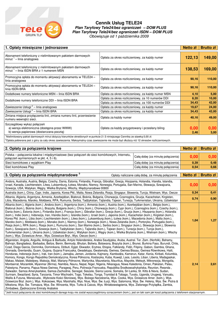 Cennik Usług TELE24 Plan Taryfowy Tele24/bez ograniczeń – DOM PLUS Plan Taryfowy Tele24/bez ograniczeń ISDN – DOM PLUS Obowiązuje od 1 października 2009 1. Opłaty miesięczne i jednorazowe Netto zł Brutto zł Abonament telefoniczny z nielimitowanym pakietem darmowych minut 1 – linia analogowa Opłata za okres rozliczeniowy, za każdy numer 122,13 149,00 Abonament telefoniczny z nielimitowanym pakietem darmowych minut 1 – linia ISDN BRA z 1 numerem MSN Opłata za okres rozliczeniowy, za każdy numer 138,53 169,00 Promocyjna opłata do momentu aktywacji abonamentu w TELE24 – linia analogowa Opłata za okres rozliczeniowy, za każdy numer 90,16 110,00 Promocyjna opłata do momentu aktywacji abonamentu w TELE24 – linia ISDN BRA Opłata za okres rozliczeniowy, za każdy numer 90,16 110,00 Opłata za okres rozliczeniowy, za każdy numer MSN Opłata za okres rozliczeniowy, za 10 numerów DDI Opłata za okres rozliczeniowy, za 100 numerów DDI Opłata za okres rozliczeniowy, za każdy numer Opłata za okres rozliczeniowy, za każdy numer 4,10 8,20 34,43 19,67 34,43 5,00 10,00 42,00 24,00 42,00 Opłata za każdy numer 40,16 49,00 Opłata za każdy przygotowany i przesłany biling 0,00 0,00 2,46 3,00 Dodatkowe numery telefoniczne MSN – linia ISDN BRA Dodatkowe numery telefoniczne DDI – linia ISDN BRA Zawieszenie Usługi 2 – linia analogowa Zawieszenie Usługi 2 – linia ISDN BRA Zmiana miejsca przyłączenia linii, zmiana numeru linii, przeniesienie numeru wewnątrz sieci. Szczegółowy wykaz połączeń a) wersja elektroniczna (dostępna przez WWW) b) wersja papierowa (dostarczana pocztą) 1 Nielimitowany pakiet darmowych minut dotyczy kierunków określonych w punkcie 2 i 3 niniejszego Cennika ze stawką 0,00 zł. 2 Opłata pobierana jest z góry za cały okres zawieszenia. Maksymalny czas zawieszenie nie może być dłuższy niż 12 okresów rozliczeniowych. 2. Opłaty za połączenia krajowe Netto zł Polska – połączenia lokalne i międzymiastowe (bez połączeń do sieci komórkowych, Internetu, połączeń wymienionych w pkt. 4, 5 i 6). Sieci komórkowe z wyjątkiem Play Sieć komórkowa Play 3. Opłaty za połączenia międzynarodowe 3 Całą dobę (za minutę połączenia) 0,00 0,00 Całą dobę (za minutę połączenia) Całą dobę (za minutę połączenia) 0,39 0,54 0,48 0,66 Opłaty naliczane całą dobę, za minutę połączenia Andora, Australia, Austria, Belgia, Czechy, Dania, Estonia, Finlandia, Francja, Gibraltar, Grecja, Hiszpania, Holandia, Irlandia, Islandia, Izrael, Kanada, Liechtenstein, Litwa, Luksemburg, Łotwa, Monako, Niemcy, Norwegia, Portugalia, San Marino, Słowacja, Szwajcaria, Szwecja, USA, Watykan, Węgry, Wielka Brytania, Włochy, Międzynarodowe 00800 Australia (kom.), Chiny, Cypr, Indie, Japonia, Korea Płd., Malta, Nowa Zelandia, Rosja, Singapur, Słowenia, Turcja, Wietnam, Wys. Owcze Albania, Algieria, Argentyna, Armenia, Azerbejdżan, Białoruś, Bośnia, Bułgaria, Chorwacja, Czarnogóra, Gruzja, Kazachstan, Kirgistan, Libia, Macedonia, Maroko, Mołdawia, RPA, Rumunia, Serbia, Tadżykistan, Tajlandia, Tajwan, Tunezja, Turkmenistan, Ukraina, Uzbekistan Albania (kom.), Algieria (kom.) ,Andora (kom.), Argentyna (kom.), Armenia (kom.), Austria (kom.), Azerbejdżan (kom.), Belgia (kom.), Białoruś (kom.), Bośnia (kom.), Brazylia, Bułgaria (kom.), Chiny (kom.), Chorwacja (kom.), Cypr (kom.), Czarnogóra (kom.), Czechy (kom.), Dania (kom.), Estonia (kom.), Finlandia (kom.), Francja (kom.), Gibraltar (kom.), Grecja (kom.), Gruzja (kom.), Hiszpania (kom.), Holandia (kom.), Indie (kom.), Indonezja, Iran, Irlandia (kom.), Islandia (kom.), Izrael (kom.), Japonia (kom.), Kazachstan (kom.), Kirgistan (kom.), Korea Płd. (kom.), Libia (kom.) Liechtenstein (kom.), Litwa (kom.), Luksemburg (kom.), Łotwa (kom.), Macedonia (kom.), Malta (kom.), Maroko (kom.), Mołdawia (kom.), Monako (kom.), Niemcy (kom.), Norwegia (kom.), Nowa Zelandia (kom.), Portoryko, Portugalia (kom.), Rosja (kom.), RPA (kom.), Rosja (kom.), Rumunia (kom.), San Marino (kom.), Serbia (kom.), Singapur (kom.), Słowacja (kom.), Słowenia (kom.), Szwajcaria (kom.), Szwecja (kom.), Tadżykistan (kom.), Tajlandia (kom.), Tajwan (kom.), Tunezja (kom.), Turcja (kom.), Turkmenistan (kom.), Ukraina (kom.), Uzbekistan (kom.), Watykan (kom.), Węgry (kom.), Wielka Brytania (kom.), Wietnam (kom.), Włochy (kom.), Wys. Dziewicze Amer., Wys. Dziewicze Bryt., Wys. Owcze (kom.) Afganistan, Angola, Anguilla, Antigua & Barbuda, Antyle Holenderskie, Arabia Saudyjska, Aruba, Austral. Ter. Zam. (Norfolk), Bahamy, Bahrajn, Bangladesz, Barbados, Belize, Benin, Bermudy, Bhutan, Boliwia, Botswana, Brazylia (kom.), Brunei, Burkina Faso, Burundi, Chile, Czad, Diego Garcia, Dominika, Dominikana, Dżibuti, Egipt, Ekwador, Erytrea, Etiopia, Falklandy, Fidżi, Filipiny, Gabon, Gambia, Ghana, Grenada, Grenlandia, Guam, Gujana, Gujana Francuska, Gwadelupa, Gwatemala, Gwinea, Gwinea Bissau, Gwinea Równikowa, Haiti, Honduras, Indonezja (kom.), Irak, Iran (kom.), Jamajka, Jemen, Jordania, Kajmany, Kambodża, Kamerun, Katar, Kenia, Kiribati, Kolumbia, Komory, Kongo, Kongo Republika Demokratyczna, Korea Północna, Kostaryka, Kuba, Kuwejt, Laos, Lesoto, Liban, Liberia, Madagaskar, Makao, Malawi, Maledywy, Malezja, Mali, Mariany Północne, Martynika, Mauretania, Mauritius, Mayotte, Meksyk, Mikronezja, Mongolia, Montserrat, Mozambik, Myanmar (Birma), Namibia, Nauru, Nepal, Niger, Nigeria, Nikaragua, Nowa Kaledonia, Oman, Pakistan, Palau, Palestyna, Panama, Papua Nowa Gwinea, Paragwaj, Peru, Polinezja Francuska, Republika Środkowoafrykańska, Reunion, Rwanda , Salwador, Samoa Amerykańskie, Samoa Zachodnie, Senegal, Seszele, Sierra Leone, Somalia, Sri Lanka, St. Kitts & Nevis, Sudan, Surinam, Swaziland, Syria, Tanzania, Timor Wschodni, Togo, Tokelau, Tonga, Trynidad & Tobago, Tuvalu, Uganda, Urugwaj, Vanuatu, Wallis & Futuna, Wenezuela , Wybrzeże Kości Słoniowej, Wys. Bożego Narodzenia, Wys. Cooka, Wys. Dzi