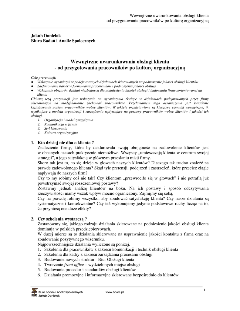 Wewnętrzne uwarunkowania obsługi klienta - od przygotowania pracowników po kulturę organizacyjną Jakub Danielak Biuro Badań i Analiz Społecznych Wewnętrzne uwarunkowania obsługi klienta - od przygotowania pracowników po kulturę organizacyjną Cele prezentacji: ● Wskazanie ograniczeń w podejmowanych działaniach skierowanych na podnoszenie jakości obsługi klientów ● Zdefiniowanie barier w formowaniu pracowników i podnoszeniu jakości obsługi ● Wskazanie obszarów działań niezbędnych dla podniesienia jakości obsługi i budowania firmy zorientowanej na klienta Główną tezą prezentacji jest wskazanie na ograniczenia tkwiące w działaniach podejmowanych przez firmy skierowanych na modyfikowanie zachowań pracowników. Przełamaniem tego ograniczenia jest świadome kształtowanie postaw pracowników wobec klientów. W tekście przedstawione są kluczowe czynniki wewnętrzne, tj. wynikające z modelu organizacji i zarządzania wpływające na postawy pracowników wobec klientów i jakości ich obsługi. 1. Organizacja i model zarządzania 2. Komunikacja w firmie 3. Styl kierowania 4. Kultura organizacyjna 1. Kto dzisiaj nie dba o klienta ? Znalezienie firmy, która by deklarowała swoją obojętność na zadowolenie klientów jest w obecnych czasach praktycznie niemożliwe. Wszyscy „umieszczają klienta w centrum swojej strategii”, a jego satysfakcję w głównym przesłaniu misji firmy. Skoro tak jest to, co się dzieje w głowach naszych klientów? Dlaczego tak trudno znaleźć na prawdę zadowolonego klienta? Skąd tyle pretensji, podejrzeń i zastrzeżeń, które przecież ciągle napływają do naszych firm? Czy to my robimy coś nie tak? Czy klientom „przewróciło się w głowach” i nie potrafią już powstrzymać swojej roszczeniowej postawy? Zostawmy jednak analizę klientów na boku. Na ich postawy i sposób odczytywania rzeczywistości mamy wszak wpływ mocno ograniczony. Zajmijmy się sobą. Czy na prawdę robimy wszystko, aby zbudować satysfakcję klienta? Czy nasze działania są systematyczne i konsekwentne? Czy też wykonujemy jedynie podstawowe ruchy licząc na to, że przyniosą one duże efekty? 2. Czy szkolenia wystarczą ? Zastanówmy się, jakiego rodzaju działania skierowane na podniesienie jakości obsługi klienta dominują w polskich przedsiębiorstwach. W dużej mierze są to działania skierowane na usprawnienie jakości kontaktu z firmą oraz na zbudowanie pozytywnego wizerunku. Najpowszechniejsze działania wyliczone są poniżej. 1. Szkolenia dla pracowników z zakresu komunikacji i technik obsługi klienta 2. Szkolenia dla kadry z zakresu zarządzania procesami obsługi 3. Budowanie nowych struktur - Biur Obsługi klienta 4. Tworzenie front office – wydzielonych miejsc obsługi 5. Budowanie procedur i standardów obsługi klientów 6. Działania promocyjne i informacyjne skierowane bezpośrednio do klientów Biuro Badań i Analiz Społecznych Jakub Danielak www.bbias.pl 1 Wewnętrzne uwarunkowania obsługi klienta - od przygotowania pracowników po kulturę organizacyjną Oczywiście, wszystkie te działania są ważne, pozytywne i niezbędne. Pytanie jednak, czy wystarczające. Wspólnym mianownikiem tych działań jest koncentrowanie się na bezpośrednim lub pośrednim kontakcie z klientem. Ich znaczenie polega na tym, że tworzone są pewne formy, czy ramy tego kontaktu. Wiele firm poprzestaje na tym poziomie działań. Z reguły jednak efektywność tych przedsięwzięć jest mocno ograniczona. My się staramy, a klienci i tak „wiedzą” swoje. W zadziwiający sposób szkolenia często nie zmieniają nastawienia i kompetencji naszych pracowników, a wprowadzane standardy rażą sztucznością lub są sprytnie omijane. BOK-i są nazywane przez klientów „pałacami” („to za nasze pieniądze”), a ulotek nikt nie czyta, „bo nie wiadomo, o co im chodzi”. Gdzie tkwi przyczyna tego stanu rzeczy? 3. Dlaczego nasi pracownicy nie będą dobrze obsługiwać klientów? Między zmianą zachowań, a zmianą postaw. Pytanie to może wydawać się całkowicie wydumane i niesprawiedliwe. A może nawet malkontenckie. Dlaczego nasi pracownicy mieliby źle obsługiwać klientów? Przecież: • Taka jest oficjalna strategia firmy • Tego od nich wymagamy i za to im płacimy • Dostarczamy im szkoleń, budujemy standardy i nowe struktury • To są dobrzy ludzie - dlaczego mieli by być źli dla klientów? • Poza tym naszym zdaniem nie jest źle – klienci są zadowoleni A może wcale nie jest tak pięknie jak nam się wydaje? Może jednak na prawdę nie będą dbać, bo dobrze wiedzą, że: ● Wcale tak naprawdę tego od nich nie wymagamy ● Wcale im tego nie ułatwiamy ● Nie za to ich rozliczamy ● Nie za to ich nagradzamy Pytanie, które w tym miejscu należy postawić, brzmi: „Czy nasze działania rzeczywiście wpływają na zmiany postaw pracowników, czy też tylko służą one modyfikacji zachowań?” Co zrobić, aby zmianie uległy postawy pracowników? Od czego jest to uzależnione. Zachowanie Organizacja Wymagania stanowiska pracy Szkolenia Coaching i mentoring Współudział – praca zespołowa Postawa Wiedza Biuro Badań i Analiz Społecznych Jakub Danielak Oceny i emocje Tendencje do zachowań www.bbias.pl Rys.1 2 Wewnętrzne uwarunkowania obsługi klienta - od przygotowania pracowników po kulturę organizacyjną Proste prawdy o kształtowaniu postaw: ● Pracownicy swoje postawy będą kształtować na podstawie tego, co widzą i rozumieją, a nie w oparciu o to, co słyszą ● Pracownicy zawsze ostatecznie będą przyjmować postawy zgodne z własnym interesem Aby wpłynąć na autentyczną zmianę postaw należy określić, co tak na prawdę widzą i rozumieją nasi pracownicy, kiedy myślą o obsłudze klienta i polityce naszej firmy oraz, jak w tym kontekście definiują swój interes? Zdefiniowanie czynników wewnętrznych firmy wpływających na kształtowanie postaw pracowników pozwol