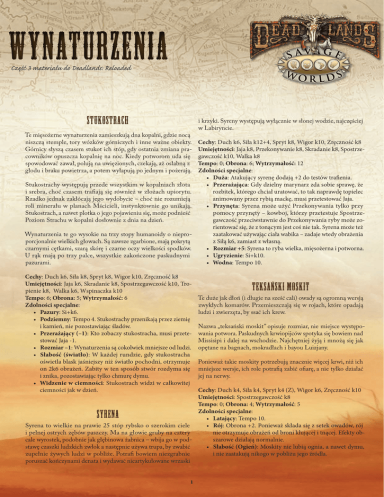 WYNATURZENIA Część 3 materiału do Deadlands: Reloaded STUKOSTRACH Te mięsożerne wynaturzenia zamieszkują dna kopalni, gdzie nocą niszczą stemple, tory wózków górniczych i inne ważne obiekty. Górnicy słyszą czasem stukot ich stóp, gdy ostatnia zmiana pracowników opuszcza kopalnię na noc. Kiedy potworom uda się spowodować zawał, polują na uwięzionych, czekają, aż osłabną z głodu i braku powietrza, a potem wyłapują po jednym i pożerają. Stukostrachy występują przede wszystkim w kopalniach złota i srebra, choć czasem trafiają się również w złożach upiorytu. Rzadko jednak zakłócają jego wydobycie – choć nie rozumieją roli minerału w planach Mścicieli, instynktownie go unikają. Stukostrach, a nawet plotka o jego pojawieniu się, może podnieść Poziom Strachu w kopalni dosłownie z dnia na dzień. Wynaturzenia te go wysokie na trzy stopy humanoidy o nieproporcjonalnie wielkich głowach. Są zawsze zgarbione, mają pokrytą czarnymi cętkami, szarą skórę i czarne oczy wielkości spodków. U rąk mają po trzy palce, wszystkie zakończone paskudnymi pazurami. Cechy: Duch k6, Siła k8, Spryt k8, Wigor k10, Zręczność k8 Umiejętności: Jaja k6, Skradanie k8, Spostrzegawczość k10, Tropienie k8, Walka k6, Wspinaczka k10 Tempo: 6; Obrona: 5; Wytrzymałość: 6 Zdolności specjalne: • Pazury: Si+k6. • Podziemny: Tempo 4. Stukostrachy przenikają przez ziemię i kamień, nie pozostawiając śladów. • Przerażający (–1): Kto zobaczy stukostracha, musi przetestować Jaja -1. • Rozmiar –1: Wynaturzenia są cokolwiek mniejsze od ludzi. • Słabość (światło): W każdej rundzie, gdy stukostracha oświetla blask jaśniejszy niż światło pochodni, otrzymuje on 2k6 obrażeń. Zabity w ten sposób stwór rozdyma się i znika, pozostawiając tylko chmurę dymu. • Widzenie w ciemności: Stukostrach widzi w całkowitej ciemności jak w dzień. i krzyki. Syreny występują wyłącznie w słonej wodzie, najczęściej w Labiryncie. Cechy: Duch k6, Siła k12+4, Spryt k8, Wigor k10, Zręczność k8 Umiejętności: Jaja k8, Przekonywanie k8, Skradanie k8, Spostrzegawczość k10, Walka k8 Tempo: 0; Obrona: 6; Wytrzymałość: 12 Zdolności specjalne: • Duża: Atakujący syrenę dodają +2 do testów trafienia. • Przerażająca: Gdy dzielny marynarz zda sobie sprawę, że rozbitek, którego chciał uratować, to tak naprawdę topielec animowany przez rybią mackę, musi przetestować Jaja. • Przynęta: Syrena może użyć Przekonywania tylko przy pomocy przynęty – kowboj, którzy przetestuje Spostrzegawczość przeciwstawnie do Przekonywania ryby może zorientować się, że z tonącym jest coś nie tak. Syrena może też zaatakować używając ciała wabika – zadaje wtedy obrażenia z Siłą k6, zamiast z własną. • Rozmiar +5: Syrena to ryba wielka, mięsożerna i potworna. • Ugryzienie: Si+k10. • Wodna: Tempo 10. TEKSAŃSKI MOSKIT Te duże jak dłoń (i długie na sześć cali) owady są ogromną wersją zwykłych komarów. Przemieszczają się w rojach, które opadają ludzi i zwierzęta, by ssać ich krew. Nazwa „teksański moskit” opisuje rozmiar, nie miejsce występowania potwora. Paskudnych krwiopijców spotyka się bowiem nad Missisipi i dalej na wschodzie. Najchętniej żyją i mnożą się jak opętane na bagnach, mokradłach i bayou Luizjany. Ponieważ takie moskity potrzebują znacznie więcej krwi, niż ich mniejsze wersje, ich role potrafią zabić ofiarę, a nie tylko działać jej na nerwy. Cechy: Duch k4, Siła k4, Spryt k4 (Z), Wigor k6, Zręczność k10 Umiejętności: Spostrzegawczość k8 Tempo: 0; Obrona: 4; Wytrzymałość: 5 Zdolności specjalne: • Latający: Tempo 10. Syrena to wielkie na prawie 25 stóp rybsko o szerokim ciele • Rój: Obrona +2. Ponieważ składa się z setek owadów, rój i pełnej ostrych zębów paszczy. Ma na głowie gruby na cztery nie otrzymuje obrażeń od broni kłującej i tnącej. Efekty obcale wyrostek, podobnie jak głębinowa żabnica – wbija go w podszarowe działają normalnie. stawę czaszki ludzkich zwłok a następnie używa trupa, by zwabić • Słabość (Ogień): Moskity nie lubią ognia, a nawet dymu, zupełnie żywych ludzi w pobliże. Potrafi bowiem niezgrabnie i nie zaatakują nikogo w pobliżu jego źródła. poruszać kończynami denata i wydawać nieartykułowane wrzaski SYRENA 1 • Ukąszenia: Rój zadaje setki ukąszeń, z których każde wysysa nieco krwi. Trafia automatycznie i zadaje 2k4 obrażeń każdemu pod wzornikiem. TUMOR Tumor łatwo daje się pomylić z kleszczem preriowym, jest jednak znacznie paskudniejszy. Potworny żywot zaczyna wewnątrz ludzkiego ciała, a jego opancerzony chityną korpus jest nie większy od kurzego jaja. Ale szybko rośnie, wysuwając trąbki i czułki coraz całej w ciało żywiciela, szukając odżywczych substancji. Całkowite pożarcie organów wewnętrznych ofiary zajmuje mu mniej więcej miesiąc – w tym czasie jego odnóża są na tyle mocne, że może wsunąć je w ręce i nogi żywiciela, by nimi manipulować. Tumor pozostawia ofierze w sam raz tyle świadomości, by zrozumiała, co się stało – poza tym, kontroluje ciało, udając zachowanie nieszczęśnika jak dobrze wyszkolona (i obrzydliwa) papuga. Wprawdzie z trudem przystosowuje się do nowych sytuacji, ale odznacza się zwierzęcym sprytem. by używać przedmiotów (szczególnie lubi noże). Wprawdzie zawsze powstaje, by dopaść konkretną osobę, ale nie waha się nękać osób postronnych. Zanim zabije, uwielbia drażnić się i prowokować ofiarę. Czasami daje się ją rozpoznać, na przykład po charakterystycznym pierścionku lub tatuażu. Wprawdzie w niczym to ofierze nie pomoże, ale przynajmniej nie może wołać „Nie dotykaj mnie! Nie wiem, gdzie byłaś wcześniej!” Cechy: Duch k10, Siła k8, Spryt k10, Wigor k8, Zręczność k10 Umiejętności: Skradanie k6, Spostrzegawczość k6, Strzelanie k8, Walka k10, Włamywa