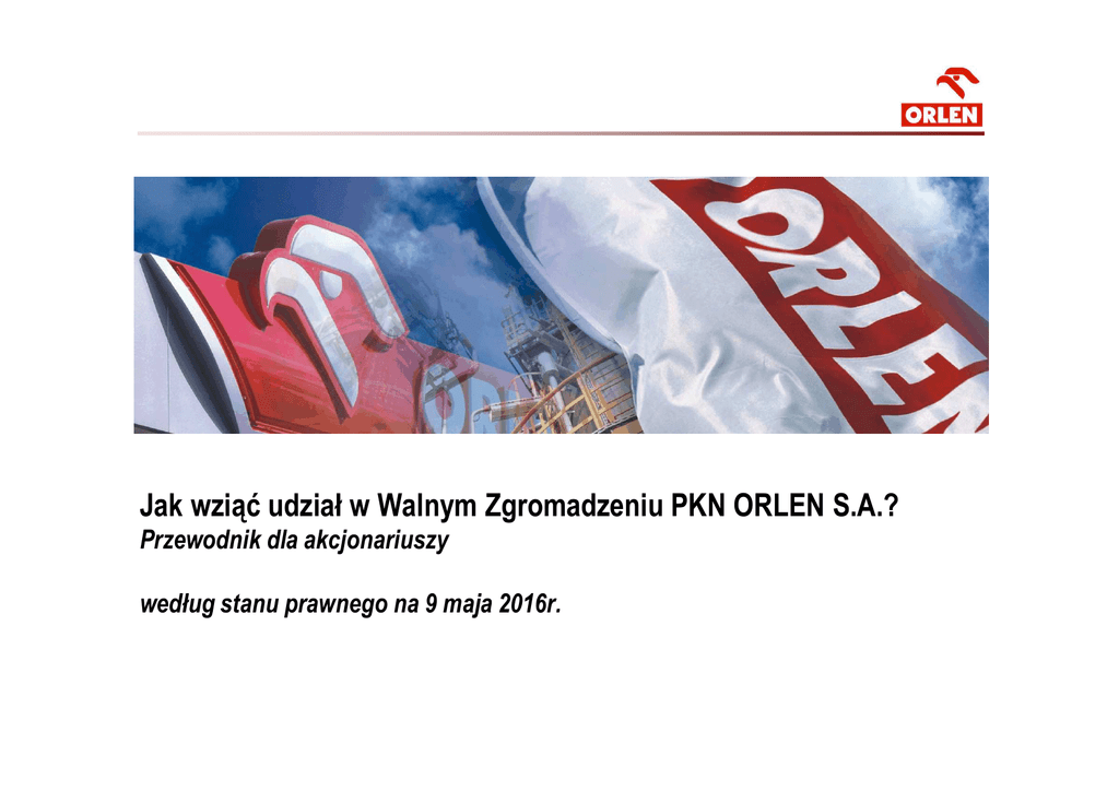 Jak wziąć udział w Walnym Zgromadzeniu PKN ORLEN S.A.? Przewodnik dla akcjonariuszy według stanu prawnego na 9 maja 2016r. Z tego przewodnika dowiesz się: Kto może wziąć udział w WZS* PKN ORLEN S.A.? Co zrobić, by wziąć udział w WZS PKN ORLEN S.A.? Jak znaleźć informacje o planowanym WZS PKN ORLEN S.A.? Jak kontaktować się z PKN ORLEN S.A. w sprawie zwołanego WZS? * WZS – skrót użyty w całym przewodniku, oznacza Walne Zgromadzenie Spółki. 2 Kto może wziąć udział w WZS? Akcjonariusz, który posiada akcje PKN ORLEN S.A. w dniu rejestracji uczestnictwa na WZS (dzień rejestracji). Dzień rejestracji wypada zawsze na 16 dni przed datą WZS. Dzień rejestracji jest podawany przez PKN ORLEN S.A. w ogłoszeniu o zwołaniu WZS, które umieszczane jest na www.orlen.pl w sekcji Relacje Inwestorskie/Walne Zgromadzenie. Akcjonariusz może wziąć udział w WZS osobiście lub przez ustanowionego w tym celu pełnomocnika. 3 3 W jaki sposób dowiem się, że WZS zostało już zwołane? Spółka publikuje raport bieżący z ogłoszeniem o zwołaniu WZS na co najmniej 26 dni przed terminem planowanego WZS. Ogłoszenie jest zamieszczane na stronie internetowej PKN ORLEN S.A. www.orlen.pl w sekcji Relacje Inwestorskie/ Walne Zgromadzenie. O! PKN ORLEN zamieścił już na swojej stronie ogłoszenie o zwołaniu Walnego Zgromadzenia! W ogłoszeniu znajdują się, m.in. informacje o: dacie i miejscu WZS, porządku obrad WZS, procedurach dotyczących uczestniczenia w obradach WZS, dniu rejestracji uczestnictwa w WZS, tym, w jaki sposób pozyskać materiały na WZS. Poprzez stronę internetową PKN ORLEN S.A. można zapisać się na listę osób, które otrzymują pocztą elektroniczną zawiadomienia o ostatnich zmianach na www.orlen.pl w sekcji Relacje Inwestorskie – dzięki temu ogłoszenie o zwołaniu WZS dotrze do zainteresowanych tuż po jego publikacji w serwisie. 4 4 Co mam zrobić, by wziąć udział w WZS? Musisz posiadać akcje PKN ORLEN S.A. dokładnie w dniu, który jest 16. dniem poprzedzającym dzień obrad WZS. Należy zgłosić się do biura maklerskiego prowadzącego Twój rachunek papierów wartościowych z zapisanymi akcjami PKN ORLEN S.A. i poprosić o wystawienie imiennego zaświadczenia o prawie do uczestnictwa w WZS. Żądanie wystawienia zaświadczenia o prawie do uczestnictwa w WZS należy zgłaszać w biurze maklerskim nie wcześniej niż po tym, jak ogłoszenie o zwołaniu WZS zostanie opublikowane przez PKN ORLEN S.A. i nie później niż w pierwszym dniu powszednim po dniu rejestracji. W momencie zgłaszania takiego żądania akcjonariusz wskazuje liczbę akcji na jaką ma być wystawione zaświadczenie. Proszę, to zaświadczenie o prawie uczestnictwa w Walnym Zgromadzeniu Spółki. Jestem akcjonariuszem PKN ORLEN. Chcę uczestniczyć w Walnym Zgromadzeniu. 5 5 Skąd dowiem się co będzie przedmiotem obrad WZS? Wszystkie materiały dla akcjonariuszy na WZS PKN ORLEN S.A. zamieszcza na swojej stronie internetowej www.orlen.pl w sekcji Relacje Inwestorskie/ Walne Zgromadzenia. Wśród tych materiałów znajdują się: Ogłoszenie o zwołaniu WZS z informacjami organizacyjnymi oraz porządkiem obrad WZS. Projekty uchwał, jakie zostaną zaprezentowane na WZS wraz z ich uzasadnieniami. Formularze pozwalające na wykonywanie prawa głosu przez pełnomocnika. Przekazane przez akcjonariuszy kandydatury na członków Rady Nadzorczej (jeśli takie zmiany są przewidziane w porządku obrad). Spółka uaktualnia na bieżąco dokumenty dotyczące WZS na stronie internetowej, do czasu rozpoczęcia obrad WZS. Przejrzałem już wszystkie materiały na stronie Spółki dotyczące Walnego Zgromadzenia PKN ORLEN. Będę tu jeszcze zaglądać, żeby sprawdzić, czy zamieścili coś nowego. 6 6 Czy mogę sprawdzić kto jest uprawniony do udziału w najbliższym WZS? PKN ORLEN S.A. na 3 dni robocze przed WZS udostępnia wszystkim swoim akcjonariuszom listę osób uprawnionych do udziału w WZS. Każdy akcjonariusz PKN ORLEN S.A. może: przeglądać listę, a także żądać jej odpisu w siedzibie PKN ORLEN S.A. w Płocku i w Warszawie; lista wykładana jest w recepcjach w obydwu lokalizacjach, żądać przesłania mu listy pocztą elektroniczną, przy czym akcjonariusz obowiązany jest wykazać swoją tożsamość oraz swój status jako akcjonariusza PKN ORLEN S.A., w sposób wskazany w ogłoszeniu o zwołaniu WZS. Proszę bardzo, oto lista. Jednak nie musiał Pan do nas osobiście przyjeżdżać, na Pana prośbę przesłalibyśmy listę pocztą elektroniczną. Lista akcjonariuszy uprawnianych do udziału w WZS zawiera: nazwiska i imiona albo firmy (nazwy) uprawnionych osób; ich miejsce zamieszkania (siedzibę); Dzień dobry jestem liczbę, rodzaj i numery posiadanych akcji; akcjonariuszem PKN ORLEN. Chciałem sprawdzić liczbę przysługujących im głosów na WZS. czy jestem na liście akcjonariuszy uprawionych do uczestnictwa w Walnym Zgromadzeniu. 7 7 W jaki sposób mam kontaktować się z PKN ORLEN S.A. w sprawie WZS? Służy do tego specjalny formularz kontaktowy na stronie www.orlen.pl w sekcji Relacje Inwestorskie/Walne Zgromadzenie, za pomocą którego akcjonariusz może przesyłać do PKN ORLEN S.A.: żądanie zwołania WZS, żądanie umieszczenia określonych spraw w porządku obrad WZS, zgłoszenie projektu uchwały WZS, zgłoszenie zmian do projektu uchwały WZS, żądanie przesłania listy akcjonariuszy uprawnionych do udziału w WZS, informację o udzieleniu lub odwołaniu pełnomocnictwa na WZS, inne dokumenty związane z WZS. Biuro Prawne tel. +48 24 256 51 17 e-mail: [email protected] Dzięki stronie internetowej www.orlen.pl mogę kontaktować się ze Spółką w sprawie Walnego Zgromadzenia. Biuro Relacji Inwestorskich tel. +48 24 256 81 80 e-mail: [email protected] 8 8 Zapraszamy do aktywnego udziału w Walnych Zgromadzeniach PKN ORLEN S.A. Biuro Relacji Inwestorskich tel. +48 24 256 81 80 e-mail: [email protected] www.orlen.pl Biuro Prawne tel. +48 