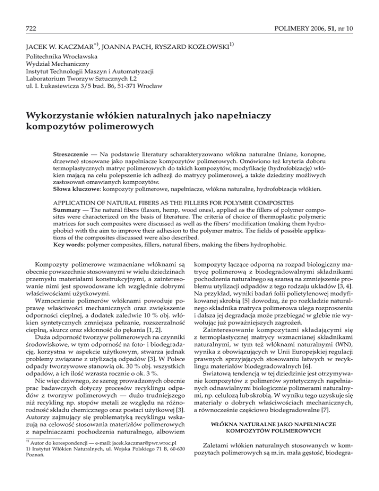 POLIMERY 2006, 51, nr 10 722 JACEK W. KACZMAR∗), JOANNA PACH, RYSZARD KOZ£OWSKI1) Politechnika Wroc³awska Wydzia³ Mechaniczny Instytut Technologii Maszyn i Automatyzacji Laboratorium Tworzyw Sztucznych L2 ul. I. £ukasiewicza 3/5 bud. B6, 51-371 Wroc³aw Wykorzystanie w³ókien naturalnych jako nape³niaczy kompozytów polimerowych Streszczenie — Na podstawie literatury scharakteryzowano w³ókna naturalne (lniane, konopne, drzewne) stosowane jako nape³niacze kompozytów polimerowych. Omówiono te¿ kryteria doboru termoplastycznych matryc polimerowych do takich kompozytów, modyfikacjê (hydrofobizacjê) w³ókien maj¹c¹ na celu polepszenie ich adhezji do matrycy polimerowej, a tak¿e dziedziny mo¿liwych zastosowañ omawianych kompozytów. S³owa kluczowe: kompozyty polimerowe, nape³niacze, w³ókna naturalne, hydrofobizacja w³ókien. APPLICATION OF NATURAL FIBERS AS THE FILLERS FOR POLYMER COMPOSITES Summary — The natural fibers (flaxen, hemp, wood ones), applied as the fillers of polymer composites were characterized on the basis of literature. The criteria of choice of thermoplastic polymeric matrices for such composites were discussed as well as the fibers‘ modification (making them hydrophobic) with the aim to improve their adhesion to the polymer matrix. The fields of possible applications of the composites discussed were also described. Key words: polymer composites, fillers, natural fibers, making the fibers hydrophobic. Kompozyty polimerowe wzmacniane w³óknami s¹ obecnie powszechnie stosowanymi w wielu dziedzinach przemys³u materia³ami konstrukcyjnymi, a zainteresowanie nimi jest spowodowane ich wzglêdnie dobrymi w³aœciwoœciami u¿ytkowymi. Wzmocnienie polimerów w³óknami powoduje poprawê w³aœciwoœci mechanicznych oraz zwiêkszenie odpornoœci cieplnej, a dodatek zaledwie 10 % obj. w³ókien syntetycznych zmniejsza pe³zanie, rozszerzalnoœæ ciepln¹, skurcz oraz sk³onnoœæ do pêkania [1, 2]. Du¿a odpornoœæ tworzyw polimerowych na czynniki œrodowiskowe, w tym odpornoœæ na foto- i biodegradacjê, korzystna w aspekcie u¿ytkowym, stwarza jednak problemy zwi¹zane z utylizacj¹ odpadów [3]. W Polsce odpady tworzywowe stanowi¹ ok. 30 % obj. wszystkich odpadów, a ich iloœæ wzrasta rocznie o ok. 3 %. Nic wiêc dziwnego, ¿e szereg prowadzonych obecnie prac badawczych dotyczy procesów recyklingu odpadów z tworzyw polimerowych — du¿o trudniejszego ni¿ recykling np. stopów metali ze wzglêdu na ró¿norodnoœæ sk³adu chemicznego oraz postaci u¿ytkowej [3]. Autorzy zajmuj¹cy siê problematyk¹ recyklingu wskazuj¹ na celowoœæ stosowania materia³ów polimerowych z nape³niaczami pochodzenia naturalnego, albowiem kompozyty ³¹cz¹ce odporn¹ na rozpad biologiczny matrycê polimerow¹ z biodegradowalnymi sk³adnikami pochodzenia naturalnego s¹ szans¹ na zmniejszenie problemu utylizacji odpadów z tego rodzaju uk³adów [3, 4]. Na przyk³ad, wyniki badañ folii polietylenowej modyfikowanej skrobi¹ [5] dowodz¹, ¿e po rozk³adzie naturalnego sk³adnika matryca polimerowa ulega rozproszeniu i dalsza jej degradacja mo¿e przebiegaæ w glebie nie wywo³uj¹c ju¿ powa¿niejszych zagro¿eñ. Zainteresowanie kompozytami sk³adaj¹cymi siê z termoplastycznej matrycy wzmacnianej sk³adnikami naturalnymi, w tym te¿ w³óknami naturalnymi (WN), wynika z obowi¹zuj¹cych w Unii Europejskiej regulacji prawnych sprzyjaj¹cych stosowaniu ³atwych w recyklingu materia³ów biodegradowalnych [6]. Œwiatow¹ tendencj¹ w tej dziedzinie jest otrzymywanie kompozytów z polimerów syntetycznych nape³nianych odnawialnymi biologicznie polimerami naturalnymi, np. celuloz¹ lub skrobi¹. W wyniku tego uzyskuje siê materia³y o dobrych w³aœciwoœciach mechanicznych, a równoczeœnie czêœciowo biodegradowalne [7]. W£ÓKNA NATURALNE JAKO NAPE£NIACZE KOMPOZYTÓW POLIMEROWYCH ∗) Autor do korespondencji — e-mail: [email protected] 1) Instytut W³ókien Naturalnych, ul. Wojska Polskiego 71 B, 60-630 Poznañ. Zaletami w³ókien naturalnych stosowanych w kompozytach polimerowych s¹ m.in. ma³a gêstoœæ, biodegra- POLIMERY 2006, 51, nr 10 W³ókna naturalne W³aœciwoœci Gêstoœæ tak tak wyraŸnie wiêksza nie nie ma³e du¿e ma³e du¿e tak niewielki nie nieco wiêkszy ma³a Odnawialnoœæ Podatnoœæ na recykling Zu¿ycie narzêdzi w czasie przetwórstwa Ryzyko zdrowotne podczas wdychania Biodegradowalnoœæ Koszt wytwarzania W³ókna szklane T a b e l a 2. Porównanie w³aœciwoœci u¿ytkowych ró¿nych rodzajów w³ókien naturalnych i szklanych [10—12] T a b l e 2. Comparison of the functional properties of various types of natural fibers and glass ones [10—12] Rodzaj w³ókna Modu³ Younga E, GPa Wytrzyma³oœæ na rozci¹ganie MPa Wyd³u¿enie % Gêstoœæ g/cm3 Wytrzyma³oœæ w³aœciwa km Szklane Lniane Rami Konopne Jutowe 72 45—100 128 35 43 2000—3400 600—1100 500—1000 389 320—550 1,8—3,2 1,5—2,4 1,2—4,0 1,1—1,6 1,7 2,56 1,4—1,5 1,4—1,5 1,4—1,5 1,3—1,45 78—132 42—76 36—69 28 24—39 Jednym z pierwszych nape³niaczy naturalnych zastosowanych w przetwórstwie tworzyw polimerowych by³a m¹czka drzewna. Z badañ wynika jednak, ¿e wzrost zawartoœci m¹czki drzewnej w kompozytach polimerowych powoduje pogorszenie ich w³aœciwoœci mechanicznych (rys. 1 i 2) [13—16]. Innymi materia³ami naturalnymi u¿ywanymi jako nape³niacze, pomimo komplikacji technicznych zwi¹zanych z przetwórstwem struktur w³óknistych, mog¹ byæ w³ókna konopne, lniane lub drzewne. 30 25 20 15 10 5 0 10 20 30 40 50 zawartoœæ m¹czki drzewnej , % obj. 60 Rys. 1. Zale¿noœæ wytrzyma³oœci na rozci¹ganie kompozytu z osnow¹ polipropylenow¹ od zawartoœci m¹czki drzewnej, wg [13] Fig. 1. Dependence of tensile strength of polypropylene based composite from the wood flour content [13] 35 udarnoœæ a n , kJ/m T a b e l a 1. Porównanie ogólnej charakterystyki w³ókien naturalnych i w³ókien szklanych [9, 10] T a