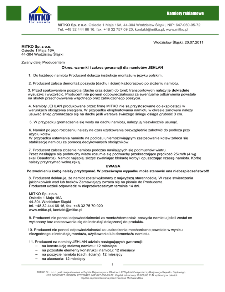 MITKO Sp. z o.o. Osiedle 1 Maja 16A, 44-304 Wodzisław Śląski, NIP: 647-050-95-72 Tel. +48 32 444 66 16, fax: +48 32 757 09 20, [email protected], www.mitko.pl Wodzisław Śląski, 20.07.2011 MITKO Sp. z o.o. Osiedle 1 Maja 16A 44-304 Wodzisław Śląski Zwany dalej Producentem Okres, warunki i zakres gwarancji dla namiotów JEHLAN 1. Do każdego namiotu Producent dołącza instrukcję montażu w języku polskim. 2. Producent zaleca demontaż poszycia (dachu i ścian) każdorazowo po złożeniu namiotu. 3. Przed spakowaniem poszycia (dachu oraz ścian) do toreb transportowych należy je dokładnie wysuszyć i wyczyścić. Producent nie ponosi odpowiedzialności za ewentualne odbarwienia powstałe na skutek przechowywania wilgotnego oraz zabrudzonego poszycia. 4. Namioty JEHLAN produkowane przez firmę MITKO nie są przystosowane do eksploatacji w warunkach obciążenia śniegiem. W przypadku eksploatowania namiotu w okresie zimowym należy usuwać śnieg gromadzący się na dachu jeśli warstwa świeżego śniegu osiąga grubość 3 cm. 5. W przypadku gromadzenia się wody na dachu namiotu, należy ją niezwłocznie usunąć. 6. Namiot po jego rozłożeniu należy na czas użytkowania bezwzględnie zakotwić do podłoża przy użyciu kotew. W przypadku ustawiania namiotu na podłożu uniemożliwiającym zastosowanie kotew zaleca się stabilizację namiotu za pomocą dedykowanych obciążników. 7. Producent zaleca złożenie namiotu podczas nasilających się podmuchów wiatru. Przez nasilające się podmuchy wiatru rozumie się podmuchy przekraczające prędkość 25km/h (4 wg skali Beaufort'a). Namiot najlepiej złożyć zwalniając blokadę korby i opuszczając czaszę namiotu. Korbę należy przytrzymać wolną ręką. UWAGA Po zwolnieniu korbę należy przytrzymać. W przeciwnym wypadku może stanowić ona niebezpieczeństwo!!! 8. Producent deklaruje, że namiot został wykonany z najwyższą starannością. W razie stwierdzenia jakichkolwiek wad lub braków Zamawiający zwraca się na piśmie do Producenta. Producent udzieli odpowiedzi w nieprzekraczalnym terminie 14 dni. MITKO Sp. z o.o. Osiedle 1 Maja 16A 44-304 Wodzisław Śląski tel. +48 32 444 66 16, fax. +48 32 75 70 920 www.mitko.pl, [email protected] 9. Producent nie ponosi odpowiedzialności za montaż/demontaż poszycia namiotu jeżeli został on wykonany bez zastosowania się do instrukcji dołączonej do produktu. 10. Producent nie ponosi odpowiedzialności za uszkodzenia mechaniczne powstałe w wyniku niezgodnego z instrukcją montażu, użytkowania lub demontażu namiotu. 11. Producent na namioty JEHLAN udziela następujących gwarancji: − na konstrukcję stalową namiotu: 12 miesiące − na pozostałe elementy konstrukcji namiotu: 12 miesięcy − na poszycie namiotu (dach, ściany): 12 miesięcy − na akcesoria: 12 miesięcy 1 MITKO Sp. z o.o. jest zarejestrowana w Sądzie Rejonowym w Gliwicach X Wydział Gospodarczy Krajowego Rejestru Sądowego. KRS 000033177. REGON 270708422. NIP 647-050-95-72. Kapitał zakładowy 10 000,00 PLN wpłacony w całości. Spółka reprezentowana przez Prezesa Michała Mitko MITKO Sp. z o.o. Osiedle 1 Maja 16A, 44-304 Wodzisław Śląski, NIP: 647-050-95-72 Tel. +48 32 444 66 16, fax: +48 32 757 09 20, [email protected], www.mitko.pl 12. Gwarancja nie obejmuje uszkodzeń spowodowanych niewłaściwą eksploatacją oraz wynikłych na skutek zdarzeń losowych, pożaru, huraganu, aktów wandalizmu. 13. Producent zastrzega sobie prawo do wprowadzenia zmian w powyższych informacjach. 14. W sprawach nieuregulowanych niniejszymi postanowieniami, obowiązują przepisy ustawy z dnia 27 lipca 2002 r. o szczególnych warunkach sprzedaży konsumenckiej oraz o zmianie Kodeksu Cywilnego (Dz.U. Z 2002 r. Nr 141, poz. 1176, z 2004 r. Nr 96, poz.959.). 2 MITKO Sp. z o.o. jest zarejestrowana w Sądzie Rejonowym w Gliwicach X Wydział Gospodarczy Krajowego Rejestru Sądowego. KRS 000033177. REGON 270708422. NIP 647-050-95-72. Kapitał zakładowy 10 000,00 PLN wpłacony w całości. Spółka reprezentowana przez Prezesa Michała Mitko