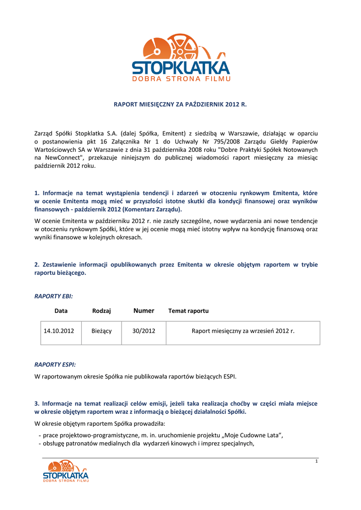 RAPORT MIESIĘCZNY ZA PAŹDZIERNIK 2012 R. Zarząd Spółki Stopklatka S.A. (dalej Spółka, Emitent) z siedzibą w Warszawie, działając w oparciu o postanowienia pkt 16 Załącznika Nr 1 do Uchwały Nr 795/2008 Zarządu Giełdy Papierów Wartościowych SA w Warszawie z dnia 31 października 2008 roku "Dobre Praktyki Spółek Notowanych na NewConnect", przekazuje niniejszym do publicznej wiadomości raport miesięczny za miesiąc październik 2012 roku. 1. Informacje na temat wystąpienia tendencji i zdarzeń w otoczeniu rynkowym Emitenta, które w ocenie Emitenta mogą mieć w przyszłości istotne skutki dla kondycji finansowej oraz wyników finansowych - październik 2012 (Komentarz Zarządu). W ocenie Emitenta w październiku 2012 r. nie zaszły szczególne, nowe wydarzenia ani nowe tendencje w otoczeniu rynkowym Spółki, które w jej ocenie mogą mieć istotny wpływ na kondycję finansową oraz wyniki finansowe w kolejnych okresach. 2. Zestawienie informacji opublikowanych przez Emitenta w okresie objętym raportem w trybie raportu bieżącego. RAPORTY EBI: Data 14.10.2012 Rodzaj Numer Bieżący 30/2012 Temat raportu Raport miesięczny za wrzesień 2012 r. RAPORTY ESPI: W raportowanym okresie Spółka nie publikowała raportów bieżących ESPI. 3. Informacje na temat realizacji celów emisji, jeżeli taka realizacja choćby w części miała miejsce w okresie objętym raportem wraz z informacją o bieżącej działalności Spółki. W okresie objętym raportem Spółka prowadziła: - prace projektowo-programistyczne, m. in. uruchomienie projektu „Moje Cudowne Lata”, - obsługę patronatów medialnych dla wydarzeń kinowych i imprez specjalnych, 1 STOPKLATKA SPÓŁKA AKCYJNA RAPORT MIESIĘCZNY ZA PAŹDZIERNIK 2012 R. - obszerne działania wokół premiery „Skyfall”- nowego filmu o Jamesie Bondzie, - działania redakcyjne polegające na przeprowadzeniu i publikacji licznych wywiadów i wideo wywiadów ze znanymi reżyserami i aktorami. Poniżej znajduje się szczegółowy opis działań prowadzonych w raportowanym miesiącu. Działania zespołu redakcyjnego: W okresie objętym raportem Redakcja Stopklatka: - przeprowadziła i opublikowała relacje z Warszawskiego Festiwalu Filmowego, - opublikowała serię artykułów związanymi z premierą „Skyfall”, nowego filmu z serii przygód Jamesa Bonda i obchodów 50 rocznicy premiery pierwszego filmu o agencie 007, - prowadziła blog „007 dni życia Jamesa B.”, będący literacką fikcją i pogodną wariacją na temat przygód agenta Jamesa Bonda w Polsce, - zamieściła interaktywny przewodnik po świecie Jamesa Bonda - połączonego z konkursem „OdFRUń z Bondem” - nagrody - wycieczkę trzydniową do Londynu oraz bilety lotnicze do dowolnego miasta europejskiego fundował partner konkursu FRU.pl. Redakcja przeprowadziła i opublikowała wideo-wywiady z reżyserami oraz aktorami grającymi w ważnych polskich produkcjach: - Agatą Buzek (aktorką grającą w filmie „Powrót”) - Maciejem Stuhrem, Marcinem Dorocińskim, Weroniką Rosati (aktorami filmu „Obława”) - Marcinem Krzyształowiczem (reżyserem filmu „Obława”) Redakcja przeprowadziła i opublikowała liczne wywiady, między innymi z: - Maciejem Kowalewskim (scenarzystą filmu „trzy siostry T”) - Damianem Lewisem (gwiazdą serialu „Homeland”) - Jeanem-MarciemVallee (reżyserem „Cafe de Flore”) - Davidem Foeniknosem (reżyserem “Delikatności”) - Julią Kijowską (aktorką grającą w filmie “Miłość”) - F. Murrayem Abrahamem, Piotrem Adamczykiem (aktorami filmu „Bitwa pod Wiedniem”) - Ole Bornedalem (reżyserem „Kronika opętania”) W październiku Redakcja zamieściła recenzje wszystkich filmów kinowych wchodzących do kin w danym miesiącu i wielu filmów wydanych na DVD/Blu‐ray oraz opublikowała kolejne odcinki komiksu "The Movie". Łącznie w październiku 2012 r. w Stopklatce pojawiło się ponad 650 informacji z kraju i zagranicy. Działania zespołu marketingowego i PR: W październiku 2012 r. praca zespołu marketingowego była skupiona wokół: - działań promocyjnych kanału telewizyjnego Kino Polska, - pozyskania sponsora nagród do konkursu nt. Jamesa Bonda, - promocji wydarzenia specjalnego „James Bond na Stopklatce”: interaktywna mapa, konkurs, blog, - promocji filmów: „Chińczyk na wynos”, „Trzy siostry T”, - promocji Warszawskiego Festiwalu Filmowego. 2 STOPKLATKA SPÓŁKA AKCYJNA RAPORT MIESIĘCZNY ZA PAŹDZIERNIK 2012 R. W październiku 2012 roku Stopklatka S.A. opiekowała się następującymi wydarzeniami: Przegląd Kina Japońskiego - patronat nad przeglądem Ambasada Japonii w Polsce wspólnie z warszawskim Kinem „Świt” i Fundacją Japońską zorganizowała przegląd kina japońskiego. Wydaje się, że siedem unikalnych filmów i ich twórców dzieli prawie wszystko, od czasu powstania po formę. Ich tematy mogą okazać się jednak zaskakująco zbieżne, co wskazuje hasło przeglądu: ”Miłość i młodość na przestrzeni dziejów”. Z tej właśnie perspektywy organizatorzy chcą nas zachęcić do podróży po kinie Nipponu w jego całym zróżnicowaniu. Filmowe Podlasie Atakuje! - patronat nad wydarzeniem To unikalne lokalne działanie, które rozmach i sukces zawdzięcza miejscowej energii oraz wrodzonemu poczuciu humoru. W ramach akcji swoje filmy prezentują m.in.: poeci, dziennikarze, studenci szkół artystycznych i filmowych, artyści plastycy, wykładowcy szkół wyższych oraz nieskażeni komercyjnym podejściem do kina - filmowcy niezależni. Se-Ma-For Film Festival - patronat nad festiwalem Organizowany pod logo jednego z najstarszych europejskich studiów międzynarodowy Se-Ma-For Film Festival to jedno z trzech wydarzeń na świecie poświęconych sztuce animacji stop motion. Podczas festiwalu można było zobaczyć niemal 300 animacji z 30 krajów, w tym najciekawsze produkcje z 10 europejskich państw (m.in. Estonii, Słowacji, Węgier, Litwy, Rosji i C