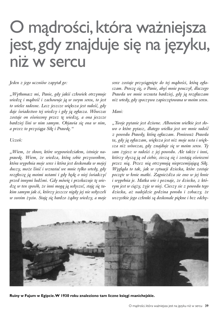 O mądrości, która ważniejsza jest, gdy znajduje się na języku, niż w sercu Jeden z jego uczniów zapytał go: „Wytłumacz mi, Panie, gdy jakiś człowiek otrzymuje wiedzę i mądrość i zachowuje ją w swym sercu, to jest to wielce radosne. Lecz jeszcze większa jest radość, gdy daje świadectwo tej wiedzy i gdy ją ogłasza. Wówczas zostaje on oświecony przez tę wiedzę, a ona jeszcze bardziej lśni w nim samym. Objawia się ona w nim, a przez to przyciąga Siłę i Prawdę.“ Uczeń: „Wiem, że słowo, które wypowiedziałem, istnieje naprawdę. Wiem, że wiedza, którą sobie przyswoiłem, która wypełnia moje serce i która jest doskonała w mojej duszy, może lśnić i wzrastać we mnie tylko wtedy, gdy rozgłoszę ją moimi ustami i gdy będę o niej świadczyć przed innymi ludźmi. Gdy mówię i przekazuje tę wiedzę w ten sposób, że inni mogą ją usłyszeć, staję się takim samym jak ci, którzy jeszcze nigdy jej nie usłyszeli w swoim życiu. Staję się bardzo żądny wiedzy, a moje serce zostaje przyciągnięte do tej mądrości, którą ogłaszam. Proszę cię, o Panie, abyś mnie pouczył, dlaczego Prawda we mnie wzrasta bardziej, gdy ją rozgłaszam niż wtedy, gdy spoczywa zapieczętowana w moim sercu. Mani: „Twoje pytanie jest dziwne. Albowiem wielkie jest słowo o które pytasz, dlatego wielka jest we mnie radość z powodu Prawdy, którą ogłaszam. Ponieważ Prawda ta, gdy ją ogłaszam, większa jest niż moje usta i większa niż wówczas, gdy znajduje się w moim sercu. Ty sam żyjesz w radości z jej powodu. Ale także i inni, którzy słyszą ją od ciebie, cieszą się i zostają oświeceni przez nią. Przez nią otrzymują nieprzemijającą Siłę. Wygląda to tak, jak w sytuacji dziecka, które zostaje poczęte w łonie matki. Zagnieżdża sie ono w jej łonie i wypełnia je. Matka wie i poznaje, że dziecko, z którym jest w ciąży, żyje w niej. Cieszy sie z powodu tego dziecka, aż nadejdzie godzina porodu i zobaczy, że wszystkie jego członki są doskonale piękne i bez odchy- Ruiny w Fajum w Egipcie. W 1930 roku znaleziono tam liczne księgi manichejskie. O mądrości, która ważniejsza jest na języku niż w sercu 39 leń. I żyje ono w żywym powietrzu, które jest wspaniałe; wspanialsze niż to, w którym się ono znajdowało poprzednio. Jego oczy zostają wypełnione światłem i mówi ono żywym głosem jak wszyscy, którzy zostają zrodzeni. W tym czasie, gdy kobieta jest w ciąży i gdy nosi w sobie dziecko, jej radość większa jest podczas narodzin, niż podczas zapłodnienia, ponieważ w chwili, gdy rodzi dziecko, widzi je w całkowitym jego pięknie i blasku. Miłość do dziecka i radość z tego powodu są sto razy większe po tym, jak je urodziła, niż przedtem. Ponieważ na początku, gdy była w ciąży, piękno dziecka i blask jego spojrzenia były ukryte przed jego matką. Natomiast gdy je urodziła i zobaczyła jego piękno, jego blask stał się widzialny także dla jego ojca i całej rodziny. Cieszyli się oni coraz bardziej, gdy zobaczyli dziecko z bliska i ujrzeli piękno i blask, jaki od niego emanował. Poprzez to porównanie scharakteryzowana została ta wiedza, która znajduje się w sercu człowieka. Jest ona taka sama jak chłopiec, który został przyjęty w porodzie z ciała matki. Gdy zostanie ona wypowiedziana i umocniona w twoim sercu, to jest taka sama jak dziecko, które zostaje zrodzone, tak, że wówczas widać jego piękno. I tak samo jest z wiedzą, którą głosi człowiek. Gdy wypowie ją ze swego serca, wówczas wzrasta ona i przybywa jej. Jej wielkość i jej wspaniałość zostają podwojone wtedy, gdy piękno i blask słowa zostaną objawione w oczach tych, którzy go słuchają. A wiedza zwiększa się, a ty słyszysz ją na nowo i dziwisz się z powodu tego, co ona głosi. Z wiedzą jest tak samo. Gdy spoczywa ona ukryta w sercu człowieka, zanim zostanie ogłoszona, równa jest ogniowi, który obecny jest w drewnie. Drewno zostaje spalone przez ogień. Natomiast szata ogniowa (płomień), która jest wewnątrz drewna, nie jest widoczna. Dopóki przytrzymujemy drewno i nie kładziemy go na ogniu, tak długo dom w którym się ono znajduje, nie będzie oświetlony. Światło nie pojawi się, nie wydobędzie się z drewna. Jest rzeczą możliwą, że cały dom zostanie oświetlony przez światło, które wydobywa się z płonącego kawałka drewna. I tak samo rzecz ma się z wiedzą, która żyje w sercu człowieka. Jest ona niczym ogień ukryty w kawałku drewna. I dopóki pozostaje ona tam ukryta, nie 40 PENTAGRAM 2/2011 widać światła. Tymczasem wiedza posiada następującą właściwość: jej światło i jej wspaniałość są ukryte w sercu Jednakże gdy człowiek daje świadectwo tej wiedzy, jej wspaniałość objawia się dla oczu i uszu wielu ludzi”. Uczeń: „Jeżeli wiedza jest taka, jak w tych porównaniach, które mi przedstawiłeś, dlaczego więc niektórzy ludzie radują się i szanują słowa wiedzy, gdy je słyszą, podczas gdy innym, którzy ich nie szanują, nie sprawia ona żadnej radości?” Mani: „Spójrz, przekonam cię i umocnię tę wiarę w twoim sercu, tak, że stanie się ona zauważalna. Albowiem wiedza podobna jest do chłopca, o którym ci mówiłem. Zostanie on stworzony z kobiety. Gdy zostanie zrodzony, jego ojciec, jego matka i jego krewni będą się radować, lecz będziesz mógł także spotkać innych, którzy będą zasmuceni z jego powodu. Są oni obcy dla niego. Nie należą do jego kręgu. Nie cieszą się z jego powodu, albowiem nie należy on do ich rodu. I podobnie rzecz wygląda z wiedzą. Jeżeli zostanie ona przekazana przez nauczyciela, wówczas ci, którzy do niej należą, przyjmują ją i cieszą się. Jednakże ci, którzy są jej obcy, nie cieszą się i nie przyjmują jej. Wiedza jest niczym światło ognia, o którym mówiłem, które wydobywa się z płonącego drewna i jest widoczne dla wszystkich oczu. Widzący