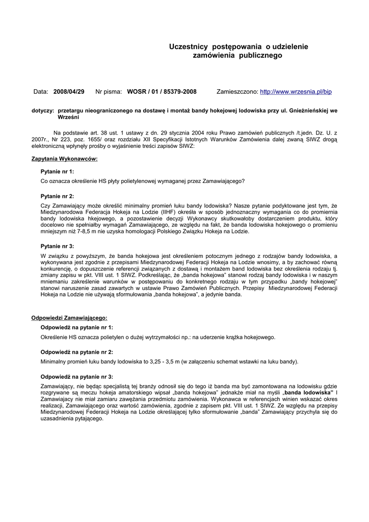 Uczestnicy postępowania o udzielenie zamówienia publicznego Data: 2008/04/29 Nr pisma: WOSR / 01 / 85379-2008 Zamieszczono: http://www.wrzesnia.pl/bip dotyczy: przetargu nieograniczonego na dostawę i montaż bandy hokejowej lodowiska przy ul. Gnieźnieńskiej we Wrześni Na podstawie art. 38 ust. 1 ustawy z dn. 29 stycznia 2004 roku Prawo zamówień publicznych /t.jedn. Dz. U. z 2007r., Nr 223, poz. 1655/ oraz rozdziału XII Specyfikacji Istotnych Warunków Zamówienia dalej zwaną SIWZ drogą elektroniczną wpłynęły prośby o wyjaśnienie treści zapisów SIWZ: Zapytania Wykonawców: Pytanie nr 1: Co oznacza określenie HS płyty polietylenowej wymaganej przez Zamawiającego? Pytanie nr 2: Czy Zamawiający może określić minimalny promień łuku bandy lodowiska? Nasze pytanie podyktowane jest tym, że Miedzynarodowa Federacja Hokeja na Lodzie (IIHF) okreśła w sposób jednoznaczny wymagania co do promiernia bandy lodowiska hkejowego, a pozostawienie decyzji Wykonawcy skutkowałoby dostarczeniem produktu, który docelowo nie spełniałby wymagań Zamawiającego, ze względu na fakt, że banda lodowiska hokejowego o promieniu mniejszym niż 7-8,5 m nie uzyska homologacji Polskiego Związku Hokeja na Lodzie. Pytanie nr 3: W związku z powyższym, że banda hokejowa jest określeniem potocznym jednego z rodzajów bandy lodowiska, a wykonywana jest zgodnie z przepisami Miedzynarodowej Federacji Hokeja na Lodzie wnosimy, a by zachować równą konkurencję, o dopuszczenie referencji związanych z dostawą i montażem band lodowiska bez określenia rodzaju tj. zmiany zapisu w pkt. VIII ust. 1 SIWZ. Podkreślając, że „banda hokejowa” stanowi rodzaj bandy lodowiska i w naszym mniemaniu zakreślenie warunków w postępowaniu do konkretnego rodzaju w tym przypadku „bandy hokejowej” stanowi naruszenie zasad zawartych w ustawie Prawo Zamówień Publicznych. Przepisy Miedzynarodowej Federacji Hokeja na Lodzie nie używają sformułowania „banda hokejowa”, a jedynie banda. Odpowiedzi Zamawiającego: Odpowiedź na pytanie nr 1: Określenie HS oznacza polietylen o dużej wytrzymałości np.: na uderzenie krążka hokejowego. Odpowiedź na pytanie nr 2: Minimalny promień łuku bandy lodowiska to 3,25 - 3,5 m (w załączeniu schemat wstawki na luku bandy). Odpowiedź na pytanie nr 3: Zamawiający, nie będąc specjalistą tej branży odnosił się do tego iż banda ma być zamontowana na lodowisku gdzie rozgrywane są meczu hokeja amatorskiego wipsał „banda hokejowa” jednakże miał na myśli „banda lodowiska” I Zamawiajacy nie miał zamiaru zawężania przedmiotu zamówienia. Wykonawca w referencjach winien wskazać okres realizacji, Zamawiającego oraz wartość zamówienia, zgodnie z zapisem pkt. VIII ust. 1 SIWZ. Ze względu na przepisy Miedzynarodowej Federacji Hokeja na Lodzie określającej tylko sformułowanie „banda” Zamawiający przychyla się do uzasadnienia pytającego.