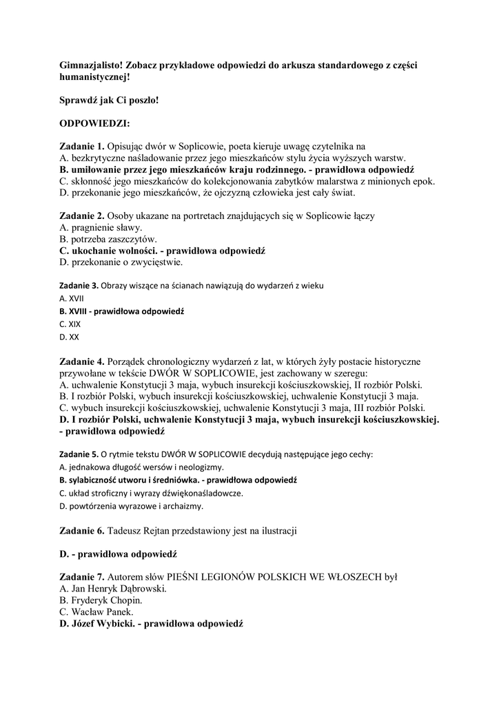 Gimnazjalisto! Zobacz przykładowe odpowiedzi do arkusza standardowego z części humanistycznej! Sprawdź jak Ci poszło! ODPOWIEDZI: Zadanie 1. Opisując dwór w Soplicowie, poeta kieruje uwagę czytelnika na A. bezkrytyczne naśladowanie przez jego mieszkańców stylu życia wyższych warstw. B. umiłowanie przez jego mieszkańców kraju rodzinnego. - prawidłowa odpowiedź C. skłonność jego mieszkańców do kolekcjonowania zabytków malarstwa z minionych epok. D. przekonanie jego mieszkańców, że ojczyzną człowieka jest cały świat. Zadanie 2. Osoby ukazane na portretach znajdujących się w Soplicowie łączy A. pragnienie sławy. B. potrzeba zaszczytów. C. ukochanie wolności. - prawidłowa odpowiedź D. przekonanie o zwycięstwie. Zadanie 3. Obrazy wiszące na ścianach nawiązują do wydarzeń z wieku A. XVII B. XVIII - prawidłowa odpowiedź C. XIX D. XX Zadanie 4. Porządek chronologiczny wydarzeń z lat, w których żyły postacie historyczne przywołane w tekście DWÓR W SOPLICOWIE, jest zachowany w szeregu: A. uchwalenie Konstytucji 3 maja, wybuch insurekcji kościuszkowskiej, II rozbiór Polski. B. I rozbiór Polski, wybuch insurekcji kościuszkowskiej, uchwalenie Konstytucji 3 maja. C. wybuch insurekcji kościuszkowskiej, uchwalenie Konstytucji 3 maja, III rozbiór Polski. D. I rozbiór Polski, uchwalenie Konstytucji 3 maja, wybuch insurekcji kościuszkowskiej. - prawidłowa odpowiedź Zadanie 5. O rytmie tekstu DWÓR W SOPLICOWIE decydują następujące jego cechy: A. jednakowa długość wersów i neologizmy. B. sylabiczność utworu i średniówka. - prawidłowa odpowiedź C. układ stroficzny i wyrazy dźwiękonaśladowcze. D. powtórzenia wyrazowe i archaizmy. Zadanie 6. Tadeusz Rejtan przedstawiony jest na ilustracji D. - prawidłowa odpowiedź Zadanie 7. Autorem słów PIEŚNI LEGIONÓW POLSKICH WE WŁOSZECH był A. Jan Henryk Dąbrowski. B. Fryderyk Chopin. C. Wacław Panek. D. Józef Wybicki. - prawidłowa odpowiedź Zadanie 8. Co nam obca moc wydarła, szablą odbijemy to A. hipoteza. B. opinia. C. deklaracja. - prawidłowa odpowiedź D. opis. Zadanie 9. W celu przekonania odbiorcy, że Polska istnieje mimo trzeciego rozbioru, poeta zastosował w pierwszej strofie A. epitet. B. apostrofę. C. uosobienie. - prawidłowa odpowiedź D. przerzutnię. Zadanie 10. Wskaż szereg składający się wyłącznie z wyrazów bliskoznacznych: A. gniazdo, kolebka, macierz. - prawidłowa odpowiedź B. przodek, ojcowizna, ojczyzna. C. państwo, kraj, władca. D. flaga, godło, hymn. Zadanie 11. Obca moc, o której mowa w PIEŚNI LEGIONÓW…, to A. Prusy, Austria, Rosja. - prawidłowa odpowiedź B. Rosja, Włochy, Szwecja. C. Szwecja, Prusy, Austria. D. Włochy, Szwecja, Prusy. Zadanie 12. Poeta mówi, że odzyskanie niepodległości będzie możliwe, gdy Polacy A. odrzucą prywatne interesy i okażą uległość wobec zaborców. B. zrezygnują z wewnętrznych waśni i podejmą walkę zbrojną z zaborcami. - prawidłowa odpowiedź C. zorganizują powstanie i zwrócą się o pomoc do mocarstw zachodnich. D. poprą Napoleona i doprowadzą do konfliktu między zaborcami. Zadanie 13. Melodia PIEŚNI LEGIONÓW... utrzymana jest w rytmie A. polki. B. tanga. C. krakowiaka. D. mazura. - prawidłowa odpowiedź Zadanie 14. Różnice między tekstem pierwszej zwrotki PIEŚNI LEGIONÓW... i tekstem pierwszej zwrotki polskiego hymnu państwowego dotyczą A. trzech wyrazów. B. czterech wyrazów. - prawidłowa odpowiedź C. pięciu wyrazów. D. sześciu wyrazów. Zadanie 15. Do wybitnych wodzów, którzy żyli na przełomie XVIII i XIX wieku i walczyli o niepodległość Polski, można zaliczyć: A. Tadeusza Kościuszkę, Jana Henryka Dąbrowskiego, ks. Józefa Poniatowskiego. - prawidłowa odpowiedź B. Stefana Czarnieckiego, Tadeusza Kościuszkę, Jana Henryka Dąbrowskiego. C. Jana Henryka Dąbrowskiego, ks. Józefa Poniatowskiego, Stefana Czarnieckiego. D. ks. Józefa Poniatowskiego, Stefana Czarnieckiego, Tadeusza Kościuszkę. Zadanie 16. Częściowym spełnieniem nadziei, które Polacy wiązali z Napoleonem, było utworzenie przez niego A. Wielkiego Księstwa Poznańskiego. B. Rzeczypospolitej Krakowskiej. C. Księstwa Warszawskiego. - prawidłowa odpowiedź D. Królestwa Polskiego. Zadanie 17. Bitwa pod Monte Cassino rozegrała się A. we Włoszech. - prawidłowa odpowiedź B. w Anglii. C. we Francji. D. w Polsce. Zadanie 18. Dowodem uznania dla heroicznej postawy polskich żołnierzy poległych pod Monte Cas-sino jest umieszczenie na ich cmentarzu A. płaskorzeźby orła. B. ołtarza z kamienia. C. orłów przy wejściu. D. krzyża Virtuti Militari. - prawidłowa odpowiedź Zadanie 19. Napis na plateau nawiązuje do napisu wykutego na polu bitwy pod A. Termopilami. - prawidłowa odpowiedź B. Wiedniem. C. Grunwaldem. D. Waterloo. Zadanie 20. Oba hasła (A i B) zawierają A. objaśnienie znaczenia wyrazu. B. wyjaśnienie pochodzenia wyrazu. C. charakterystykę gramatyczną wyrazu. - prawidłowa odpowiedź D. zasady wymowy wyrazu. Zadanie 21. Podaj znaczenie nazwy patriotyzm lokalny. Odpowiedź: patriotyzm lokalny - umiłowanie i przywiązanie względem lokalnej ojczyzny, miejsca zamieszkania, urodzenia Zadanie 22. Odwołując się do wiedzy na temat wydarzeń z dziejów walki Polaków o wolność, wykaż, że Tadeusz Kościuszko, Jan Henryk Dąbrowski i Józef Piłsudski zasłużyli na miano patriotów. Uwzględnij czas podanych przez siebie wydarzeń. 1. Tadeusz Kościuszko – wzniecił antyrosyjskie powstanie celem odzyskania niepodległości Rzeczypospolitej, 24 marca 1794 r. na rynku krakowskim złożył narodowi polskiemu uroczystą przysięgę i objął przywództwo insurekcji jako Najwyższy Naczelnik Siły Zbrojnej Narodowej. 2. Jan Henryk Dąbrowski – uczestniczył w insurekcji kościuszkowskiej (1974); był twórcą Legionów Polskich we Włoszech (1797), u boku Napoleona walczył o wolność ojczyzny 3. Józef Piłsudski - z jego inicjatywy powstały Legiony Pols