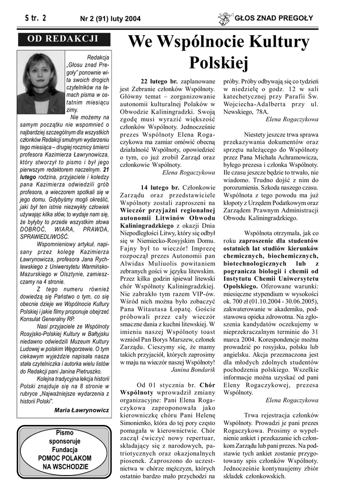 Str. 2 Nr 2 (91) luty 2004 OD REDAKCJI Redakcja „Głosu znad Pregoły” ponownie wita swoich drogich czytelników na łamach pisma w ostatnim miesiącu zimy. Nie możemy na samym początku nie wspomnieć o najbardziej szczególnym dla wszystkich członków Redakcji smutnym wydarzeniu tego miesiąca – drugiej rocznicy śmierci profesora Kazimierza Ławrynowicza, który stworzył to pismo i był jego pierwszym redaktorem naczelnym. 21 lutego rodzina, przyjaciele i koledzy pana Kazimierza odwiedzili grób profesora, a wieczorem spotkali się w jego domu. Gdybyśmy mogli określić, jaki był ten istnie niezwykły człowiek używając kilka słów, to wydaje nam się, że byłyby to przede wszystkim słowa DOBROĆ, WIARA, PRAWDA, SPRAWIEDLIWOŚĆ. Wspomnieniowy artykuł, napisany przez kolegę Kazimierza Ławrynowicza, profesora Jana Rychlewskiego z Uniwersytetu WarmińskoMazurskiego w Olsztynie, zamieszczamy na 4 stronie. Z tego numeru również dowiedzą się Państwo o tym, co się obecnie dzieje we Wspólnocie Kultury Polskiej i jakie filmy proponuje obejrzeć Konsulat Generalny RP. Nasi przyjaciele ze Wspólnoty Rosyjsko-Polskiej Kultury w Bałtyjsku niedawno odwiedzili Muzeum Kultury Ludowej w polskim Węgorzewie. O tym ciekawym wyjeździe napisała nasza stała czytelniczka i autorka wielu listów do Redakcji pani Janina Pietruszko. Kolejna tradycyjna lekcja historii Polski znajduje się na 8 stronie w rubryce „Najważniejsze wydarzenia z historii Polski”. Maria Ławrynowicz Pismo sponsoruje Fundacja POMOC POLAKOM NA WSCHODZIE GŁOS ZNAD PREGOŁY We Wspólnocie Kultury Polskiej 22 lutego br. zaplanowane jest Zebranie członków Wspólnoty. Główny temat – zorganizowanie autonomii kulturalnej Polaków w Obwodzie Kaliningradzki. Swoją zgodę musi wyrazić większość członków Wspólnoty. Jednocześnie prezes Wspólnoty Elena Rogaczykowa ma zamiar omówić obecną działalność Wspólnoty, opowiedzieć o tym, co już zrobił Zarząd oraz członkowie Wspólnoty. Elena Rogaczykowa 14 lutego br. Członkowie Zarządu oraz przedstawiciele Wspólnoty zostali zaproszeni na Wieczór przyjaźni regionalnej autonomii Litwinów Obwodu Kaliningradzkiego z okazji Dnia Niepodległości Litwy, który się odbył się w Niemiecko-Rosyjskim Domu. Fajny był to wieczór! Imprezę rozpoczął prezes Autonomii pan Alwidas Muliuolis powitaniem zebranych gości w języku litewskim. Przez kilka godzin śpiewał litewski chór Wspólnoty Kaliningradzkiej. Nie zabrakło tym razem VIP-ów. Wśród nich można było zobaczyć Pana Witautasa Łopatę. Goście próbowali przez cały wieczór smaczne dania z kuchni litewskiej. W imieniu naszej Wspólnoty toast wzniósł Pan Borys Marszew, członek Zarządu. Cieszymy się, że mamy takich przyjaciół, których zaprosimy w maju na wieczór naszej Wspólnoty! Janina Bondarik Od 01 stycznia br. Chór Wspólnoty wprowadził zmiany organizacyjne: Pani Elena Rogaczykowa zaproponowała jako kierowniczkę chóru Pani Helenę Simonienko, która do tej pory często pomagała w kierownictwie. Chór zaczął ćwiczyć nowy repertuar, składający się z narodowych, patriotycznych oraz okazjonalnych piosenek. Zaproszono do uczestnictwa w chórze mężczyzn, których ostatnio bardzo mało przychodzi na próby. Próby odbywają się co tydzień w niedzielę o godz. 12 w sali katechetycznej przy Parafii Św. Wojciecha-Adalber ta przy ul. Newskiego, 78A. Elena Rogaczykowa Niestety jeszcze trwa sprawa przekazywania dokumentów oraz sprzętu należącego do Wspólnoty przez Pana Michała Achramowicza, byłego prezesa i członka Wspólnoty. Ile czasu jeszcze będzie to trwało, nie wiadomo. Trudno dojść z nim do porozumienia. Szkoda naszego czasu. Wspólnota z tego powodu ma już kłopoty z Urzędem Podatkowym oraz Zarządem Prawnym Administracji Obwodu Kaliningradzkiego. Wspólnota otrzymała, jak co roku zaproszenie dla studentów ostatnich lat studiów kierunków chemicznych, biochemicznych, biotechnologicznych lub z pogranicza biologii i chemii od Instytutu Chemii Uniwersytetu Opolskiego. Oferowane warunki: miesięczne stypendium w wysokości ok. 700 zł (01.10.2004 - 30.06.2005), zakwaterowanie w akademiku, podstawowa opieka zdrowotna. Na zgłoszenia kandydatów oczekujemy w nieprzekraczalnym terminie do 31 marca 2004. Korespondencje można prowadzić po rosyjsku, polsku lub angielsku. Akcja przeznaczona jest dla młodych zdolnych studentów pochodzenia polskiego. Wszelkie informacje można uzyskać od pani Eleny Rogaczykowej, prezesa Wspólnoty. Elena Rogaczykowa Trwa rejestracja członków Wspólnoty. Prowadzi je pani prezes Rogaczykowa. Prosimy o wypełnienie ankiet i przekazanie ich członkom Zarządu lub pani prezes. Na podstawie tych ankiet zostanie przygotowany spis członków Wspólnoty. Jednocześnie kontynuujemy zbiór składek członkowskich.