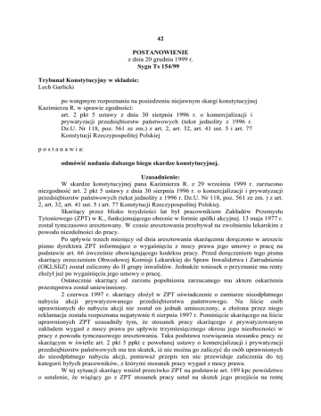 42 POSTANOWIENIE z dnia 20 grudnia 1999 r. Sygn Ts 154/99 Trybunał Konstytucyjny w składzie: Lech Garlicki po wstępnym rozpoznaniu na posiedzeniu niejawnym skargi konstytucyjnej Kazimierza R. w sprawie zgodności: art. 2 pkt 5 ustawy z dnia 30 sierpnia 1996 r. o komercjalizacji i prywatyzacji przedsiębiorstw państwowych (tekst jednolity z 1996 r. Dz.U. Nr 118, poz. 561 ze zm.) z art. 2, art. 32, art. 41 ust. 5 i art. 77 Konstytucji Rzeczypospolitej Polskiej p o s t a n a w i a: odmówić nadania dalszego biegu skardze konstytucyjnej. Uzasadnienie: W skardze konstytucyjnej pana Kazimierza R. z 29 września 1999 r. zarzucono niezgodność art. 2 pkt 5 ustawy z dnia 30 sierpnia 1996 r. o komercjalizacji i prywatyzacji przedsiębiorstw państwowych (tekst jednolity z 1996 r. Dz.U. Nr 118, poz. 561 ze zm. ) z art. 2, art. 32, art. 41 ust. 5 i art. 77 Konstytucji Rzeczypospolitej Polskiej. Skarżący przez blisko trzydzieści lat był pracownikiem Zakładów Przemysłu Tytoniowego (ZPT) w K., funkcjonującego obecnie w formie spółki akcyjnej. 13 maja 1977 r. został tymczasowo aresztowany. W czasie aresztowania przebywał na zwolnieniu lekarskim z powodu niezdolności do pracy. Po upływie trzech miesięcy od dnia aresztowania skarżącemu doręczono w areszcie pismo dyrektora ZPT informujące o wygaśnięciu z mocy prawa jego umowy o pracę na podstawie art. 66 ówcześnie obowiązującego kodeksu pracy. Przed doręczeniem tego pisma skarżący orzeczeniem Obwodowej Komisji Lekarskiej do Spraw Inwalidztwa i Zatrudnienia (OKLSIiZ) został zaliczony do II grupy inwalidów. Jednakże wniosek o przyznanie mu renty złożył już po wygaśnięciu jego umowy o pracę. Ostatecznie skarżący od zarzutu popełnienia zarzucanego mu aktem oskarżenia przestępstwa został uniewinniony. 2 czerwca 1997 r. skarżący złożył w ZPT oświadczenie o zamiarze nieodpłatnego nabycia akcji prywatyzowanego przedsiębiorstwa państwowego. Na liście osób uprawnionych do nabycia akcji nie został on jednak umieszczony, a złożona przez niego reklamacja została rozpoznana negatywnie 6 sierpnia 1997 r. Pominięcie skarżącego na liście uprawnionych ZPT uzasadniły tym, że stosunek pracy skarżącego z prywatyzowanym zakładem wygasł z mocy prawa po upływie trzymiesięcznego okresu jego nieobecności w pracy z powodu tymczasowego aresztowania. Taka podstawa rozwiązania stosunku pracy ze skarżącym w świetle art. 2 pkt 5 ppkt c powołanej ustawy o komercjalizacji i prywatyzacji przedsiębiorstw państwowych ma ten skutek, iż nie można go zaliczyć do osób uprawnionych do nieodpłatnego nabycia akcji, ponieważ przepis ten nie przewiduje zaliczenia do tej kategorii byłych pracowników, z którymi stosunek pracy wygasł z mocy prawa. W tej sytuacji skarżący wniósł przeciwko ZPT na podstawie art. 189 kpc powództwo o ustalenie, że wiążący go z ZPT stosunek pracy ustał na skutek jego przejścia na rentę inwalidzką. Sąd Rejonowy powództwo to oddalił. Od orzeczenia sądu I instancji skarżący wniósł apelację do Sąd Wojewódzkiego, która również została oddalona. Sąd II instancji w uzasadnieniu wskazał, iż orzeczenie OKLSIiZ wydane zostało w związku ze staraniem się skarżącego o przyznanie mu renty inwalidy wojennego i nie dotyczyło przyznania mu renty inwalidzkiej z tytułu zatrudnienia. Trybunał Konstytucyjny zważył co następuje: Instytucja skargi konstytucyjnej umożliwia podmiotom uprawnionym dochodzenie ochrony swoich praw i wolności, które bezpośrednią podstawę znajdują w konstytucji. Stwarza więc ona podmiotom tych praw możliwość zwrócenia się do Trybunału Konstytucyjnego w celu zbadania zgodności z konstytucją przepisów prawnych, na podstawie których sądy bądź organy administracji orzekły ostatecznie o przysługujących skarżącym prawach i wolnościach. Ustawodawca mocą art. 79 ust. 1 konstytucji zastrzegł jednak, iż dokonywana przez Trybunał Konstytucyjny kontrola naruszenia tych praw i wolności będzie odbywała się na zasadach określonych w ustawie. Aktem prawnym, w którym zostały sprecyzowane owe zasady jest ustawa z dnia 1 sierpnia 1997 r. o Trybunale Konstytucyjnym (Dz.U. Nr 102, poz. 643). Z jej art. 47 ust. 1 pkt 1 wynika, że podmiot wnoszący skargę powinien dokładnie określić ustawę lub inny akt normatywny, na podstawie którego sąd lub organ administracji publicznej orzekł ostatecznie o wolnościach lub prawach albo obowiązkach skarżącego, które zostały uregulowane w konstytucji. Przytoczony przepis ustawy ciężar wykazania, że kwestionowane orzeczenie zostało wydane na podstawie aktu normatywnego, który narusza konstytucyjne prawa i wolności, nałożył na wnoszącego skargę. W tej sytuacji Trybunał Konstytucyjny dokonując wstępnego rozpoznania skargi w niniejszej sprawie był zobowiązany do ustalenia czy istotnie skarżący spełnił ten wymóg ustawowy. Z akt sprawy ponad wszelką wątpliwość wynika, że przedłożony przez skarżącego wyrok nie ma przymiotu orzeczenia ostatecznego w rozumieniu art. 79 ust. 1 konstytucji, a w konsekwencji nie było możliwe nadanie skardze konstytucyjnej dalszego biegu. W sprawie jest bezsporne, że skarżący podnosi niezgodność art. 2 pkt 5 ustawy o komercjalizacji i prywatyzacji przedsiębiorstw państwowych z art. art. 2, 32, 41 ust. 5 i 77 konstytucji. Stwierdzenie tego faktu daje Trybunałowi pewność, iż kwestionowane przez skarżącego orzeczenie nie zostało wydane na podstawie aktu normatywnego, który mógłby być podstawą rozważań Trybunału w postępowaniu rozpoznawczym co do tego, czy naruszył on wskazane wzorce konstytucyjne. Wynika to stąd, iż art. 2 pkt 5 ustawy o komercjalizacji i prywatyzacji przedsiębiorstw państwowych nie stanowił podstawy rozstrzygnięcia Sądu Wojewódzkiego: jednoznacznie wskazaną przez ten sąd podstawą prawną wyroku był – zgodnie z treścią pozwu skarżącego – przepis art. 189 kpc, a nie 