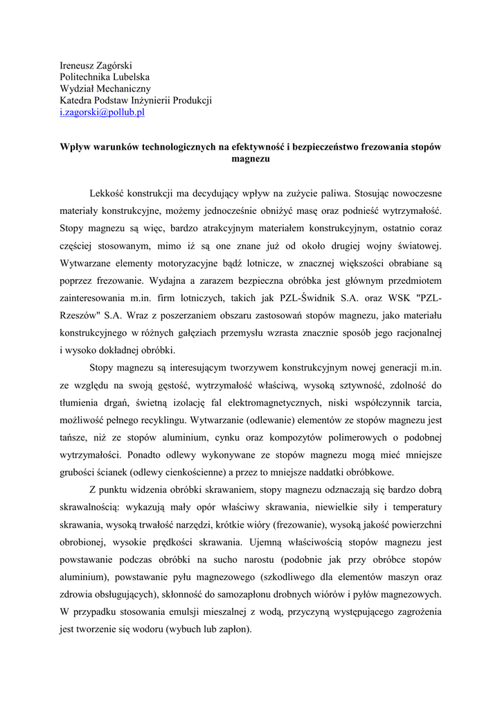 Ireneusz Zagórski Politechnika Lubelska Wydział Mechaniczny
