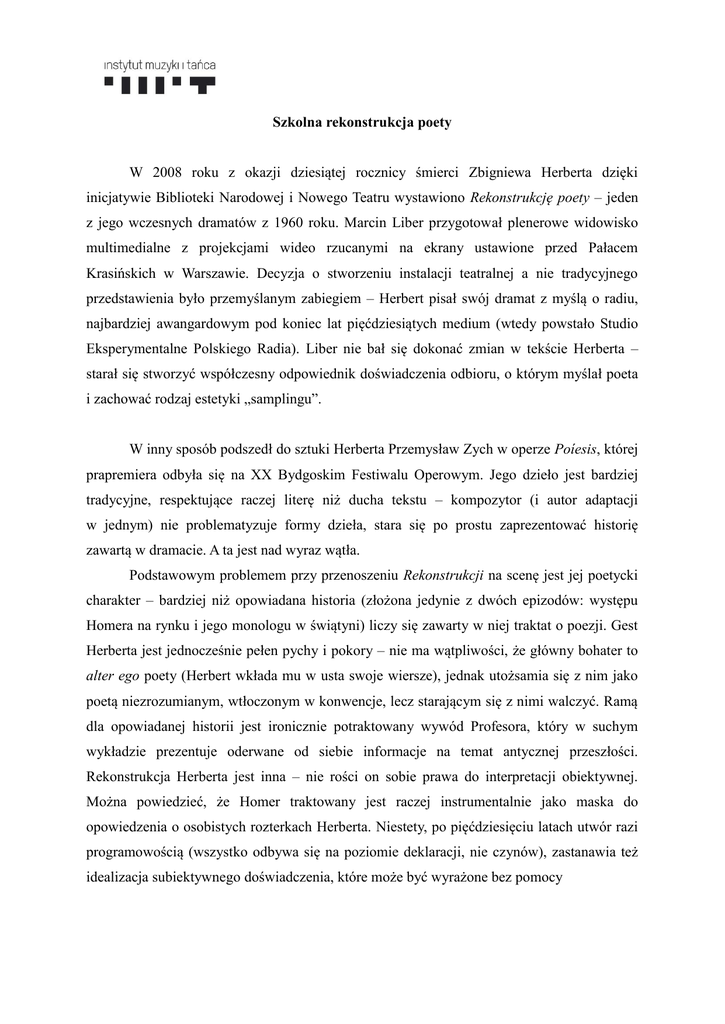 Szkolna rekonstrukcja poety W 2008 roku z okazji dziesiątej rocznicy śmierci Zbigniewa Herberta dzięki inicjatywie Biblioteki Narodowej i Nowego Teatru wystawiono Rekonstrukcję poety – jeden z jego wczesnych dramatów z 1960 roku. Marcin Liber przygotował plenerowe widowisko multimedialne z projekcjami wideo rzucanymi na ekrany ustawione przed Pałacem Krasińskich w Warszawie. Decyzja o stworzeniu instalacji teatralnej a nie tradycyjnego przedstawienia było przemyślanym zabiegiem – Herbert pisał swój dramat z myślą o radiu, najbardziej awangardowym pod koniec lat pięćdziesiątych medium (wtedy powstało Studio Eksperymentalne Polskiego Radia). Liber nie bał się dokonać zmian w tekście Herberta – starał się stworzyć współczesny odpowiednik doświadczenia odbioru, o którym myślał poeta i zachować rodzaj estetyki „samplingu”. W inny sposób podszedł do sztuki Herberta Przemysław Zych w operze Poíesis, której prapremiera odbyła się na XX Bydgoskim Festiwalu Operowym. Jego dzieło jest bardziej tradycyjne, respektujące raczej literę niż ducha tekstu – kompozytor (i autor adaptacji w jednym) nie problematyzuje formy dzieła, stara się po prostu zaprezentować historię zawartą w dramacie. A ta jest nad wyraz wątła. Podstawowym problemem przy przenoszeniu Rekonstrukcji na scenę jest jej poetycki charakter – bardziej niż opowiadana historia (złożona jedynie z dwóch epizodów: występu Homera na rynku i jego monologu w świątyni) liczy się zawarty w niej traktat o poezji. Gest Herberta jest jednocześnie pełen pychy i pokory – nie ma wątpliwości, że główny bohater to alter ego poety (Herbert wkłada mu w usta swoje wiersze), jednak utożsamia się z nim jako poetą niezrozumianym, wtłoczonym w konwencje, lecz starającym się z nimi walczyć. Ramą dla opowiadanej historii jest ironicznie potraktowany wywód Profesora, który w suchym wykładzie prezentuje oderwane od siebie informacje na temat antycznej przeszłości. Rekonstrukcja Herberta jest inna – nie rości on sobie prawa do interpretacji obiektywnej. Można powiedzieć, że Homer traktowany jest raczej instrumentalnie jako maska do opowiedzenia o osobistych rozterkach Herberta. Niestety, po pięćdziesięciu latach utwór razi programowością (wszystko odbywa się na poziomie deklaracji, nie czynów), zastanawia też idealizacja subiektywnego doświadczenia, które może być wyrażone bez pomocy jakichkolwiek konwencji. Zych czyni poetę jeszcze bardziej obcym wobec świata – jego partia rozdarta jest między śpiewem a deklamacją, dodatkowo kompozytor powierza ją brzmiącemu nienaturalnie głosowi kontratenorowemu. Jego rewersem, rodzajem animy, jest Głos kobiecy – pełna wokaliz rola kontraltowa. W kameralnej obsadzie dopełnienie stanowi tenorowa, chłopięca partia syna Homera – Elpenora oraz groteskowa, zacinająca się partia Profesora (baryton). Towarzyszy im niewielki zespół (saksofon, trąbka, róg, tuba, keyboard i perkusja) – rozrzedzona warstwa instrumentalna ma na celu podkreślenie surowości „antycznych” dywagacji Herberta, jednak tworzy raczej bezbarwne tło. Uwagę przykuwają jedynie ilustracyjne efekty, które kontrapunktują słowa Profesora (jego wykład przerywa co jakiś czas „kapanie wody” – monotonne dźwięki uzyskane przez uderzenia ręką w ustnik instrumentów dętych). Nie można zapominać, że Herbert stworzył dramat rozgrywający się w wyobraźni – antyk jest projekcją odbiorcy słuchowiska. Wyzwaniem wydaje się więc ukonkretnienie go na deskach teatru i trudno chyba wyobrazić sobie inscenizację obywającą się przy tym bez radykalnych gestów. Jednak Tomáš Studený, reżyser spektaklu, zaproponował tradycyjne, a nawet szkolne przedstawienie. Niewielką przestrzeń Sali Kameralnej Opery Nova wypełnił biały kubik z dwoma skrzydłami (scenografia i kostiumy Sylva Marková), na który czasem wdrapywali się wykonawcy. Ten postument sprawił, że Poíesis stało się rodzajem oratoriumpasji o życiu poety – stereotypowego romantyka. Skojarzenie z oratorium było jeszcze silniejsze ze względu na sztywność gestów postaci zastygających co jakiś czas w sztucznych pozach. Proste, bezstylowe, jednolite kolorystycznie kostiumy uzupełniały interpretację – świadczyły o chęci wpisania rozważań Herberta w obszar uniwersalnych tematów: poezji dającej poznanie, ale jednocześnie alienującej człowieka naznaczonego talentem literackim. Zupełnie niepotrzebną częścią inscenizacji były tautologiczne projekcje (np. fragment ze słynnym wierszem Kamyk uzupełniony został obrazem kamiennego brzegu). Całość sprawiała niestety wrażenie spektaklu studenckiego. Nieznośny był patos, z jakim przedstawiona została historia ślepnącego poety. Wydaje się, że warto szukać elementów humoru i (auto)ironii w dramacie Herberta, ale nie w oczywistym, groteskowym Profesorze, ale w ambiwalencji, z jaką przedstawiony został Homer – z jednej strony megaloman, podkreślający swoje osiągnięcia poetyckie, z drugiej strony sterroryzowany przez żonę mężczyzna wymykający się ze swojego zamknięcia mimo jej sprzeciwów. Zamiast tego można było usłyszeć ze sceny wzniosłe słowa o marzeniu wychowania ludzi, którzy dzięki poezji będą dodawali „wzruszenie do wzruszenia/ I słowo do milczenia”. Jednoaktówka Zycha została zamówiona i wyprodukowana przez Fundację Operalnia dzięki dotacji z programu Ministra Kultury i Dziedzictwa Narodowego realizowanego przez Instytut Muzyki i Tańca – cieszy próba ożywienia polskiego życia muzycznego i działalność alternatywnych instytucji propagujących operę współczesną. Niestety, w przypadku tej produkcji efekt jest rozczarowujący, mimo autentycznego zaangażowania zespołu muzycznego (Polish Energetic Ensemble pod dyrekcją Jerzego Wołosiuka) i solistów (Homer – Jakub Burzyński, Profesor – Krzysztof Bobrzecki, Głos kobiec