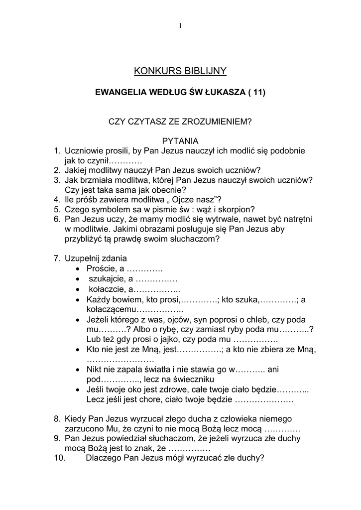 1 KONKURS BIBLIJNY EWANGELIA WEDŁUG ŚW ŁUKASZA ( 11) CZY CZYTASZ ZE ZROZUMIENIEM? 1. 2. 3. 4. 5. 6. PYTANIA Uczniowie prosili, by Pan Jezus nauczył ich modlić się podobnie jak to czynił………… Jakiej modlitwy nauczył Pan Jezus swoich uczniów? Jak brzmiała modlitwa, której Pan Jezus nauczył swoich uczniów? Czy jest taka sama jak obecnie? Ile próśb zawiera modlitwa „ Ojcze nasz”? Czego symbolem sa w pismie św : wąż i skorpion? Pan Jezus uczy, że mamy modlić się wytrwale, nawet być natrętni w modlitwie. Jakimi obrazami posługuje się Pan Jezus aby przybliżyć tą prawdę swoim słuchaczom? 7. Uzupełnij zdania Proście, a …………. szukajcie, a …………… kołaczcie, a…………….. Każdy bowiem, kto prosi,………….; kto szuka,………….; a kołaczącemu…………….. Jeżeli którego z was, ojców, syn poprosi o chleb, czy poda mu……….? Albo o rybę, czy zamiast ryby poda mu………..? Lub też gdy prosi o jajko, czy poda mu ……………. Kto nie jest ze Mną, jest…………….; a kto nie zbiera ze Mną, …………………… Nikt nie zapala światła i nie stawia go w……….. ani pod………….., lecz na świeczniku Jeśli twoje oko jest zdrowe, całe twoje ciało będzie………... Lecz jeśli jest chore, ciało twoje będzie ………………… 8. Kiedy Pan Jezus wyrzucał złego ducha z człowieka niemego zarzucono Mu, że czyni to nie mocą Bożą lecz mocą …………. 9. Pan Jezus powiedział słuchaczom, że jeżeli wyrzuca złe duchy mocą Bożą jest to znak, że …………… 10. Dlaczego Pan Jezus mógł wyrzucać złe duchy? 2 11. Co się dzieje z człowiekiem, który się nie nawraca, tylko powraca do swoich starych grzechów? 12. Kto jest prawdziwie błogosławiony? 13. Co to jest znak Jonasza? 14. Dlaczego Pan Jezus nazywał swoich słuchaczy „plemieniem przewrotnym? 15. Jakie postaci ze Starego Testamentu Pan Jezus przeciwstawia swoim „ przewrotnym” słuchaczom? 16. Co jest światłem ciała?( dzięki czemu widzimy światło?) 17. Kto jest naszym światłem? 18. O co musimy się troszczyć mając w sobie światło Boże 19. Jaka sytuacja sprawiła, że Pan Jezus wypowiedział się bardzo radykalnie przeciw faryzeuszom? 20. Jakie zarzuty postawił Pan Jezus faryzeuszom? 21. Do czego Pan Jezus porównał faryzeuszy i co z tego wynika? 22. Jakie zarzuty stawia Pan Jezus uczonym w Piśmie? 23. Jak faryzeusze i uczeni w Piśmie zareagowali ma zarzuty stawiane im przez Pana Jezusa? KONKURS BIBLIJNY EWANGELIA WEDŁUG ŚW ŁUKASZA (11) CZY CZYTASZ ZE ZROZUMIENIEM? KLUCZ DO ODPOWIEDZI 1. Jan Chrzciciel 2. Modlitwy „ Ojcze nasz” 3. Modlitwa „ Ojcze nasz” jest w dzisiejszej wersji nieco zmieniona. Oryginał brzmiał tak: Ojcze, niech się święci Twoje imię; niech przyjdzie Twoje królestwo! Naszego chleba powszedniego dawaj nam na każdy dzień i przebacz nam nasze grzechy, bo i my przebaczamy każdemu, kto nam zawini; i nie dopuść, byśmy ulegli pokusie 4. 5 ( patrz wyżej) 5. symbolem zła 6. 3 Obrazem natrętnego przyjaciela ( "Ktoś z was, mając przyjaciela, pójdzie do niego o północy i powie mu: "Przyjacielu, użycz mi trzy chleby, bo mój przyjaciel przyszedł do mnie z drogi, a nie mam, co mu podać". Lecz tamten odpowie z wewnątrz: "Nie naprzykrzaj mi się! Drzwi są już zamknięte i moje dzieci leżą ze mną w łóżku. Nie mogę wstać i dać tobie". Mówię wam: Chociażby nie wstał i nie dał z tego powodu, że jest jego przyjacielem, to z powodu jego natręctwa wstanie i da mu, ile potrzebuje.) Obrazem ojca, który daje swoim dzieciom dobre dary (Jeżeli którego z was, ojców, syn poprosi o chleb, czy poda mu kamień? Albo o rybę, czy zamiast ryby poda mu węża? 12 Lub też gdy prosi o jajko, czy poda mu skorpiona? 13 Jeśli więc wy, choć źli jesteście, umiecie dawać dobre dary swoim dzieciom, o ileż bardziej Ojciec z nieba da Ducha Świętego tym, którzy Go proszą) 7. Proście, a będzie wam dane szukajcie, a znajdziecie kołaczcie, a otworzą wam. Każdy bowiem, kto prosi, otrzymuje; kto szuka, znajduje; a kołaczącemu otworzą. Jeżeli którego z was, ojców, syn poprosi o chleb, czy poda mu kamień? Albo o rybę, czy zamiast ryby poda mu węża? Lub też gdy prosi o jajko, czy poda mu skorpiona Kto nie jest ze Mną, jest przeciwko Mnie; a kto nie zbiera ze Mną, rozprasza Nikt nie zapala światła i nie stawia go w ukryciu ani pod korcem, lecz na świeczniku Jeśli twoje oko jest zdrowe, całe twoje ciało będzie w świetle. Lecz jeśli jest chore, ciało twoje będzie również w ciemności. 8. Belzebuba 9. Przyszło do nich Królestwo Boże 10. Ponieważ moc Boża jest silniejsza niż moc złego ducha (Gdy mocarz uzbrojony strzeże swego dworu, bezpieczne jest jego mienie. Lecz gdy mocniejszy od niego nadejdzie i pokona go, zabierze całą broń jego, na której polegał, i łupy jego rozda.”) 11. Jego stan duchowy staje się gorszy niż poprzednio, („ Gdy duch nieczysty opuści człowieka, błąka się po miejscach bezwodnych, szukając spoczynku. A gdy go nie znajduje, mówi: 4 "Wrócę do swego domu, skąd wyszedłem". Przychodzi i zastaje go wymiecionym i przyozdobionym. Wtedy idzie i bierze siedem innych duchów złośliwszych niż on sam; wchodzą i mieszkają tam) 12. Ci, którzy słuchają słowa Bożego i zachowują je 13. Kazanie Jonasza do mieszkańców NIniwy, na skutek którego mieszkańcy Niniwy się nawrócili 14. Ponieważ żądali różnych znaków, a nie chcieli słuchać Pana Jezusa i się nawracać 15. Mieszkańców Niniwy, którzy nawrócili się słuchając słowa Bożego głoszonego przez Jonasza „Królową z Południa”, która przebyła długą drogę , by słuchać mądrości Bożej z ust Salomona 16. Oko 17. Pan Jezus 18. m żeby światło, które jest w nas, nie było ciemnością ( żebyśmy przez grzech nie gasili w sobie Bożego światła) żeby innym ludziom pokazywać światło Boże - „ Nikt nie zapal