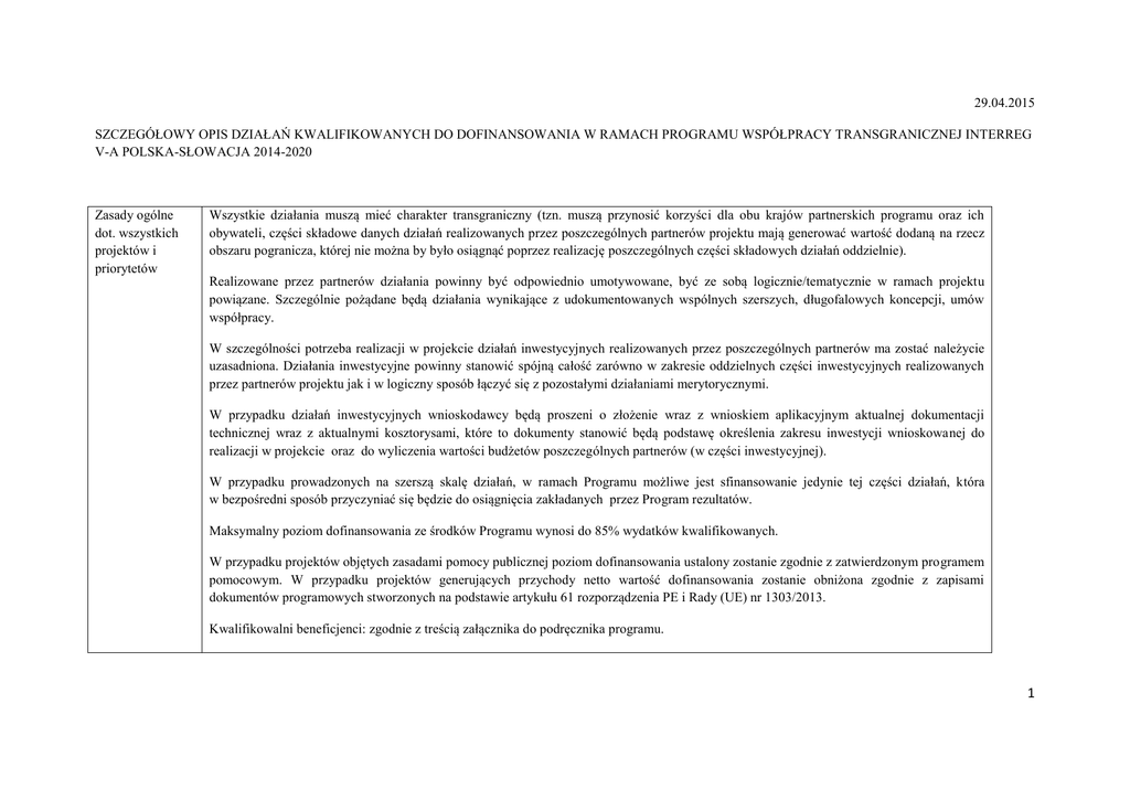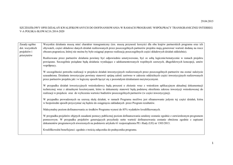29.04.2015 SZCZEGÓŁOWY OPIS DZIAŁAŃ KWALIFIKOWANYCH DO DOFINANSOWANIA W RAMACH PROGRAMU WSPÓŁPRACY TRANSGRANICZNEJ INTERREG V-A POLSKA-SŁOWACJA 2014-2020 Zasady ogólne dot. wszystkich projektów i priorytetów Wszystkie działania muszą mieć charakter transgraniczny (tzn. muszą przynosić korzyści dla obu krajów partnerskich programu oraz ich obywateli, części składowe danych działań realizowanych przez poszczególnych partnerów projektu mają generować wartość dodaną na rzecz obszaru pogranicza, której nie można by było osiągnąć poprzez realizację poszczególnych części składowych działań oddzielnie). Realizowane przez partnerów działania powinny być odpowiednio umotywowane, być ze sobą logicznie/tematycznie w ramach projektu powiązane. Szczególnie pożądane będą działania wynikające z udokumentowanych wspólnych szerszych, długofalowych koncepcji, umów współpracy. W szczególności potrzeba realizacji w projekcie działań inwestycyjnych realizowanych przez poszczególnych partnerów ma zostać należycie uzasadniona. Działania inwestycyjne powinny stanowić spójną całość zarówno w zakresie oddzielnych części inwestycyjnych realizowanych przez partnerów projektu jak i w logiczny sposób łączyć się z pozostałymi działaniami merytorycznymi. W przypadku działań inwestycyjnych wnioskodawcy będą proszeni o złożenie wraz z wnioskiem aplikacyjnym aktualnej dokumentacji technicznej wraz z aktualnymi kosztorysami, które to dokumenty stanowić będą podstawę określenia zakresu inwestycji wnioskowanej do realizacji w projekcie oraz do wyliczenia wartości budżetów poszczególnych partnerów (w części inwestycyjnej). W przypadku prowadzonych na szerszą skalę działań, w ramach Programu możliwe jest sfinansowanie jedynie tej części działań, która w bezpośredni sposób przyczyniać się będzie do osiągnięcia zakładanych przez Program rezultatów. Maksymalny poziom dofinansowania ze środków Programu wynosi do 85% wydatków kwalifikowanych. W przypadku projektów objętych zasadami pomocy publicznej poziom dofinansowania ustalony zostanie zgodnie z zatwierdzonym programem pomocowym. W przypadku projektów generujących przychody netto wartość dofinansowania zostanie obniżona zgodnie z zapisami dokumentów programowych stworzonych na podstawie artykułu 61 rozporządzenia PE i Rady (UE) nr 1303/2013. Kwalifikowalni beneficjenci: zgodnie z treścią załącznika do podręcznika programu. 1 OŚ 1 OCHRONA I ROZWÓJ DZIEDZICTWA PRZYRODNICZEGO I KULTUROWEGO OBSZARU POGRANICZA Zasady ogólne dla priorytetu dot. dziedzictwa Działania realizowane w ramach tego priorytetu inwestycyjnego ukierunkowane są na zapewnienie wspólnej ochrony, wzmocnienia i rozwoju dziedzictwa przyrodniczego i kulturowego (zarówno materialnego, jak i niematerialnego) oraz skutecznego i zrównoważonego wykorzystania dziedzictwa celem podniesienia poziomu atrakcyjności pogranicza. Najistotniejszym elementem projektów oraz działań (w tym inwestycyjnych) realizowanych w ramach niniejszego priorytetu inwestycyjnego będzie stworzenie wspólnych, trwałych produktów opartych o dziedzictwo kulturowo-przyrodnicze, przyczyniających się do jego ochrony, promocji lub rozwoju. Rezultaty projektów, utrzymają się zarówno w okresie trwałości jak i będą generowały potencjał rozwojowy w przyszłości. W przypadku projektów dotyczących produktów turystycznych, będą to produkty wspólne, polsko-słowackie, trwałe i powodujące lepsze wykorzystanie dziedzictwa kulturowo-przyrodniczego. Maksymalny okres realizacji projektów: 2 lata. Minimalna wartość dofinansowania: 200 tys. euro. W nawiązaniu do art. 3 pkt. 1 lit. e rozporządzenia Parlamentu Europejskiego i Rady (UE) nr 1301/2013, maksymalna wartość projektu realizowanego w ramach Programu nie może przekroczyć kwoty 5 milionów euro. Zasady ogólne dot. infrastruktury w priorytecie dot. dziedzictwa Działania inwestycyjne powinny prowadzić do stworzenia wspólnych, transgranicznych produktów promujących dziedzictwo kulturowe i przyrodnicze. Realizowane w ramach projektów inwestycje powinny być przeznaczone na cele publiczne. Efekty projektów zawierających inwestycje powinny również pobudzać do aktywności gospodarczej w bezpośrednim sąsiedztwie zrealizowanych projektów, ewentualnie wspierać, inicjować na małą skalę projekty o charakterze komercyjnym (w celu wywołania określonych działań prorozwojowych). W ramach uzasadnienia działań inwestycyjnych powinny być wykazane w jasny i czytelny sposób zarówno ich funkcje użytkowe jak i bezpośrednie zastosowanie w celu zachowania, promocji, ochrony oraz rozwoju wspólnego dziedzictwa kulturowego i przyrodniczego. 2 Infrastruktura rekreacyjna może być dofinansowana wyłącznie jako uzupełnienie transgranicznych szlaków, np. punkty widokowe, bądź jako zapewnienie wygodnego do nich dotarcia, np. parkingi. Ze względu na fakt, że dofinansowanie inwestycji ze środków publicznych powinno dotyczyć tych najlepszych o określonych cechach i najwyższej jakości, rekomenduje się zastosowanie przez partnerów formuły konkursów architektonicznych, architektoniczno-urbanistycznych i urbanistycznych w celu wyłonienia najlepszego projektu koncepcyjnego na realizację części inwestycyjnej projektu. Zasady ogólne dot. współpracy w priorytecie dot. dziedzictwa Nie przewiduje się finansowania działań mających na celu stworzenie lub polepszenie bazy hotelowo-gastronomicznej oraz infrastruktury, której głównym przeznaczeniem jest prowadzenie działalności gospodarczej lub społeczno-edukacyjnej nie związanej z trwałą współpracą transgraniczną np. hoteli, pensjonatów, schronisk, restauracji, zaplecza gastronomicznego, boisk, hal sportowych stanowiących część placówek oświatowych, domów kultury. W przypadku projektów współpracy między instytucjami oraz pozostałych działań mi