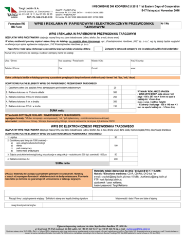 I WSCHODNIE DNI KOOPERACJI 2016 / 1st Eastern Days of Cooperation 15-17 listopada / November 2016 SWIFT: PKOPPLPW Nr konta: PL 03 1240 2470 1111 0010 3424 2280 SWIFT: WBKPPLPP Nr konta: PL 80 1090 2688 0000 0001 0728 2338 Formularz RK RK Form WPIS I REKLAMA W PAPIEROWYM I ELEKTRONICZNYM PRZEWODNIKU TARGOWYM Nr / No WPIS I REKLAMA W PAPIEROWYM PRZEWODNIKU TARGOWYM BEZPŁATNY WPIS PODSTAWOWY obejmuje: nazwę firmy oraz dane teleadresowe (adres, telefon, fax, e-mail, strona www) W miarę możliwości prosimy zapisać nazwę firmy do katalogu na zasadzie słowa kluczowego, np.: „Przedsiębiorstwo Handlowe „XYZ” sp. z o.o.”, wg tej zasady będzie wyglądać w alfabetycznym spisie wystawców następująco: „XYZ Przedsiębiorstwo Handlowe sp. z o.o.” Company’s name and company’s info in catalog should be held under letter Nazwę firmy i treść wpisu ofertowego w przewodniku targowym należy umieścić pod literą: Nazwa firmy w brzmieniu do katalogu / Exibitor’s company name for catalog: Ulica / Street: Kod pocztowy / Postal code: Miasto / City: Kraj / Country: Telefon / Phone: Fax: E-mail: www: Celem uniknięcia błędów w katalogu prosimy o przesłanie powyższych danych w formie elektronicznej - format *txt, *doc, *odt, *docx) DODATKOWE PŁATNE ELEMENTY WPISU DO PAPIEROWEGO PRZEWODNIKA TARGOWEGO 1. Dodatkowy adres (np. oddziału firmy) zamieszczony pod wpisem podstawowym 20 2. Reklama kolorowa na IV stronie okładki 500 3. Reklama kolorowa 1/2 na IV stronie okładki 250 4. Reklama kolorowa 1 str. w środku 300 5. Reklama kolorowa 1/2 str. w środku 150 WYMIARY REKLAM ZE SPADEM / SIZES WITH DROP- cała strona / full page - 105 x 297 mm + 3 mm na spad z każdej str./ +3mm drop (szer. x wys. / width x height) - 1/2 strony / half page - 105 x 148 mm + 3 mm na spad z każdej str. ./ +3mm drop SUMA netto WYMAGANIA DOTYCZĄCE REKLAMY / ADVERTISEMENT’S REQUIREMENTS: wymagane formaty: *tiff (bez kompresji / uncompressed), *cdr, *pdf (spłaszczony, czcionki zamienione na krzywe) właściwości: rozdzielczość bitmap / bitmaps downsampling 300 dpi, czcionki zamienione na krzywe, tryb kolorów CMYK WPIS DO ELEKTRONICZNEGO PRZEWODNIKA TARGOWEGO BEZPŁATNY WPIS PODSTAWOWY obejmuje: nazwę firmy oraz dane teleadresowe (adres, telefon, fax, e-mail, strona www) dane osoby reprezentującej firmę, klasyfikacja branżowa DODATKOWE PŁATNE ELEMENTY WPISU DO ELEKTRONICZNEGO PRZEWODNIKA TARGOWEGO: 1. Logotyp 2. Dodatkowy opis firmy (do 1000 znaków) – a) opis usługi/produktu/technologii b) oferta c) park maszynowy d) wolne moce produkcyjne 30 100 3. Zdjęcia produktów/technologii/usług (wizualizacja w załączniku) – rozdzielczość 300 dpi; szerokość 1000 px 50 4. Reklama kolorowa A4 200 SUMA netto UWAGA! Materiały do katalogu są projektami gotowymi i ostatecznymi. Materiały o innych niż wymagane formatach i właściwościach nie będą umieszczane. Przesłanie materiałów po terminie nie gwarantuje ich umieszczenia w katalogu targowym. Pieczęć firmy i podpis prawnie wiążący / Exhibitor’s stamp and legally binding signature Materiały należy dostarczyć do dnia / delivered till 17.10.2016: Nośniki / Electronic mediums: CD-R, CD-RW, DVD lub / or e-mail: [email protected] (max 10 MB), [email protected] FTP: host: ftp.targi.lublin.pl; użytkownik / user: reklama; hasło / password: Targi.Reklama Miejscowość i data / Place and date of signing Uwagi koordynatora targów: Zgłoszenia prosimy nadsyłać do dnia / Application deadline 17.10.2016 r. ul. Dworcowa 11 (Park Ludowy), 20-406 Lublin, tel. +48 81 458 15 47, fax +48 81 458-15-02, e-mail: [email protected] Zgodnie z ustawą z dnia 18.07.2002 r. (Dz.U. nr 144 poz.1204) o świadczeniu usług drogą elektroniczną, wyrażam zgodę na otrzymywanie informacji marketingowych od firmy Targi Lublin S.A. drogą elektroniczną na ww adres e-mail./ I hereby declare my consent to receive marketing information from Lublin Fair JSC on a/m e-mail address (according to Act on Electronic Service Providing of 18 th July 2002 published in Journal of Laws no 144 item 1204)