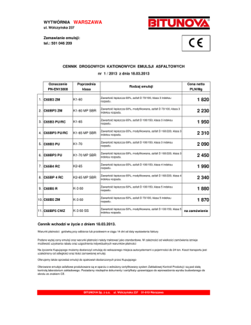 WYTWÓRNIA WARSZAWA ul. Wólczyńska 237 Zamawianie emulsji: tel.: 501 046 209 CENNIK DROGOWYCH KATIONOWYCH EMULSJI ASFALTOWYCH nr 1 / 2013 z dnia 18.03.2013 Oznaczenie Poprzednia PN-EN13808 klasa Rodzaj emulsji Cena netto PLN/Mg 1. C60B3 ZM K1-60 Zawartość lepiszcza 60%, asfalt D 70/100, klasa 3 indeksu rozpadu. 1 820 2. C60BP3 ZM K1-60 MP SBR Zawartość lepiszcza 60%, modyfikowana, asfalt D 70/100, klasa 3 indeksu rozpadu. 2 230 3. C65B3 PU/RC K1-65 Zawartość lepiszcza 65%, asfalt D 100/150, klasa 3 indeksu rozpadu. 1 950 4. C65BP3 PU/RC K1-65 MP SBR Zawartość lepiszcza 65%, modyfikowana, asfalt D 160/220, klasa 3 indeksu rozpadu. 2 310 5. C69B3 PU K1-70 Zawartość lepiszcza 69%, asfalt D 100/150, klasa 3 indeksu rozpadu. 2 090 6. C69BP3 PU K1-70 MP SBR Zawartość lepiszcza 69%, modyfikowana, asfalt D 160/220, klasa 3 indeksu rozpadu. 2 450 7. C65B4 RC K2-65 Zawartość lepiszcza 65%, asfalt D 100/150, klasa 4 indeksu rozpadu. 1 990 8. C65BP 4 RC K2-65 MP SBR Zawartość lepiszcza 65%, modyfikowana, asfalt D 160/220, klasa 4 indeksu rozpadu. 2 340 9. C60B5 R K-3 60 Zawartość lepiszcza 60%, asfalt D 100/150, klasa 5 indeksu rozpadu. 1 880 10. C60B5 ZM K-3 60 Zawartość lepiszcza 60%, asfalt D 70/100, klasa 5 indeksu rozpadu. 1 870 11. C60BP5 CWZ K-3 60 SS Zawartość lepiszcza 60%, modyfikowana, asfalt D 100/150, klasa 5 indeksu rozpadu. na zamówienie Cennik wchodzi w życie z dniem 18.03.2013. Warunki płatności: gotówką przy odbiorze lub przelewem w ciągu 14 dni od daty wystawienia faktury Podane wyżej ceny emulsji oraz warunki płatności należy traktować jako standardowe. W zależności od wielkości zamówienia istnieje możliwość uzyskania rabatu oraz uzgodnienia indywidualnych warunków płatności Na życzenie Kupującego możemy dostarczyć emulsję do wskazanego miejsca autocysternami o pojemności do 24 ton. Koszt transportu jest uzależniony od odległości oraz ilości zamawianej emulsji. Oferujemy także sprzedaż emulsji do opakowań dostarczonych przez Kupującego Oferowane emulsje asfaltowe produkowane są w oparciu o wdrożony certyfikowany system Zakładowej Kontroli Produkcji i są pod stałą kontrolą laboratorium zakładowego. Posiadamy niezbędne dokumenty i certyfikaty uprawniające do wprowadzenia wyrobu budowlanego do obrotu ze znakiem CE. BITUNOVA Sp. z o.o. ul. Wólczyńska 237 01-919 Warszawa