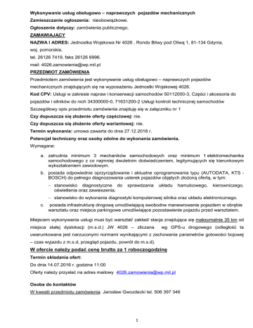 Wykonywanie usług obsługowo – naprawczych pojazdów mechanicznych Zamieszczanie ogłoszenia: nieobowiązkowe. Ogłoszenie dotyczy: zamówienia publicznego. ZAMAWIAJĄCY NAZWA I ADRES: Jednostka Wojskowa Nr 4026 , Rondo Bitwy pod Oliwą 1, 81-134 Gdynia, woj. pomorskie, tel. 26126 7419, faks 26126 6996. mail: [email protected] PRZEDMIOT ZAMÓWIENIA Przedmiotem zamówienia jest wykonywanie usług obsługowo – naprawczych pojazdów mechanicznych znajdujących się na wyposażeniu Jednostki Wojskowej 4026. Kod CPV: Usługi w zakresie napraw i konserwacji samochodów 50112000-3, Części i akcesoria do pojazdów i silników do nich 34300000-0, 71631200-2 Usługi kontroli technicznej samochodów Szczegółowy opis przedmiotu zamówienia znajduję się w załączniku nr 1 Czy dopuszcza się złożenie oferty częściowej: nie. Czy dopuszcza się złożenie oferty wariantowej: nie. Termin wykonania: umowa zawarta do dnia 27.12.2016 r. Potencjał techniczny oraz osoby zdolne do wykonania zamówienia. Wymagane: a. zatrudnia minimum 3 mechaników samochodowych oraz minimum 1 elektromechanika samochodowego z co najmniej dwuletnim doświadczeniem, legitymujących się kierunkowym wykształceniem zawodowym. b. posiada odpowiednie oprzyrządowanie i aktualne oprogramowania typu (AUTODATA, KTS BOSCH) do pełnego diagnozowania usterek pojazdów objętych złożoną ofertą, w tym: stanowisko diagnostyczne do oświetlenia oraz zawieszenia, sprawdzania układu hamulcowego, kierowniczego, stanowisko do wykonania diagnostyki komputerowej silnika oraz układu elektronicznego. c. posiada infrastrukturę drogową umożliwiającą swobodne manewrowanie pojazdem w obrębie warsztatu oraz miejsca parkingowe umożliwiające pozostawienie pojazdu przed warsztatem. Miejscem wykonywania usługi musi być warsztat/ zakład/ stacja znajdująca się maksymalnie 35 km od miejsca stałej dyslokacji (m.s.d.) JW 4026 – zliczana wg GPS-u drogowego (odległość ta uwarunkowana jest narzuconymi normami wynikającymi z zachowania parametrów gotowości bojowej – czas wyjazdu z m.s.d, przegląd pojazdu, powrót do m.s.d). W ofercie należy podać cenę brutto za 1 roboczogodzinę Termin składania ofert: Do dnia 14.07.2016 r. godzina 11:00 Oferty należy przysłać na adres mailowy [email protected] Osoba do kontaktów W kwestii przedmiotu zamówienia: Jarosław Gwozdecki tel. 506 397 346 1 Załącznik nr 1 OPIS PRZEDMIOTU ZAMÓWIENIA Przedmiotem zamówienia jest wykonywanie usług obsługowo – naprawczych mechanicznych znajdujących się na wyposażeniu Jednostki Wojskowej 4026 w Gdyni. pojazdów Z przedmiotu zamówienia wyłączone są: a) naprawy oraz przeglądy techniczne pojazdów będących na gwarancji producenta (nie dotyczy to wykonawcy posiadającego autoryzację producenta naprawianego samochodu). Naprawa i czynności obsługowe pojazdów i podzespołów samochodów ciężarowych: – Star 266 M - 6 szt – Star 266 M2 – 2 szt. – Mercedes UNIMOG – 2 szt. – Jelcz S862 D.43 z systemem multilift mk IV, 4 szt. – Volvo FM12 6XR - podwozie kontenerowe, 1 szt. – autobusy MAN R08 – 2 szt. 1. Kompleksowa naprawa obejmuje: a) naprawy bieżące elementów mechanicznych; b) naprawy bieżące instalacji elektrycznej; c) naprawy blacharskie i lakiernicze; d) wykonywanie niezbędnych dodatkowych napraw, przeglądów oraz regulacji wszystkich układów pojazdów przywracających pojazd do pełnej sprawności technicznej; W zakres przedmiotowych napraw nie wchodzi wymiana akumulatorów i ogumienia, Istnieje możliwość dostarczenia przez zamawiającego własnych płynów eksploatacyjnych przeznaczonych do czynności obsługowych danego pojazdu. 2. Wykonawca zobowiązany będzie do: a) na żądanie Zamawiającego - bezpłatne przetransportowanie niesprawnego pojazdu z miejsca awarii (miasta Gdynia) do stacji obsługi Wykonawcy; b) udzielenia minimum 12 miesięcznej gwarancji na wykonane naprawy oraz na zamontowane części zamienne, c) wykonywania obsługi technicznych zgodnie z wymogami i zaleceniami producentów dla każdej marki i typu pojazdu (zgodnie z książkami przeglądów technicznych pojazdów) na podstawie zlecenia Zamawiającego, d) wykonywania napraw i obsługi sprzętem, narzędziami, przy użyciu części zamiennych i materiałów eksploatacyjnych zalecanych i dopuszczonych przez producentów dla danej marki i typu pojazdu, e) uzgodnienia z Zamawiającym kosztu i wykonania dodatkowych czynności naprawczych ujawnionych podczas realizacji naprawy, które nie zostały wyszczególnione w zleceniu. 1. Warunki realizacji napraw: 2 a) części zamienne i materiały użyte w naprawach muszą być nowe i powinny odpowiadać parametrom technicznym zalecanym przez producentów poszczególnych pojazdów oraz spełniać normy jakościowe w tym zakresie. O wyborze podzespołów, części zamiennych oryginalnych lub ich zamienników decyduje Zamawiający. b) Zamawiający dostarczy samochód pod wskazany adres Wykonawcy, c) przed wykonaniem usługi Wykonawca uzgodni z Zamawiającym jej zakres, przedstawi kosztorys oraz ustali termin wykonania, a po jego akceptacji przez Zamawiającego przystąpi do naprawy, d) naprawa zostanie wykonana w terminie 48 godzin licząc od dnia akceptacji kosztorysu naprawy samochodu przez Zamawiającego. e) Wykonawca zapewni jednoczesną naprawę trzech pojazdów w każdej z grup, jednakże z zachowaniem terminów wykonania naprawy. f) Przy odbiorze pojazdu sporządza się protokół odbioru podpisany przez Wykonawcę i Zamawiającego. W protokole zostaną precyzyjnie wymienione operacje technologiczne i użyte części zamienne oraz wymienione części, które Wykonawca zwrócił Zamawiającemu. 2. Warunki realizacji przeglądów technicznych: a) przeglądy techniczne obejmują wykonanie czynności, odpowiednich dla danego przebiegu kilometrów lub okresu użytkowana, które zostały określone i opracowane przez producentów poszczególnych pojazdów z uwzględnieniem niezbędn