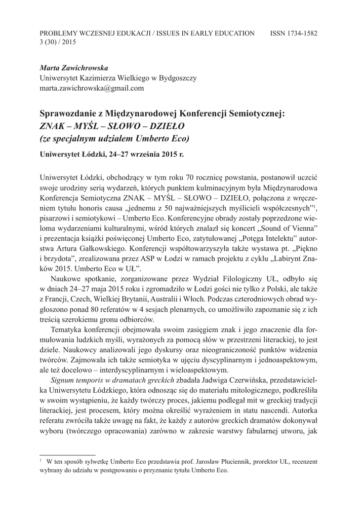 PROBLEMY WCZESNEJ EDUKACJI / ISSUES IN EARLY EDUCATION 3 (30) / 2015 ISSN 1734-1582 Marta Zawichrowska Uniwersytet Kazimierza Wielkiego w Bydgoszczy [email protected] Sprawozdanie z Międzynarodowej Konferencji Semiotycznej: ZNAK – MYŚL – SŁOWO – DZIEŁO (ze specjalnym udziałem Umberto Eco) Uniwersytet Łódzki, 24–27 września 2015 r. Uniwersytet Łódzki, obchodzący w tym roku 70 rocznicę powstania, postanowił uczcić swoje urodziny serią wydarzeń, których punktem kulminacyjnym była Międzynarodowa Konferencja Semiotyczna ZNAK – MYŚL – SŁOWO – DZIEŁO, połączona z wręczeniem tytułu honoris causa „jednemu z 50 najważniejszych myślicieli współczesnych”1, pisarzowi i semiotykowi – Umberto Eco. Konferencyjne obrady zostały poprzedzone wieloma wydarzeniami kulturalnymi, wśród których znalazł się koncert „Sound of Vienna” i prezentacja książki poświęconej Umberto Eco, zatytułowanej „Potęga Intelektu” autorstwa Artura Gałkowskiego. Konferencji współtowarzyszyła także wystawa pt. „Piękno i brzydota”, zrealizowana przez ASP w Łodzi w ramach projektu z cyklu „Labirynt Znaków 2015. Umberto Eco w UŁ”. Naukowe spotkanie, zorganizowane przez Wydział Filologiczny UŁ, odbyło się w dniach 24–27 maja 2015 roku i zgromadziło w Łodzi gości nie tylko z Polski, ale także z Francji, Czech, Wielkiej Brytanii, Australii i Włoch. Podczas czterodniowych obrad wygłoszono ponad 80 referatów w 4 sesjach plenarnych, co umożliwiło zapoznanie się z ich treścią szerokiemu gronu odbiorców. Tematyka konferencji obejmowała swoim zasięgiem znak i jego znaczenie dla formułowania ludzkich myśli, wyrażonych za pomocą słów w przestrzeni literackiej, to jest dziele. Naukowcy analizowali jego dyskursy oraz nieograniczoność punktów widzenia twórców. Zajmowała ich także semiotyka w ujęciu dyscyplinarnym i jednoaspektowym, ale też docelowo – interdyscyplinarnym i wieloaspektowym. Signum temporis w dramatach greckich zbadała Jadwiga Czerwińska, przedstawicielka Uniwersytetu Łódzkiego, która odnosząc się do materiału mitologicznego, podkreśliła w swoim wystąpieniu, że każdy twórczy proces, jakiemu podlegał mit w greckiej tradycji literackiej, jest procesem, który można określić wyrażeniem in statu nascendi. Autorka referatu zwróciła także uwagę na fakt, że każdy z autorów greckich dramatów dokonywał wyboru (twórczego opracowania) zarówno w zakresie warstwy fabularnej utworu, jak W ten sposób sylwetkę Umberto Eco przedstawia prof. Jarosław Płuciennik, prorektor UŁ, recenzent wybrany do udziału w postępowaniu o przyznanie tytułu Umberto Eco. 1 Sprawozdanie z Międzynarodowej Konferencji Semiotycznej… 139 i stosowanych środków poetyckich. Wybór ten był podyktowany ideą sztuki, którą poeta miał do przekazania. Z kolei procesualność podmiotu literackiego, tj. jego dynamiczność, permanentną niegotowość pozostawania na poziomie tego, co „wydarzane”, a nie tego, co „dokonane”, w sferze dyseminacyjnej gry powtarzania i różnicowania siebie, została omówiona przez redaktora naczelnego czasopisma „Inter-. Literatura-Krytyka-Kultura”, Tomasz Dalasińskiego, w referacie zatytułowanym Podmiot jako znak in progress. O literackim „ja” procesualnym (dwa spojrzenia). W swoim wystąpieniu dokonał analizy koncepcji Michela Foucaulta i Julii Kristevej, w wyniku której uznał, że podmiot procesualny to nieciągły przedmiot praktyki dyskursywnej. Aleksander Gemel, kolejny przedstawiciel Uniwersytetu Łódzkiego, zaprezentował w swoim referacie mechanizm genezy konwencji znaczeniowych w semiotyce Eco – kognitywny model gier sygnalizacyjnych. Autor zaproponował rozszerzenie teorii Skyrmsa o kognitywne komponenty zaczerpnięte z teorii przestrzeni mentalnych, umożliwiając tym samym usunięcie z jego koncepcji wszelkich znamion referencyjności. Przyczynia się to do rozszerzenia modelu gier sygnalizacyjnych i jego pełnej zgodności z intra-lingwistyczną teorią semantyki Eco. Z kolei Dorota Jewdokimow, reprezentująca Uniwersytet im. Adama Mickiewicza w Poznaniu, podjęła refleksję nad wstydem jako mechanizmem kultury. Autorka referatu analizowała go zarówno na płaszczyźnie leksykalnej, jak i semantycznej, prezentując tym samym szeroki wachlarz pojęć mu pokrewnych, tworzących złożoną i dynamiczną sieć znaczeń. Tekstami kultury, które prelegentka poddała analizie były dzieła filmowe Ostatnie tango w Paryżu oraz Wstyd. Wykład na temat Ciało jako znak w przestrzeni tekstu wygłosiła Kamila Junik-Łuniewska z Uniwersytetu Śląskiego. Referentka w trakcie swojego wystąpienia podjęła rozważania tożsamościowe wokół Błękitu Tedźi Grower, którego narracja koncentruje się na poszukiwaniu własnej tożsamości przez autorkę/narratorkę. W odniesieniu do wybranych fragmentów utworu badaczka przeprowadziła analizę ciała (cielesności) obecnego w tekście, w akcie pisania, który jest równocześnie procesem stwarzania tożsamości. W swoich refleksjach autorka odnosiła się do indyjskiej idei słowa, które poprzez nazywanie stwarza przedmiot, nawiązywała też do koncepcji corpusu J.-L. Nancy’ego. Wystąpienie Armina Kapusta, przedstawiciela Uniwersytetu Łódzkiego, dotyczyło Semiotyki miasta wielokulturowego w ujęciu geograficznym, na przykładzie Suboticy położonej w Wojwodinie, w Serbii, której wielokulturowość wyrażana jest poprzez koegzystencję licznych narodów (Serbowie, Węgrzy, Chorwaci, Buniewcy, Jugosłowianie i inni), języków, wyznań (m.in. katolicyzm, prawosławie, protestantyzm, judaizm, islam). Autor poddał analizie wybrane znaki związane z poszczególnymi narodami, w tym pomniki oraz nazwy ulic i placów, rozważając ich liczbę i lokalizację współczesną i w wybranych okresach w XX wieku. Anna Kapuścińska z Uniwersytetu Kazimierza Wielkiego w Bydgoszczy, w swoim referacie zatytułowanym O