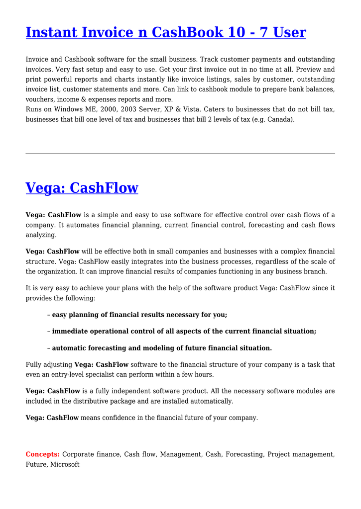 Instant Invoice n CashBook 10 - 7 User Invoice and Cashbook software for the small business. Track customer payments and outstanding invoices. Very fast setup and easy to use. Get your first invoice out in no time at all. Preview and print powerful reports and charts instantly like invoice listings, sales by customer, outstanding invoice list, customer statements and more. Can link to cashbook module to prepare bank balances, vouchers, income & expenses reports and more. Runs on Windows ME, 2000, 2003 Server, XP & Vista. Caters to businesses that do not bill tax, businesses that bill one level of tax and businesses that bill 2 levels of tax (e.g. Canada). Vega: CashFlow Vega: CashFlow is a simple and easy to use software for effective control over cash flows of a company. It automates financial planning, current financial control, forecasting and cash flows analyzing. Vega: CashFlow will be effective both in small companies and businesses with a complex financial structure. Vega: CashFlow easily integrates into the business processes, regardless of the scale of the organization. It can improve financial results of companies functioning in any business branch. It is very easy to achieve your plans with the help of the software product Vega: CashFlow since it provides the following: – easy planning of financial results necessary for you; – immediate operational control of all aspects of the current financial situation; – automatic forecasting and modeling of future financial situation. Fully adjusting Vega: CashFlow software to the financial structure of your company is a task that even an entry-level specialist can perform within a few hours. Vega: CashFlow is a fully independent software product. All the necessary software modules are included in the distributive package and are installed automatically. Vega: CashFlow means confidence in the financial future of your company. Concepts: Corporate finance, Cash flow, Management, Cash, Forecasting, Project management, Future, Microsoft Categories: ■ ■ ■ /technology and computing/software /business and industrial /finance/personal finance/financial planning Tags: software product Vega, cash flows analyzing. , current financial control, complex financial structure, current financial situation, future financial situation, CashFlow, necessary software modules, immediate operational control, financial results, industrial/finance/personal finance/financial planning, fully independent software, CashFlow software, automatic forecasting, effective control, distributive package, small companies, entry-level specialist, business branch, Corporate finance, financial future, easy planning, Project management, company, CashFlow  Daily Cash Flow The Daily Cash Flow application allows planning and controlling company daily cash flow opeations. The application is implemented using Microsoft Excel and Microsoft SQL Server. The application includes source codes and can be customized and extended easily. Twitter Cash Full Version Twitter Cash ShareCash-Clone-Script ID: 3114352 Over the last weeks I’ve received a lot of questions from my friends and business partners. A few ofthem will be outlined in this article. Cash Receipt Full Version Cash Receipt Das Bloggingcashsystem Das Bloggingcashsystem GA-Cashformel Kunden und Umsatz mit Google AdWords eBook Ga-Cashformel Projekt +Cash PATools Cash Book & Auto Bank Rec Use this workbook for your cash book and allow PATools to prepare your bank reconciliation at the press of a button! Make sure you read the enclosed PAT Cash Book & Auto Bank Rec READ ME.txt file before trying this out. BloggingCashSystem eBook EasyCash for Resellers . add up to 1764 items . easy to use . calculate backmoney . change prices manually . give discounts . save sales on saletype . archive selling . quick sale by favorites . define own VAT . itemjournal with exports . daily accounting . daily saving of database . printer with 80 mm paper . work with customerdisplays . add itempictures . integrated help . use barcodescanners and much more. Use it for Shops like textilshops, handyshops,businessshops, foodshops and so on. After Payment you get the key by email to use the software unlimited. Instant Invoice n CashBook 10 - 3 User Invoice and Cashbook software for the small business. Track customer payments and outstanding invoices. Very fast setup and easy to use. Get your first invoice out in no time at all. Preview and print powerful reports and charts instantly like invoice listings, sales by customer, outstanding invoice list, customer statements and more. Can link to cashbook module to prepare bank balances, vouchers, income & expenses reports and more. Runs on Windows ME, 2000, 2003 Server, XP & Vista. Caters to businesses that do not bill tax, businesses that bill one level of tax and businesses that bill 2 levels of tax (e.g. Canada). Instant Invoice n CashBook 10 - 1 User Invoice and Cashbook software for the small business. Track customer payments and outstanding invoices. Very fast setup and easy to use. Get your first invoice out in no time at all. Preview and print powerful reports and charts instantly like invoice listings, sales by customer, outstanding invoice list, customer statements and more. Can link to cashbook module to prepare bank balances, vouchers, income & expenses reports and more. Runs on Windows ME, 2000, 2003 Server, XP & Vista. Caters to businesses that do not bill tax, businesses that bill one level of tax and businesses that bill 2 levels of tax (e.g. Canada). Instant CashBook 10 - 1 User Cashbook software for the small business. Enter daily receipt and payment transactions. Prepare financial reports like bank balances, vouchers and Income and expenses reports and more. Very fast setup and easy to use. Runs on Windows ME, 2000, 2003 Server, XP & Vista. Caters to businesses that do not bill tax, businesses that bill one level of tax and businesses that bill 2 levels of tax (e.g. Canada). Faktura.C