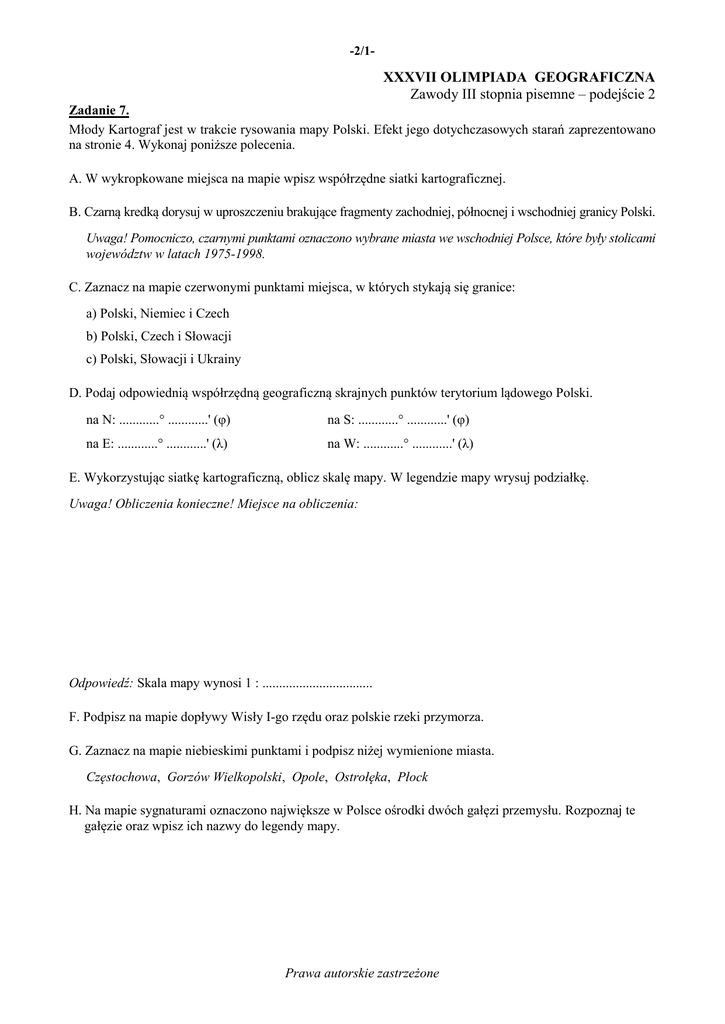 -2/1- XXXVII OLIMPIADA GEOGRAFICZNA Zawody III stopnia pisemne – podejście 2 Zadanie 7. Młody Kartograf jest w trakcie rysowania mapy Polski. Efekt jego dotychczasowych starań zaprezentowano na stronie 4. Wykonaj poniższe polecenia. A. W wykropkowane miejsca na mapie wpisz współrzędne siatki kartograficznej. B. Czarną kredką dorysuj w uproszczeniu brakujące fragmenty zachodniej, północnej i wschodniej granicy Polski. Uwaga! Pomocniczo, czarnymi punktami oznaczono wybrane miasta we wschodniej Polsce, które były stolicami województw w latach 1975-1998. C. Zaznacz na mapie czerwonymi punktami miejsca, w których stykają się granice: a) Polski, Niemiec i Czech b) Polski, Czech i Słowacji c) Polski, Słowacji i Ukrainy D. Podaj odpowiednią współrzędną geograficzną skrajnych punktów terytorium lądowego Polski. na N: ............ ............' (φ) na S: ............ ............' (φ) na E: ............ ............' (λ) na W: ............ ............' (λ) E. Wykorzystując siatkę kartograficzną, oblicz skalę mapy. W legendzie mapy wrysuj podziałkę. Uwaga! Obliczenia konieczne! Miejsce na obliczenia: Odpowiedź: Skala mapy wynosi 1 : ................................. F. Podpisz na mapie dopływy Wisły I-go rzędu oraz polskie rzeki przymorza. G. Zaznacz na mapie niebieskimi punktami i podpisz niżej wymienione miasta. Częstochowa, Gorzów Wielkopolski, Opole, Ostrołęka, Płock H. Na mapie sygnaturami oznaczono największe w Polsce ośrodki dwóch gałęzi przemysłu. Rozpoznaj te gałęzie oraz wpisz ich nazwy do legendy mapy. Prawa autorskie zastrzeżone -2/2- Zadanie 8. A. Podaj literę, którą oznaczono wykres przedstawiający wielkość wydobycia rudy miedzi w Polsce. Litera: .............................. B. Podaj nazwę okręgu przemysłowego w Polsce, w którym wydobywana i przetwarzana jest ruda miedzi. nazwa okręgu: ................................................................................................................................... C. Podaj nazwę województwa, w którym znajduje się ten okręg przemysłowy. nazwa województwa: ........................................................................................................................ D. Podaj nazwę polskiego przedsiębiorstwa wydobywającego i przetwarzającego rudę miedzi. nazwa przedsiębiorstwa: ................................................................................................................... E. Poza miedzią elektrolityczną przedsiębiorstwo to jest także czołowym dostawcą na rynki światowe następującego metalu (podkreśl poprawną odpowiedź): arsen rodzimy, cyna sproszkowana, cynk elektrolityczny, rtęć metaliczna, srebro rafinowane Prawa autorskie zastrzeżone -2/3- Zadanie 9. A. Podaj nazwę województw, przez które przebiega linia kolejowa LHS. Uwaga! Za udzielenie złych odpowiedzi będą przyznawane punkty ujemne. województwa: ................................................................................................................................................. ................................................................................................................................................. ................................................................................................................................................. B. Spośród wymienionych cech podkreśl te, które odnoszą się do linii kolejowej LHS. Uwaga! Za udzielenie złych odpowiedzi będą przyznawane punkty ujemne. a) najdłuższa wąskotorowa linia kolejowa w Polsce b) najdłuższa szerokotorowa linia kolejowa w Polsce c) obecnie wykorzystywana głównie do krajowego przewozu osób i towarów d) oddana do użytku przed 1970 r. C. Podaj dwie przyczyny budowy linii kolejowej LHS. przyczyna 1: .................................................................................................................................................... .................................................................................................................................................... .................................................................................................................................................... .................................................................................................................................................... przyczyna 2: .................................................................................................................................................... .................................................................................................................................................... .................................................................................................................................................... .................................................................................................................................................... Prawa autorskie zastrzeżone -2/4- Prawa autorskie zastrzeżone