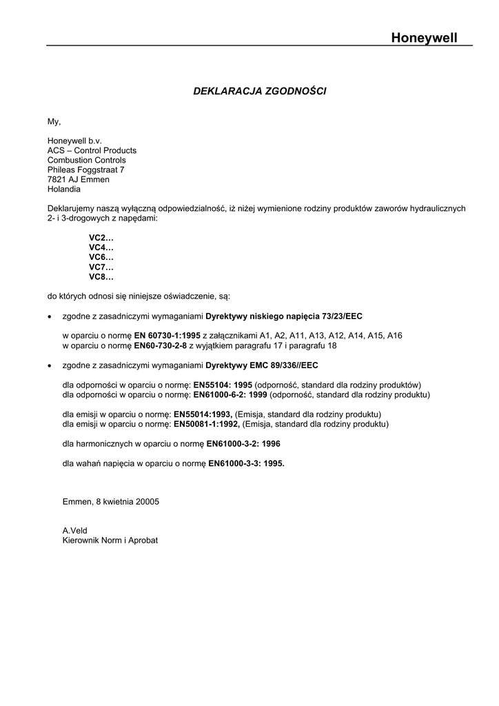 Honeywell DEKLARACJA ZGODNOŚCI My, Honeywell b.v. ACS – Control Products Combustion Controls Phileas Foggstraat 7 7821 AJ Emmen Holandia Deklarujemy naszą wyłączną odpowiedzialność, iż niżej wymienione rodziny produktów zaworów hydraulicznych 2- i 3-drogowych z napędami: VC2… VC4… VC6… VC7… VC8… do których odnosi się niniejsze oświadczenie, są: zgodne z zasadniczymi wymaganiami Dyrektywy niskiego napięcia 73/23/EEC w oparciu o normę EN 60730-1:1995 z załącznikami A1, A2, A11, A13, A12, A14, A15, A16 w oparciu o normę EN60-730-2-8 z wyjątkiem paragrafu 17 i paragrafu 18 zgodne z zasadniczymi wymaganiami Dyrektywy EMC 89/336//EEC dla odporności w oparciu o normę: EN55104: 1995 (odporność, standard dla rodziny produktów) dla odporności w oparciu o normę: EN61000-6-2: 1999 (odporność, standard dla rodziny produktu) dla emisji w oparciu o normę: EN55014:1993, (Emisja, standard dla rodziny produktu) dla emisji w oparciu o normę: EN50081-1:1992, (Emisja, standard dla rodziny produktu) dla harmonicznych w oparciu o normę EN61000-3-2: 1996 dla wahań napięcia w oparciu o normę EN61000-3-3: 1995. Emmen, 8 kwietnia 20005 A.Veld Kierownik Norm i Aprobat
